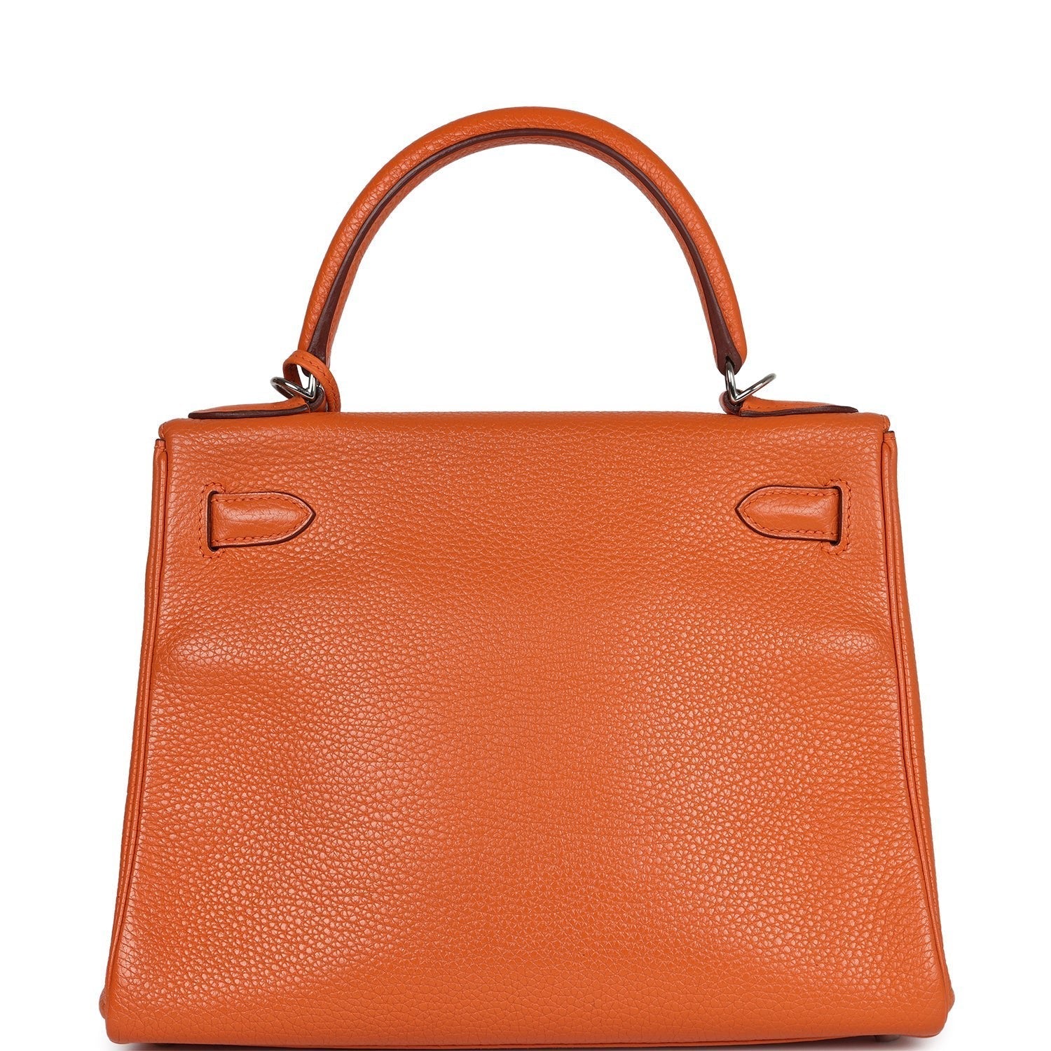 Kelly, in the Retourne style, is in Orange togo leather with palladium hardware, featuring tonal stitching, front flap with two straps, front toggle closure, clochette with lock and two keys, single rolled handle and removable strap.