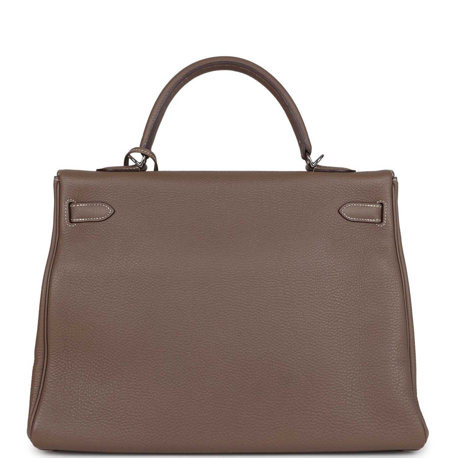 Hermes Kelly, in the Retourne style, is in Etoupe togo leather with palladium hardware, contrast stitching front toggle closure, clochette with lock and two keys, single rolled handle and removable strap.