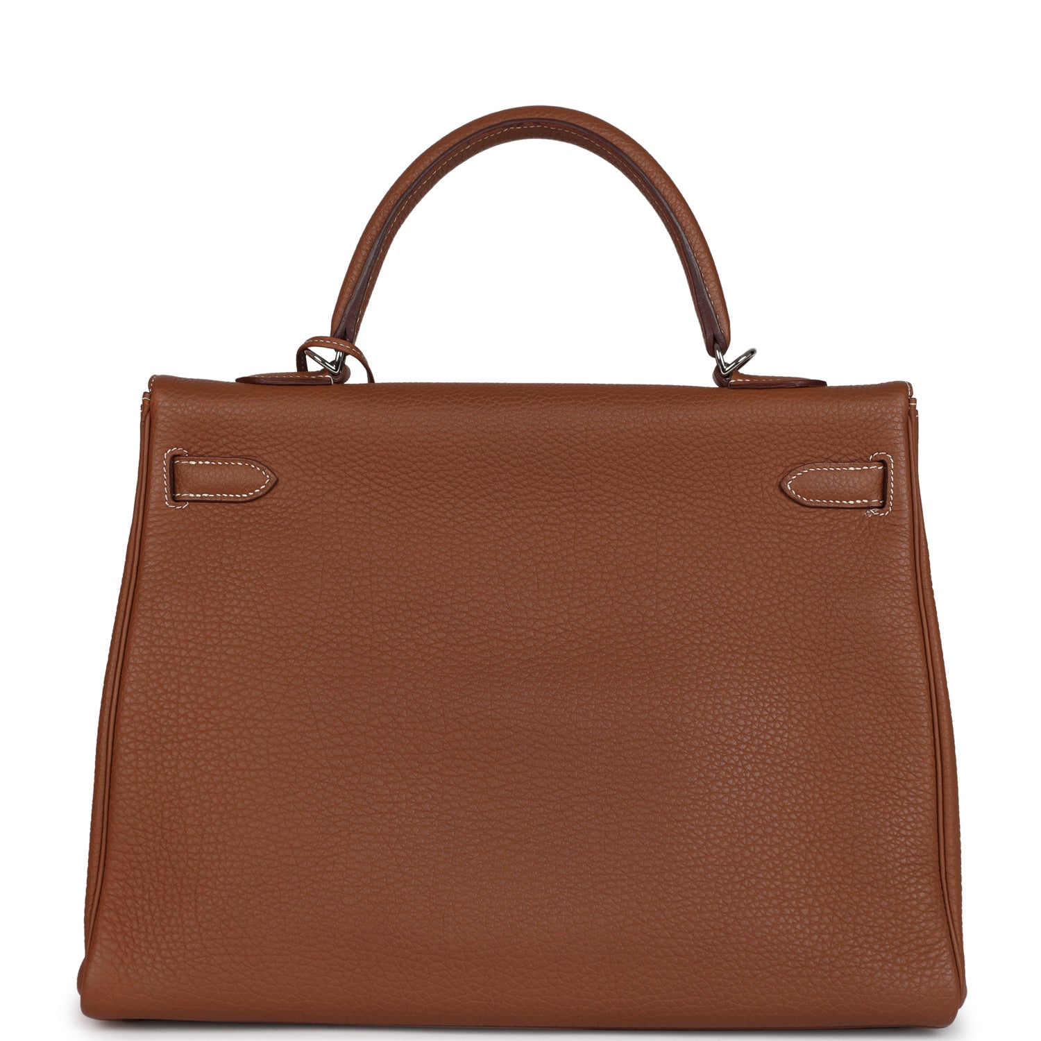 Hermes Kelly, in the Retourne style, is in Gold togo leather with palladium hardware, contrast stitching front toggle closure, clochette with lock and two keys, single rolled handle and removable strap.