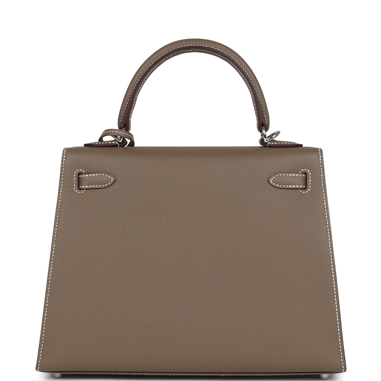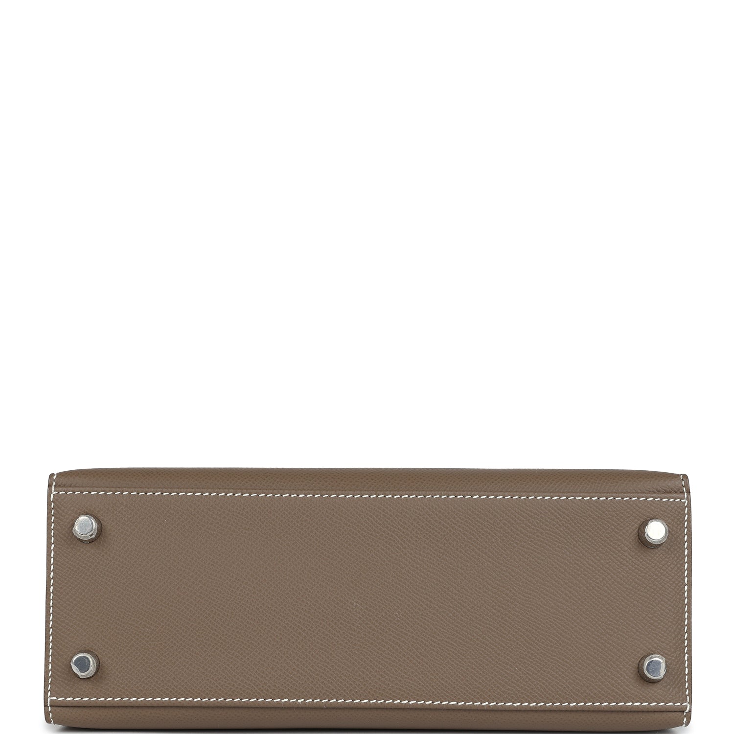 Kelly, in the Sellier style, is in Etoupe epsom leather with palladium hardware and has contrast stitching, two straps with front toggle closure, clochette with lock and two keys, single rolled handle and removable shoulder strap.