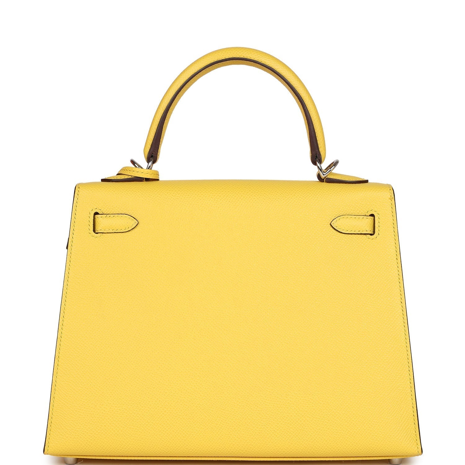 Kelly, in the Sellier style, is in Jaune De Naples epsom leather with palladium hardware and has tonal stitching, two straps with front toggle closure, clochette with lock and two keys, single rolled handle and removable shoulder strap.