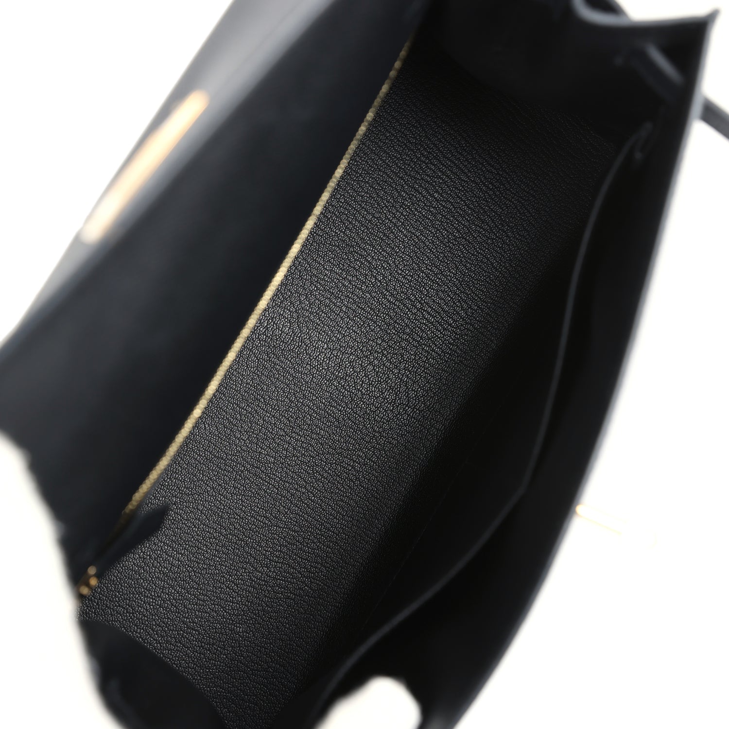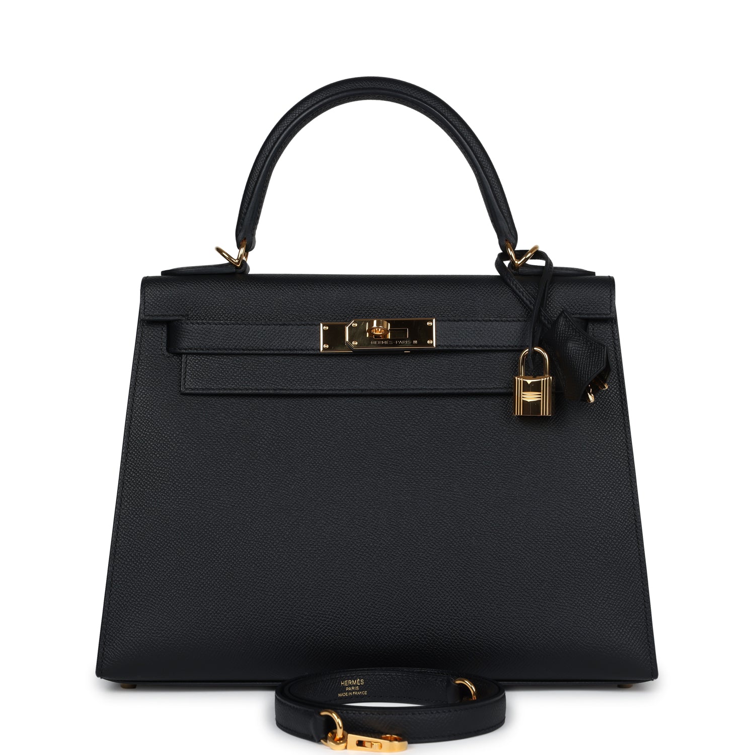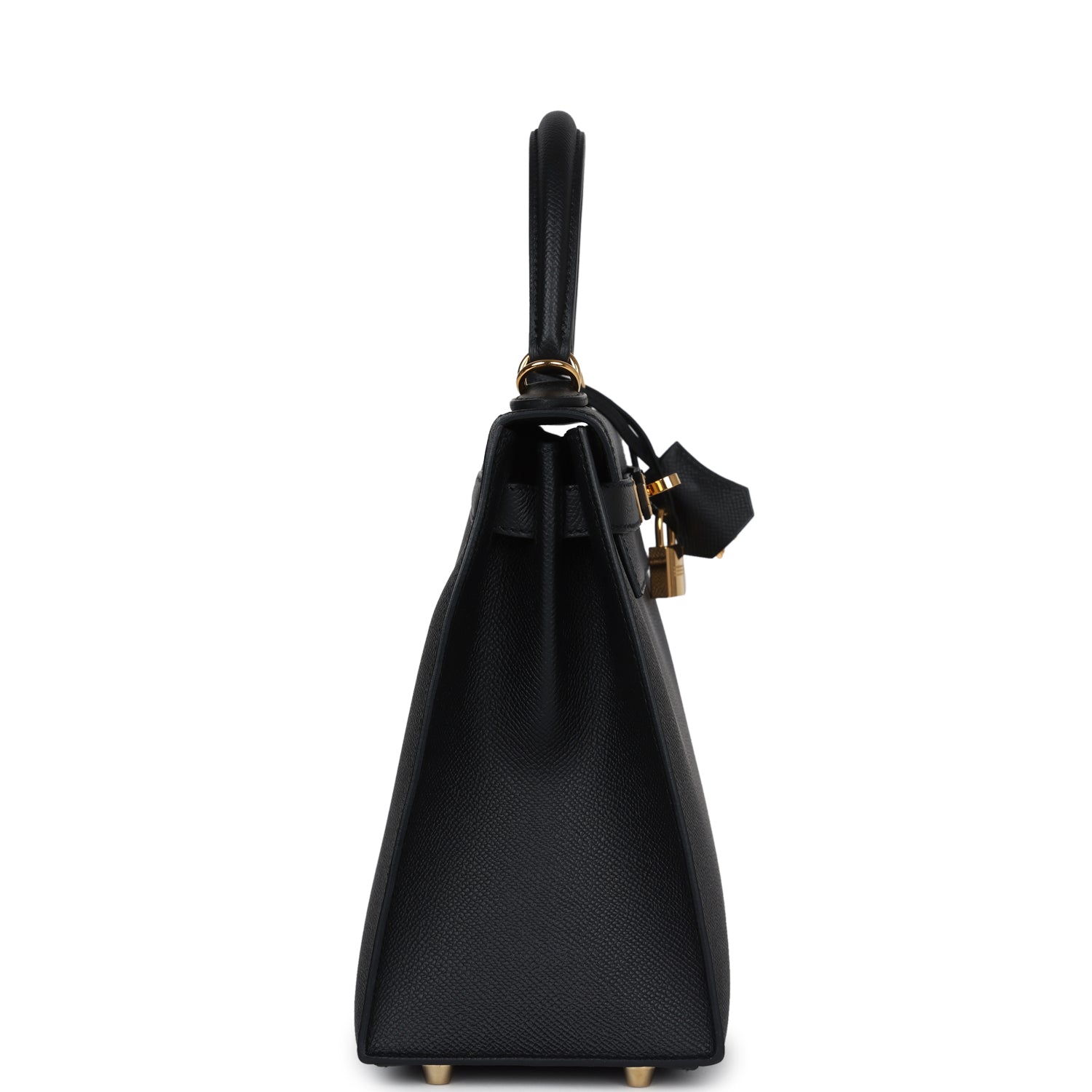 This Kelly Sellier is in Black epsom leather with gold hardware and has tonal stitching, a front toggle closure, a clochette with lock and two keys, a single rolled handle and an optional shoulder strap.