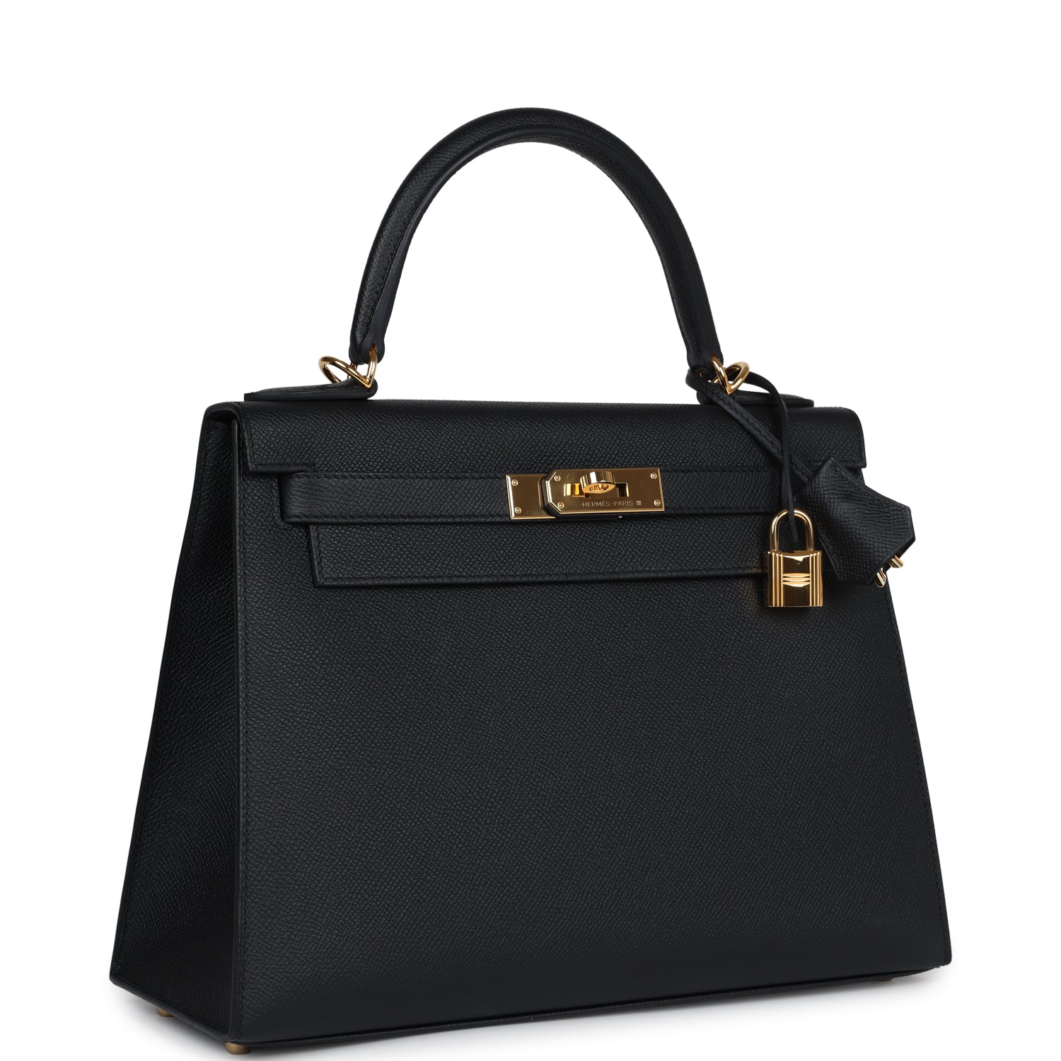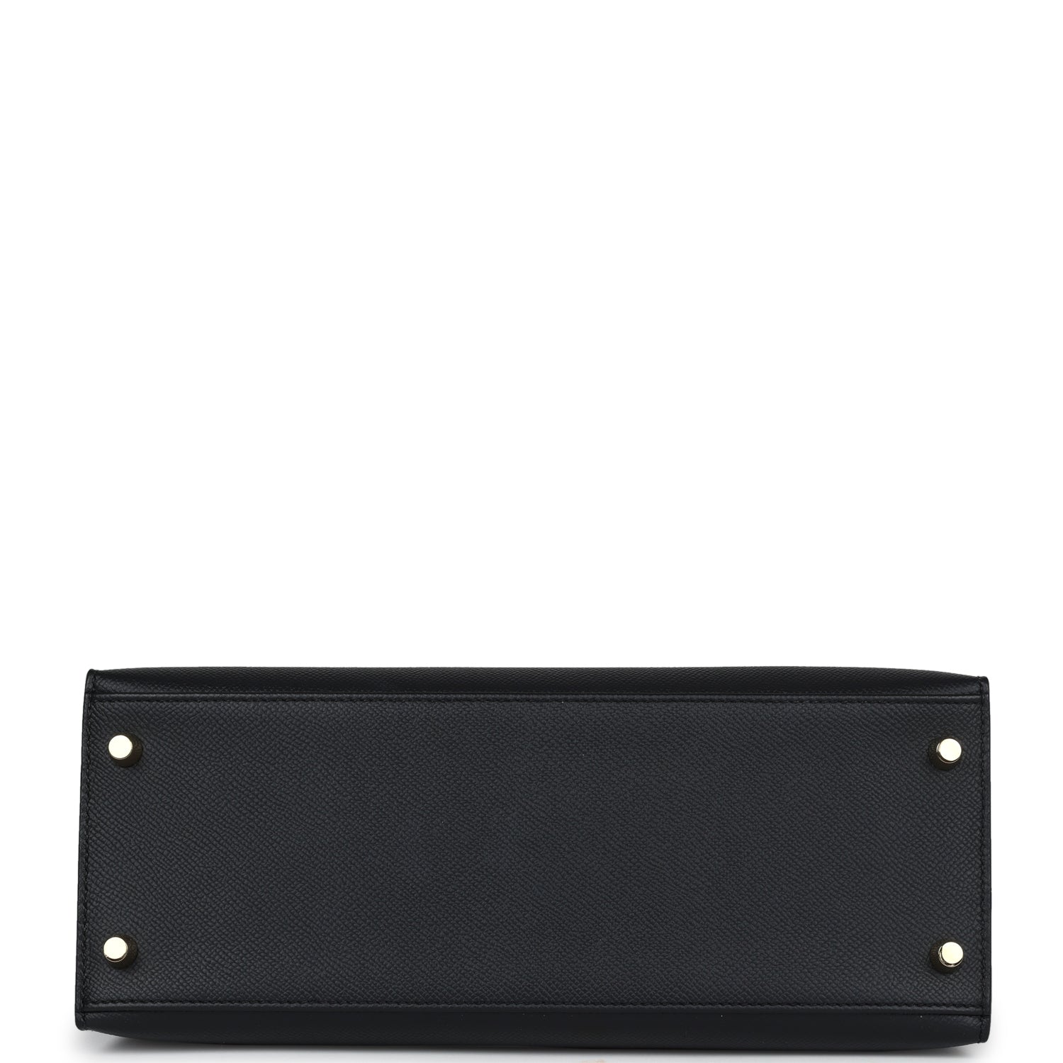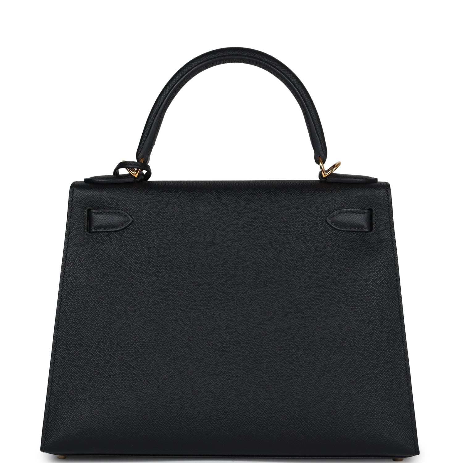 This Kelly Sellier is in Black epsom leather with gold hardware and has tonal stitching, a front toggle closure, a clochette with lock and two keys, a single rolled handle and an optional shoulder strap.