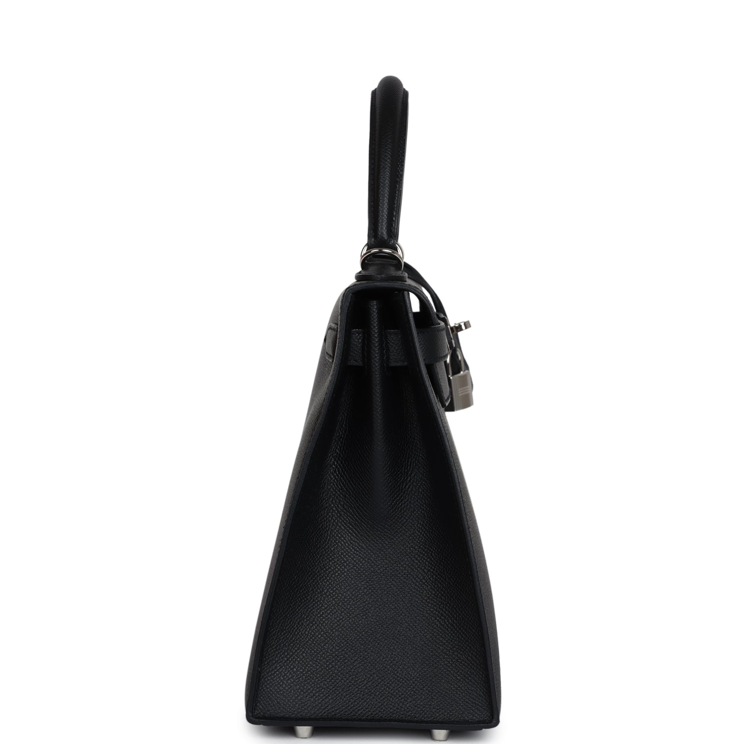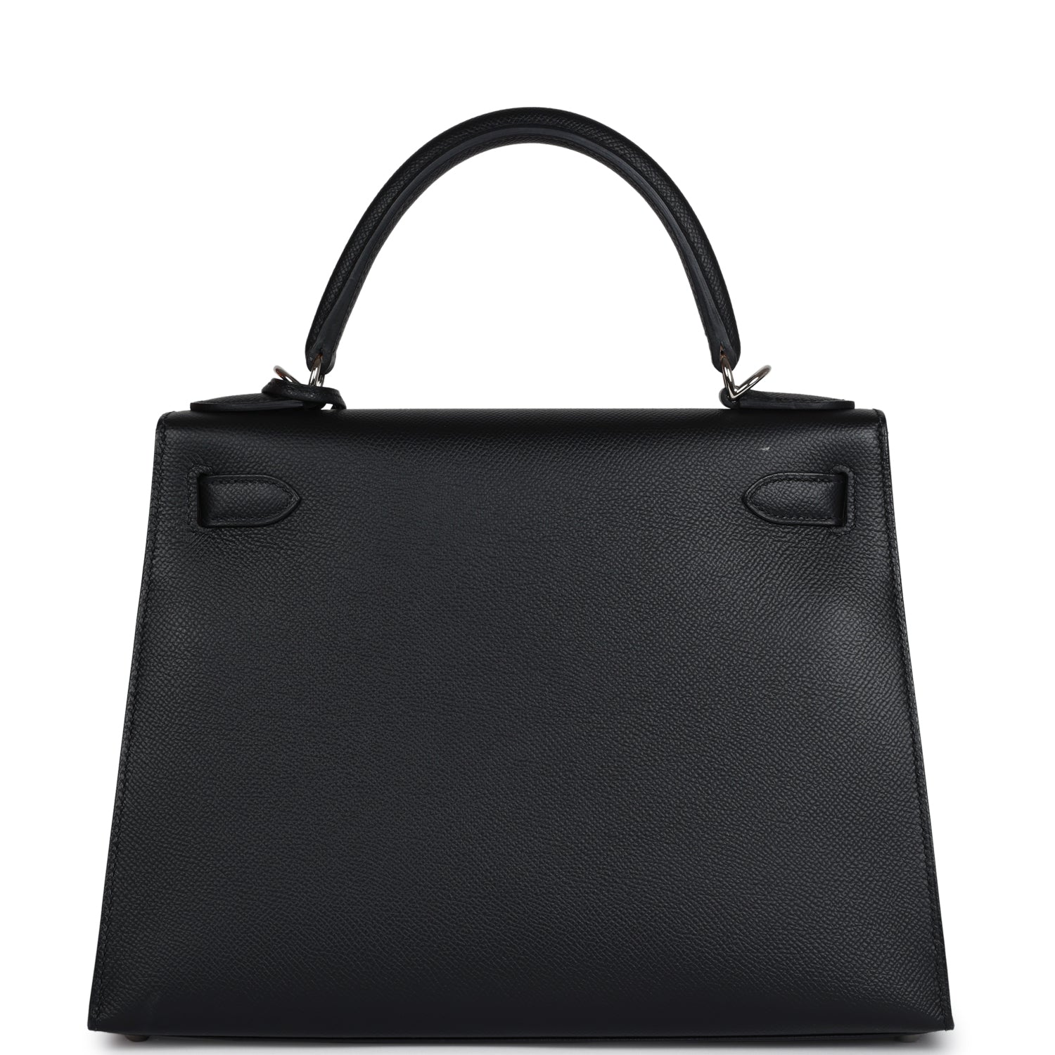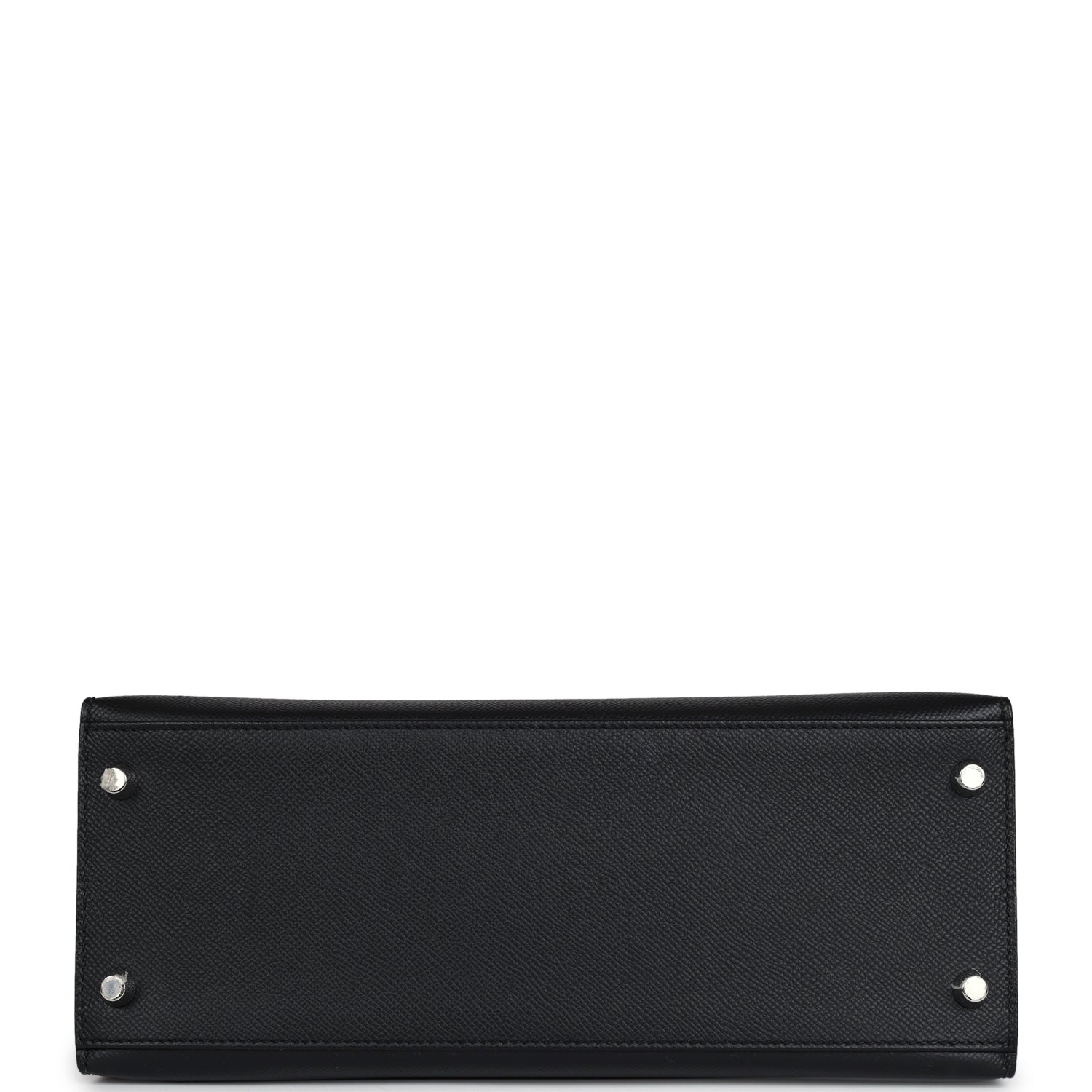 This Kelly, in the Sellier style, is in Black epsom leather with palladium hardware and has tonal stitching, a front toggle closure, a clochette with lock and two keys, a single rolled handle and an optional shoulder strap.