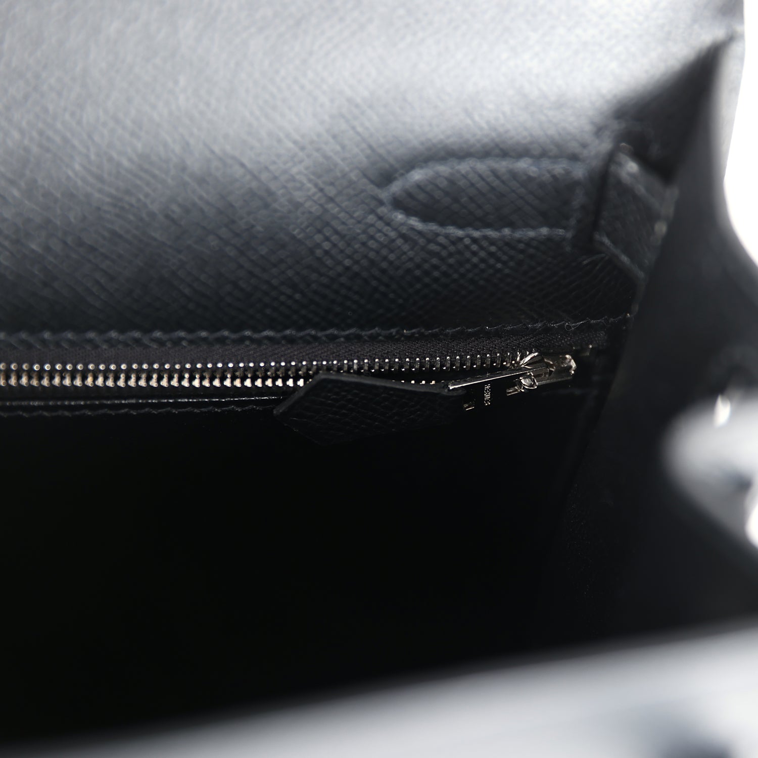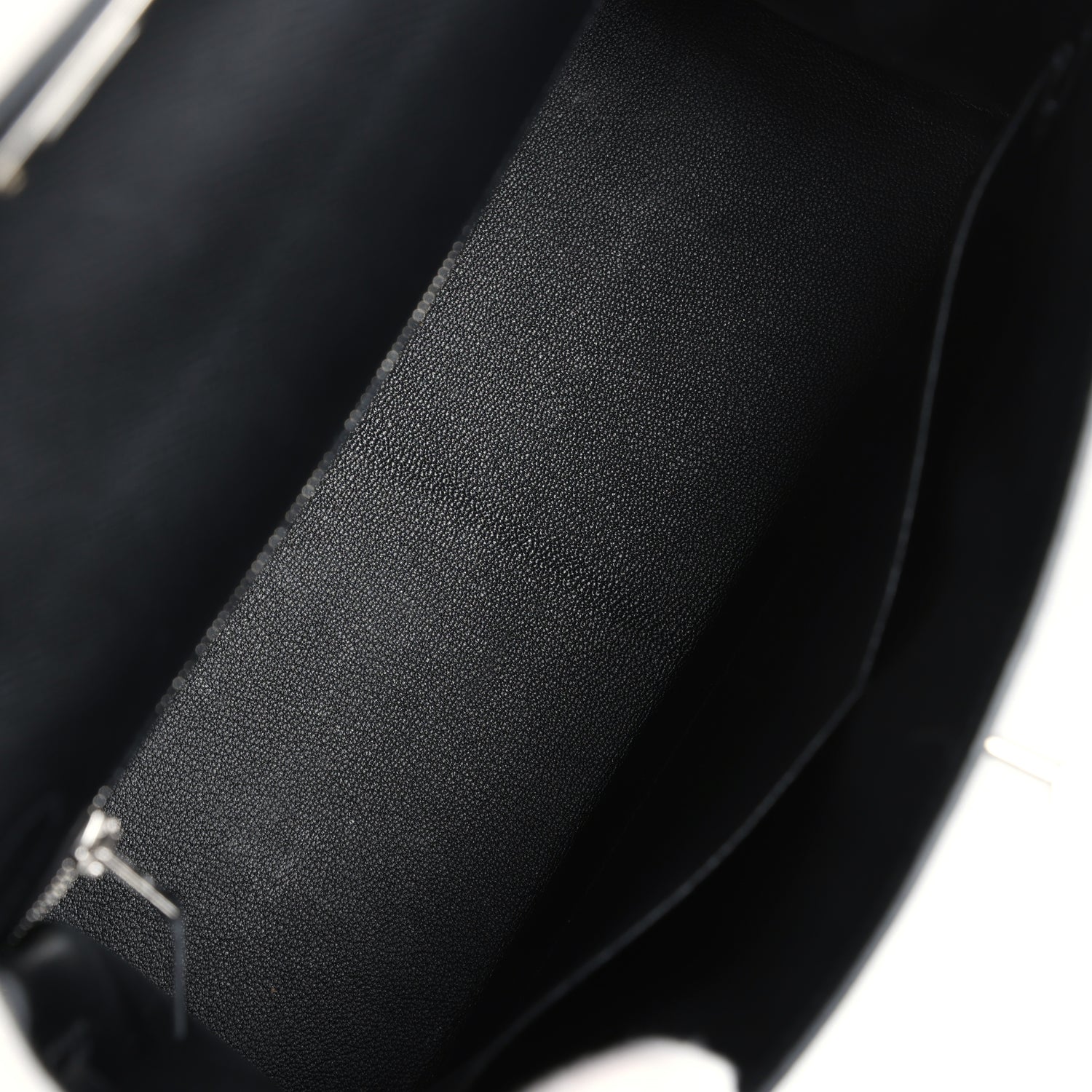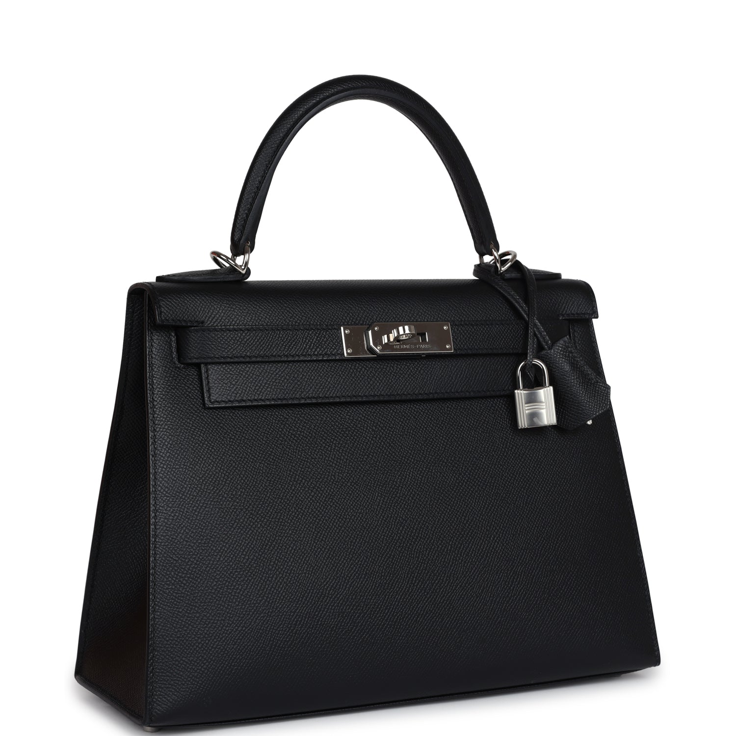 This Kelly, in the Sellier style, is in Black epsom leather with palladium hardware and has tonal stitching, a front toggle closure, a clochette with lock and two keys, a single rolled handle and an optional shoulder strap.