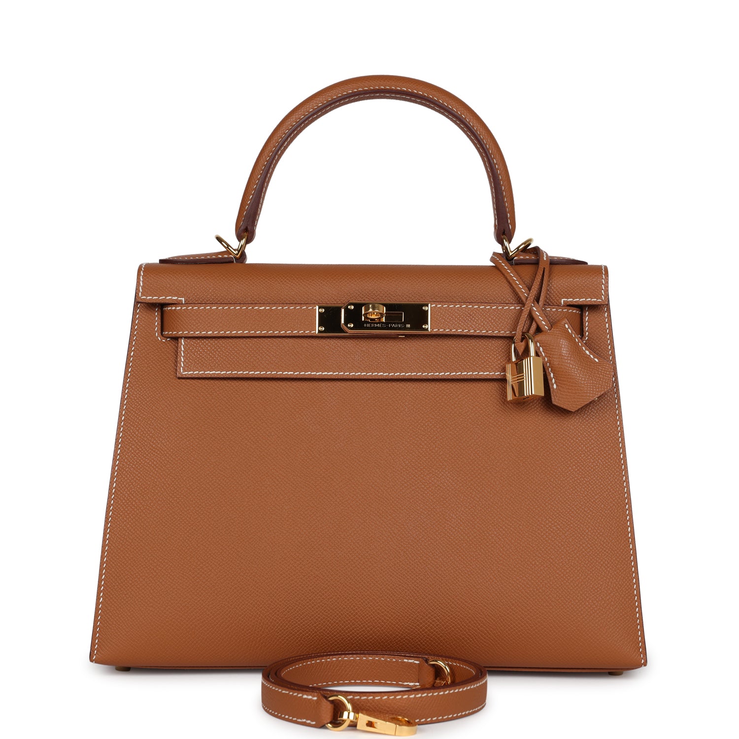 This Kelly, in the Sellier style, is in Gold epsom leather with gold hardware and has contrast stitching, front flap, two straps with center toggle closure, clochette with lock and two keys a single rolled handle and removable shoulder strap.