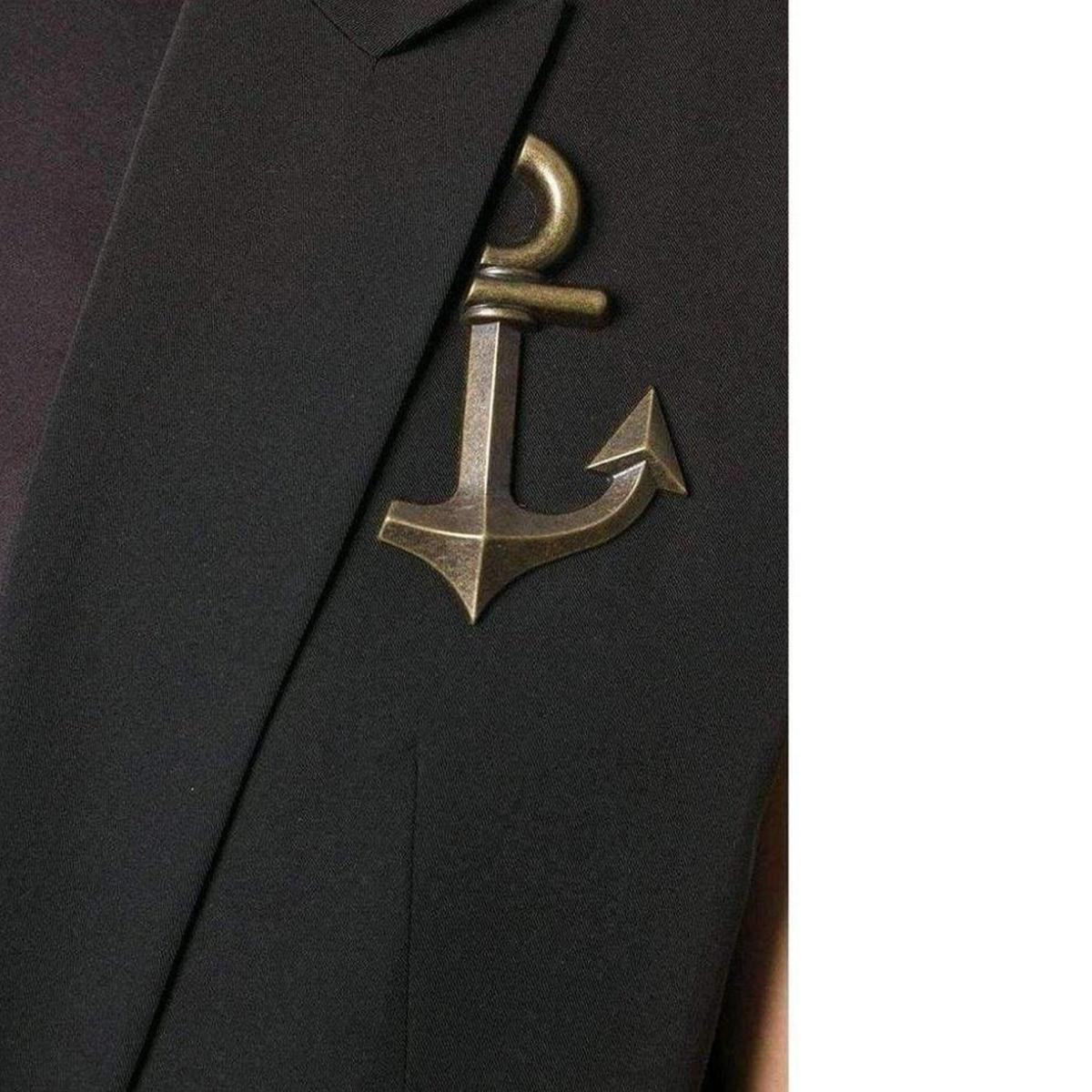 Solid metal anchor accent at breast in tarnished brass-tone metal.