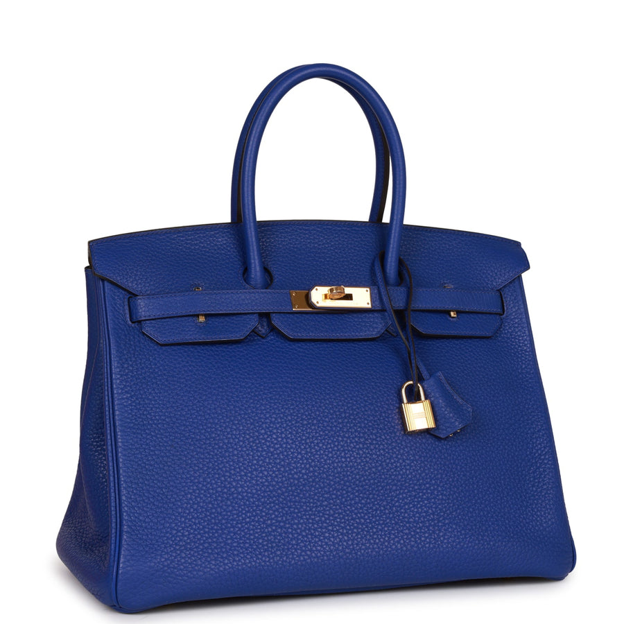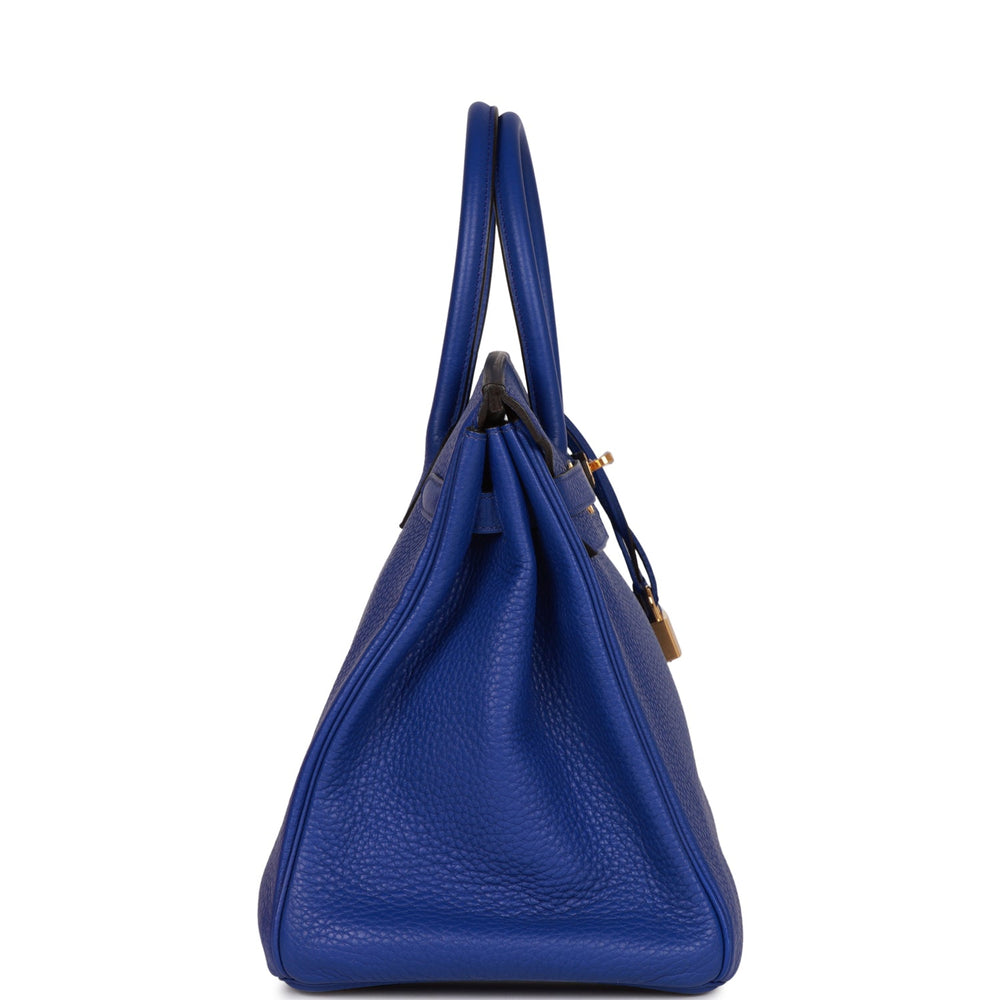 This Special Order Birkin is in Bleu Electric clemence leather with gold hardware and has tonal stitching, front flap, two straps with center toggle closure, clochette with lock and two keys, and double rolled handles.