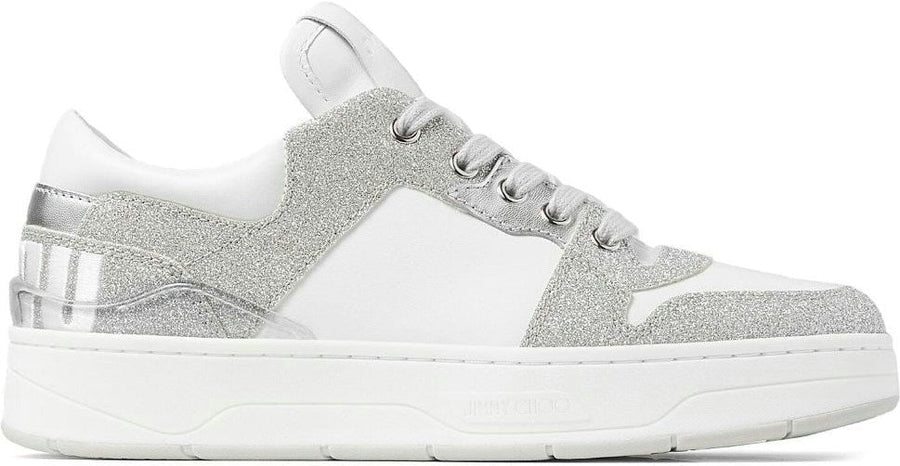 Step out in style with these Florent lace-up sneakers from Jimmy Choo. Made with white and silver-tone calf leather and glitter detailing, these sneakers feature a color-block panel design, an embroidered logo on the rear, and a branded insole for added comfort. With a front lace-up fastening and a round toe, these sneakers are perfect for any casual occasion.