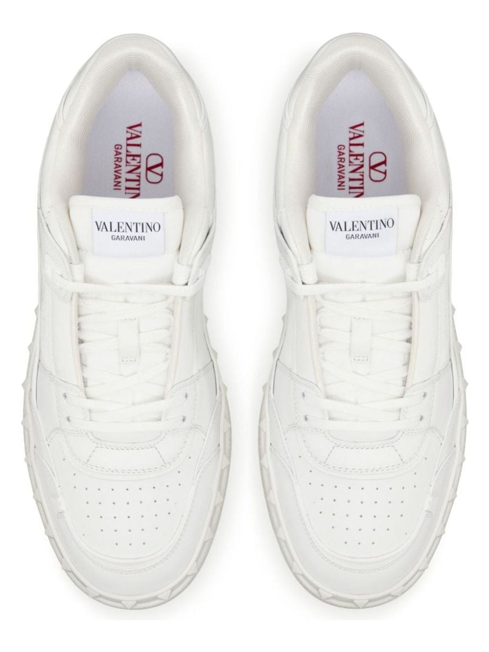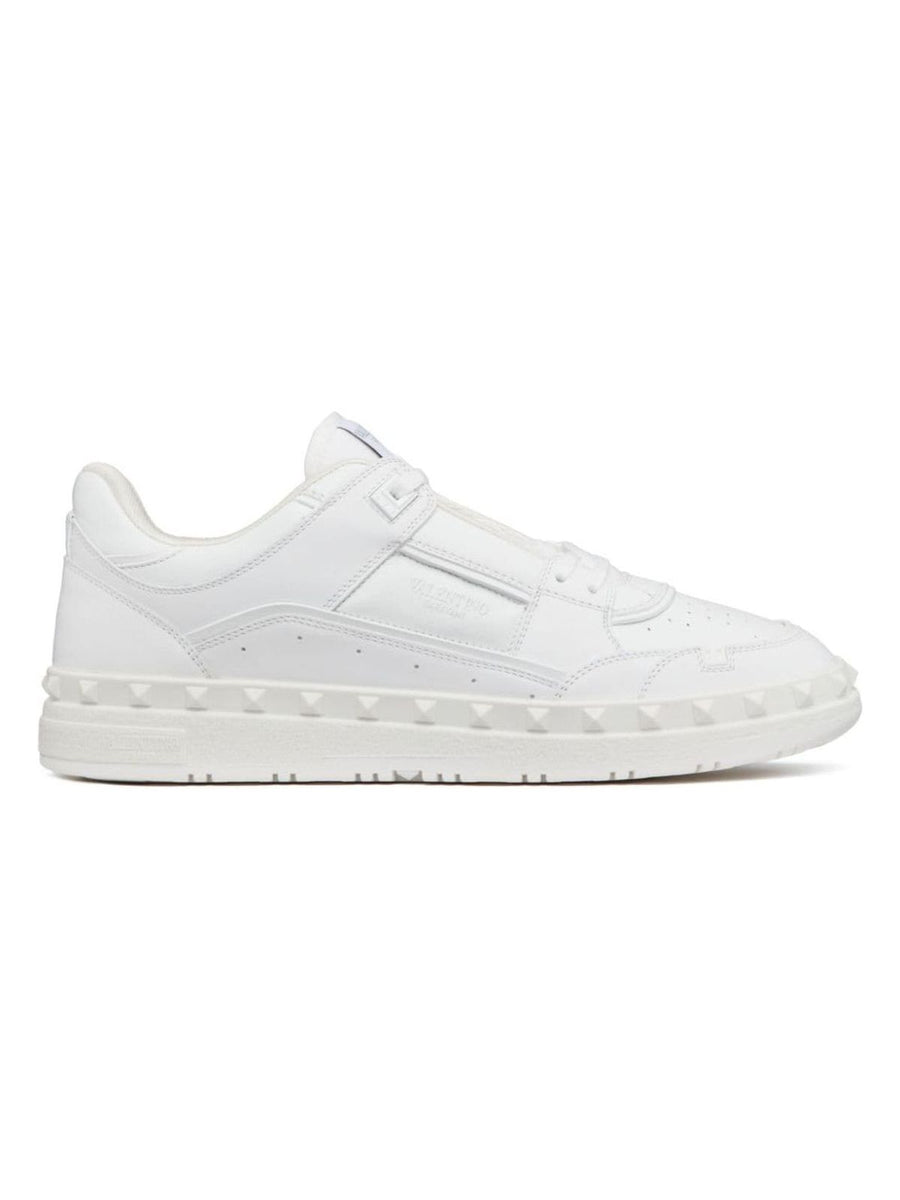 Step up your sneaker game with these FREEDOTS leather sneakers, featuring a sleek white calf leather panelled design, signature rockstud detailing, and an embossed logo on the side. With a logo patch at the tongue and a perforated toebox, these sneakers offer both style and breathability. The front lace-up fastening and flat rubber sole make them the perfect combination of fashion and comfort.