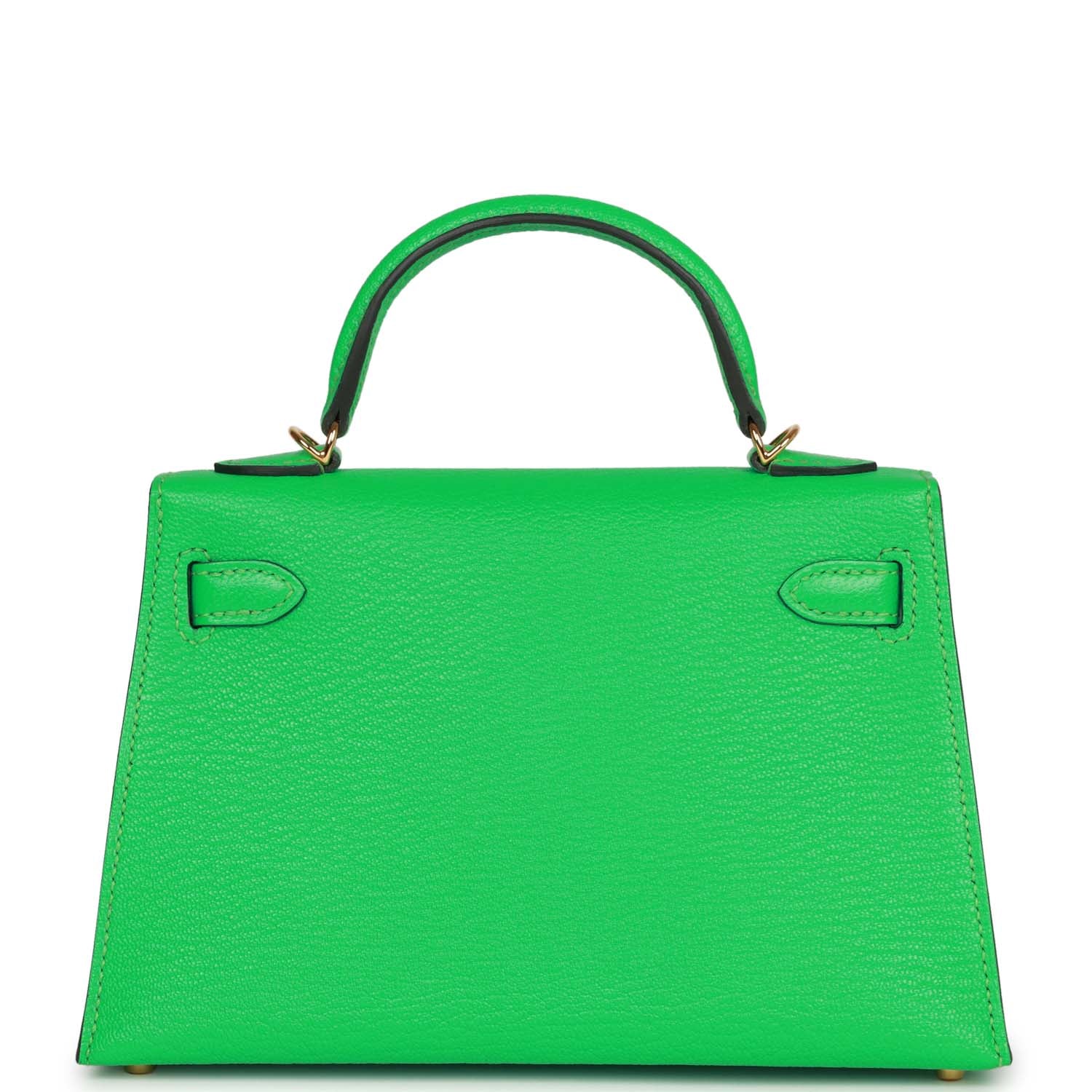 This tiny Kelly is in Vert Comics chevre leather with gold hardware, has tonal stitching, two front straps with front toggle closure, single rolled handle and removable shoulder strap.