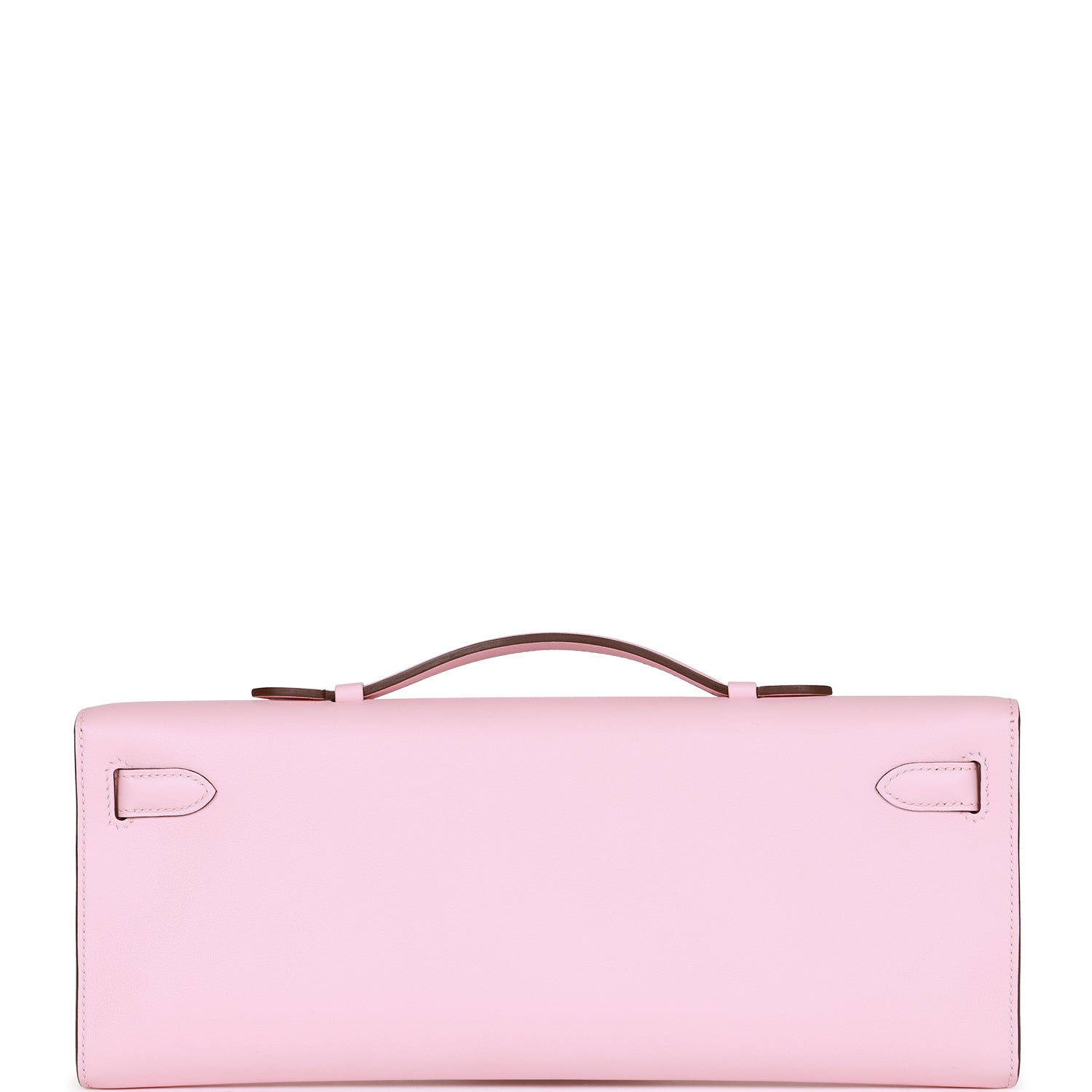This Kelly Cut wallet is in Rose Sakura swift leather with palladium hardware and has tonal stitching, two straps with front toggle closure and a top flat handle.