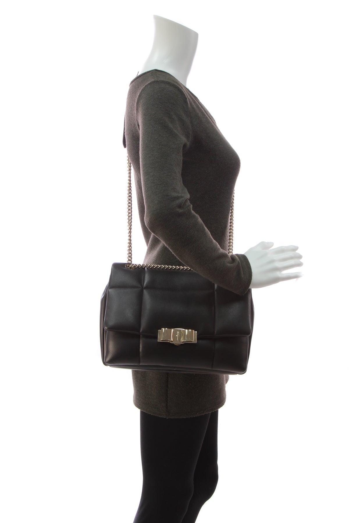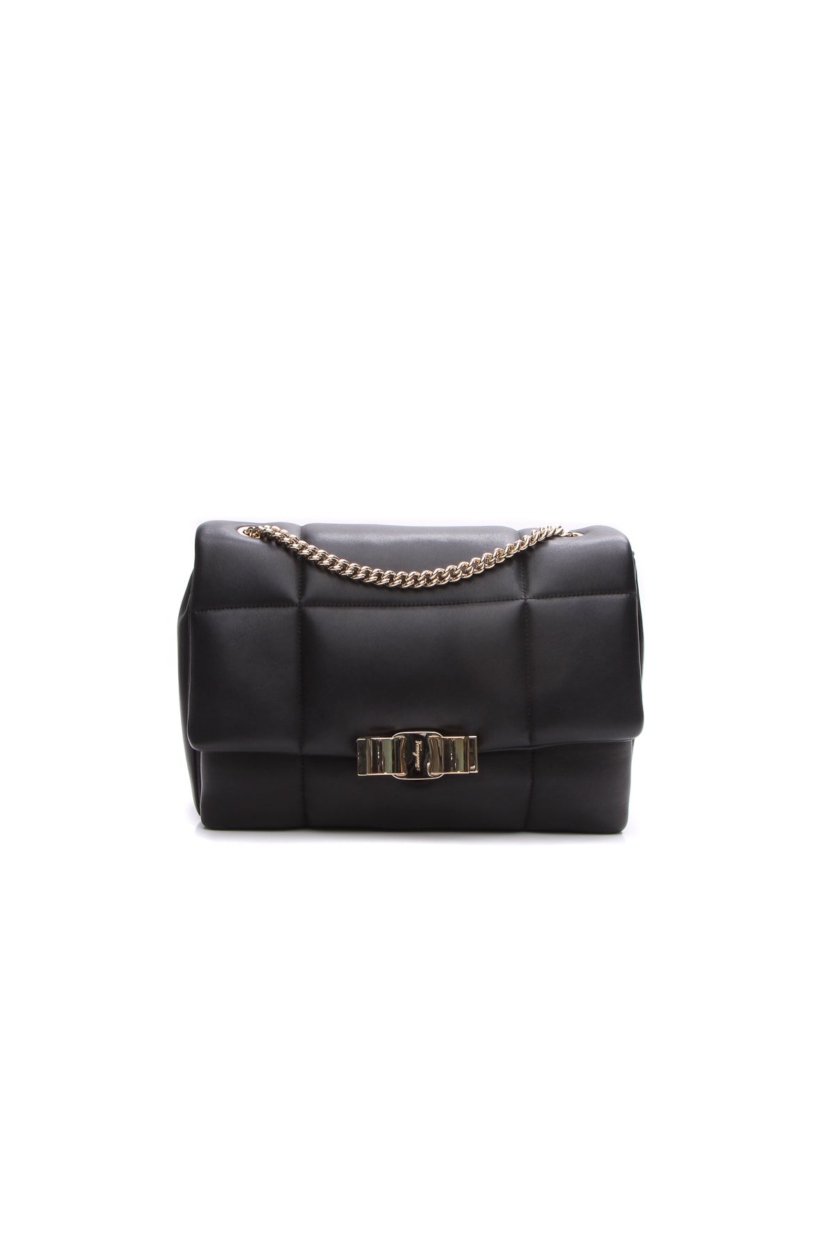 Add modern glam to your current collection with this authentic Salvatore Ferragamo Vendom bag. Rendered in black nappa leather, this bag features an oversized quilt, chain strap and sweet signature gold-tone bow for that every day finish you want.
