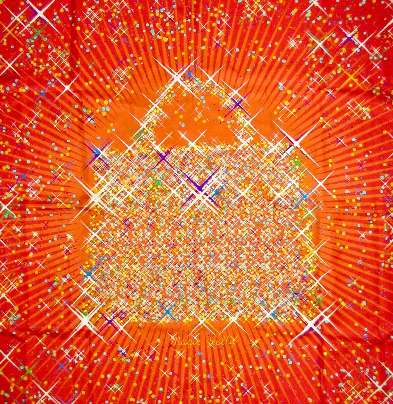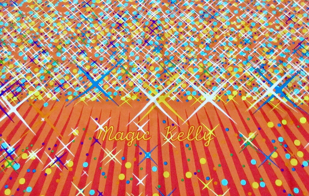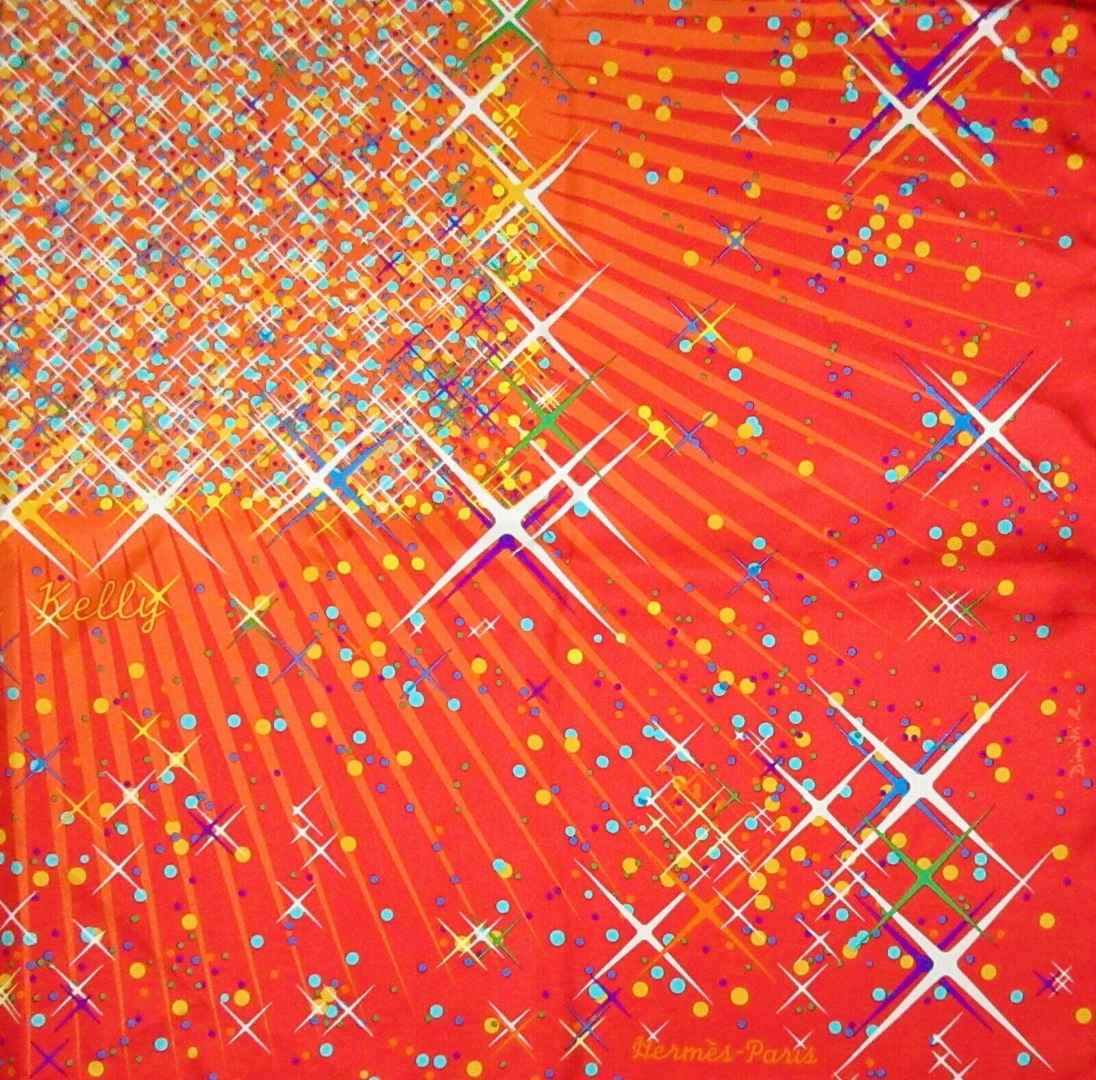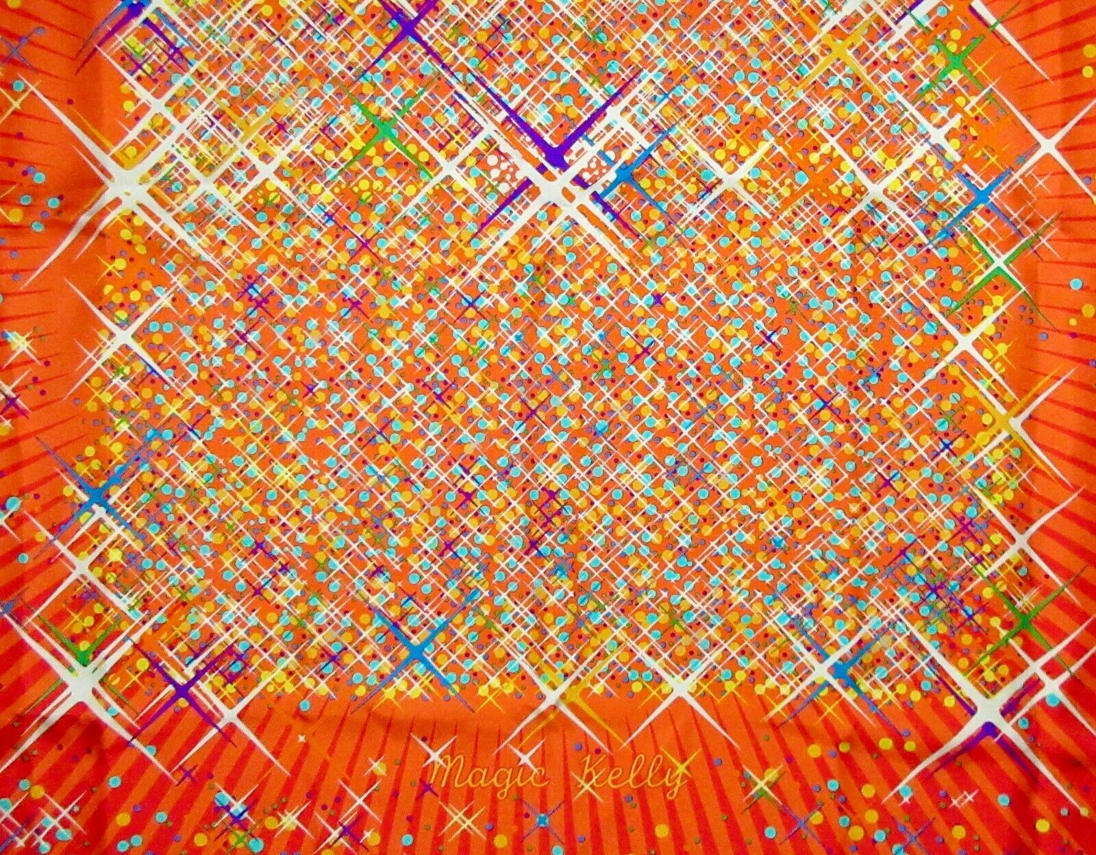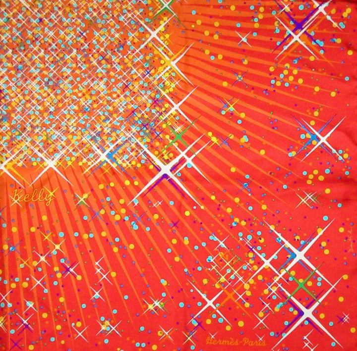 Vintage Hermes Scarf. The Hermes Magic Kelly scarf celebrates the magic of the Hermes Kelly bag, the most famous bag in the world, with stars and sparkles in every beautiful color, against an orange-red and orange background, with contrast-color orange hems. Designed by Dmitri Rybaltchenko in 2011. Care tag attached. Comes in original box. Brand new un condition.