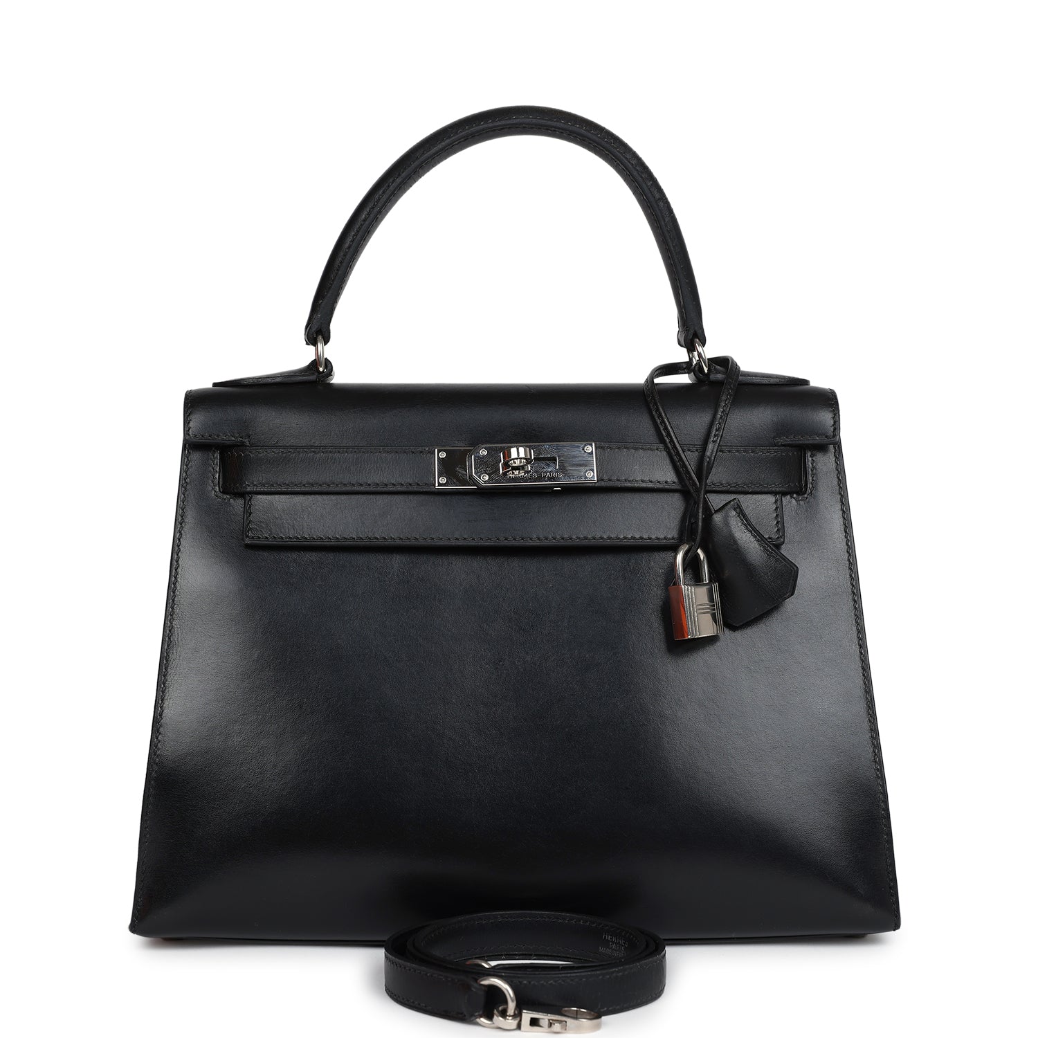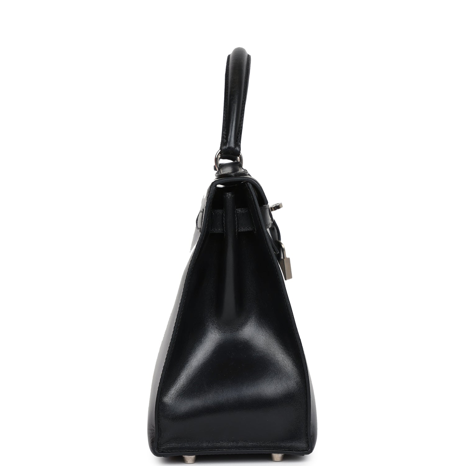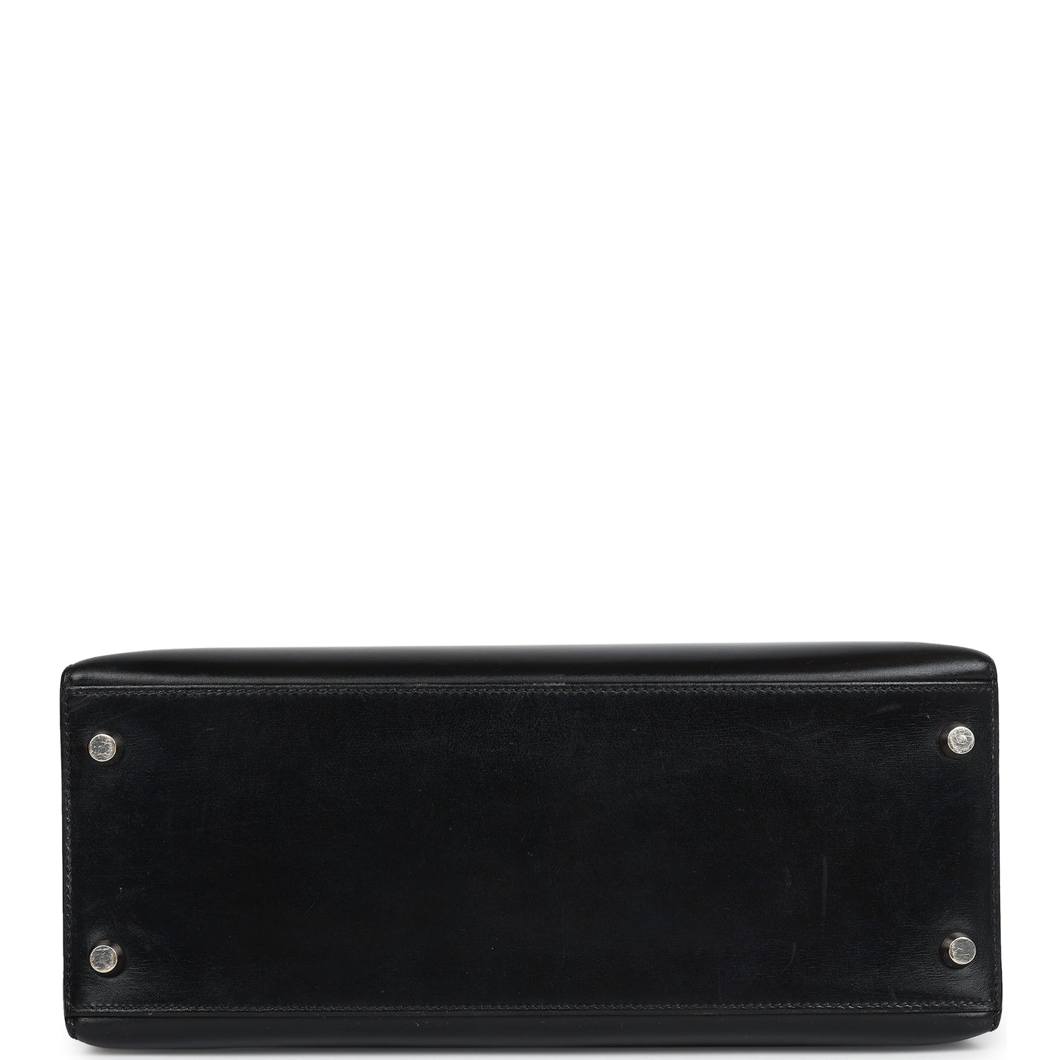 This vintage Kelly, in the Sellier style, is in Black box calfskin leather with palladium hardware and has tonal stitching, two front straps with front toggle closure, single rolled handle and removable shoulder strap.