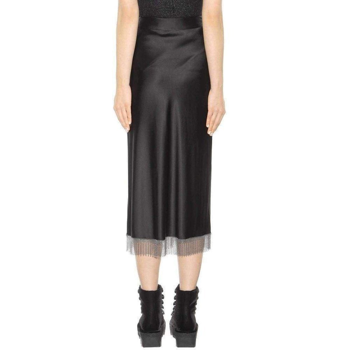 This skirt from Alexander Wang comes in a pitch black hue and is crafted from silky-smooth satin for a seductive sheen. The hem is lined with a metal chain mail fringe, giving the piece an urban edge. Wear yours as part of an all-black outfit for a city-chic look.Zipped side, hook fastening