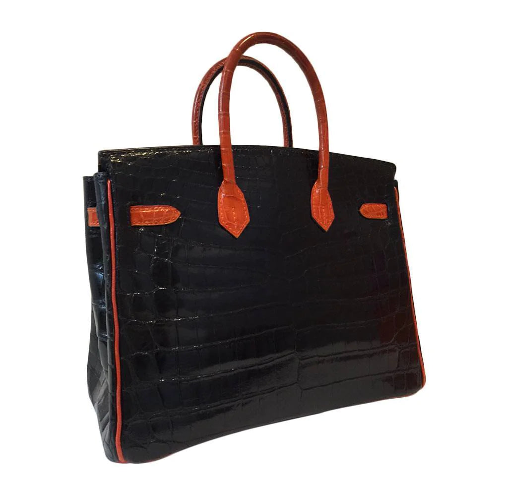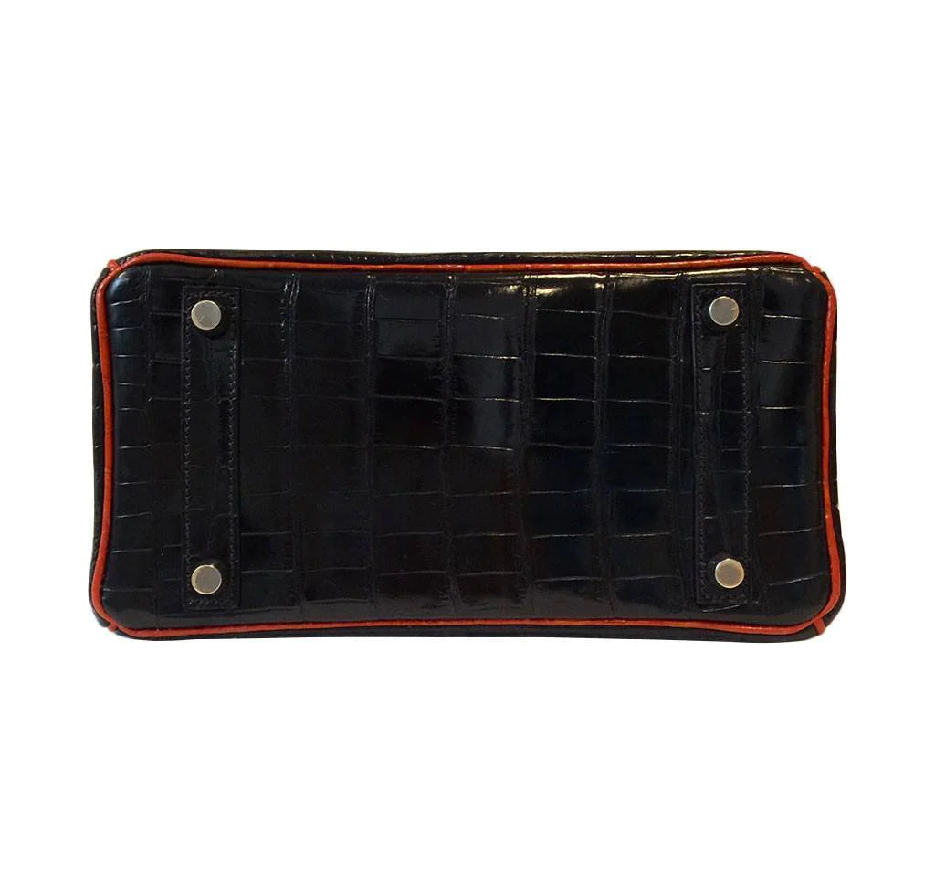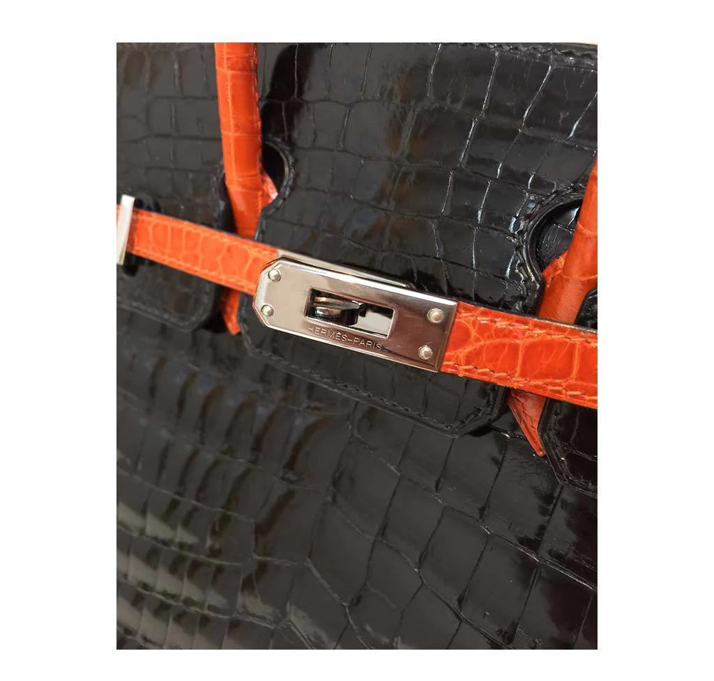 Extremely rare Hermès Birkin limited edition bi-color crocodile bag. Combination of black and Hermès signature orange on a two-tone crocodile exterior. The embossing features the dual-dot signature, which signifies Niloticus Crocodile from the Nile River. Palladium hardware completes the elegant appearance on one of the rarest Birkin bags we have ever featured on ZAK BAGS. Please contact us for more details and availability.