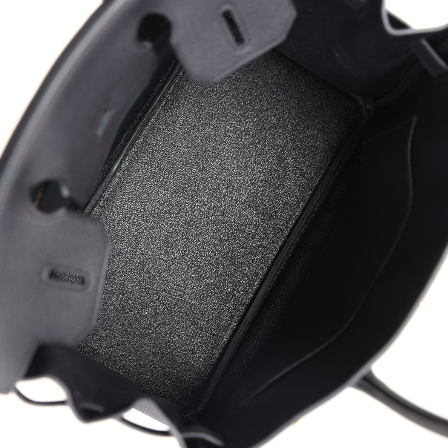 The interior is lined with Black chevre and has one zip pocket with an Hermes engraved zipper pull and an open pocket on the opposite side.