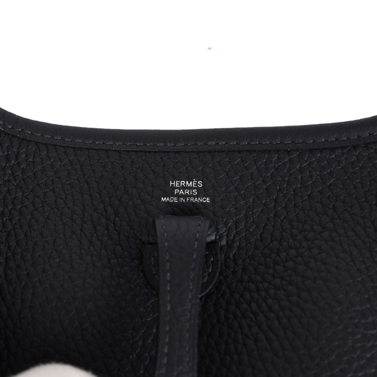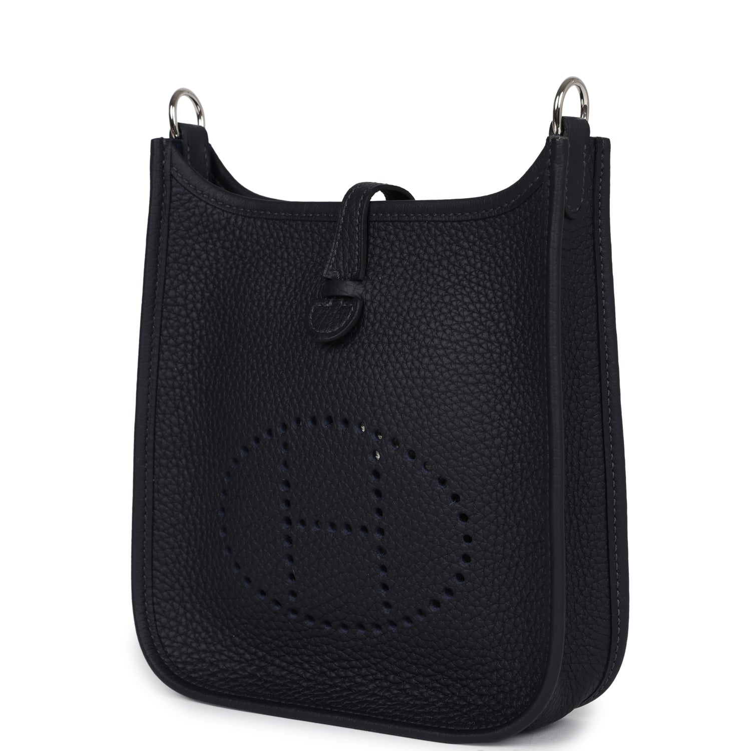 This Hermes Evelyne TPM is in Caban clemence leather with palladium hardware, tonal stitching, large perforated H in circle (front), pull tab top snap closure and removable fabric shoulder/crossbody strap.