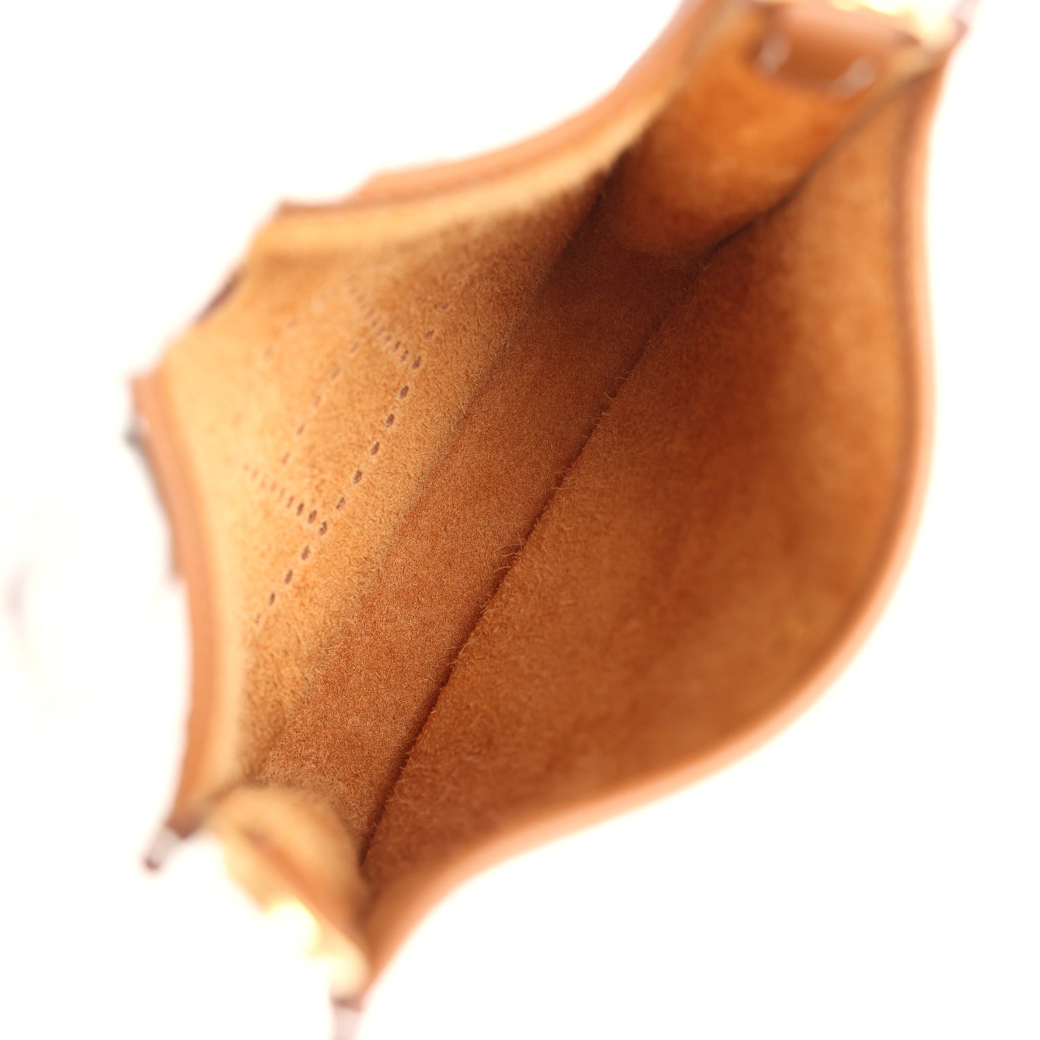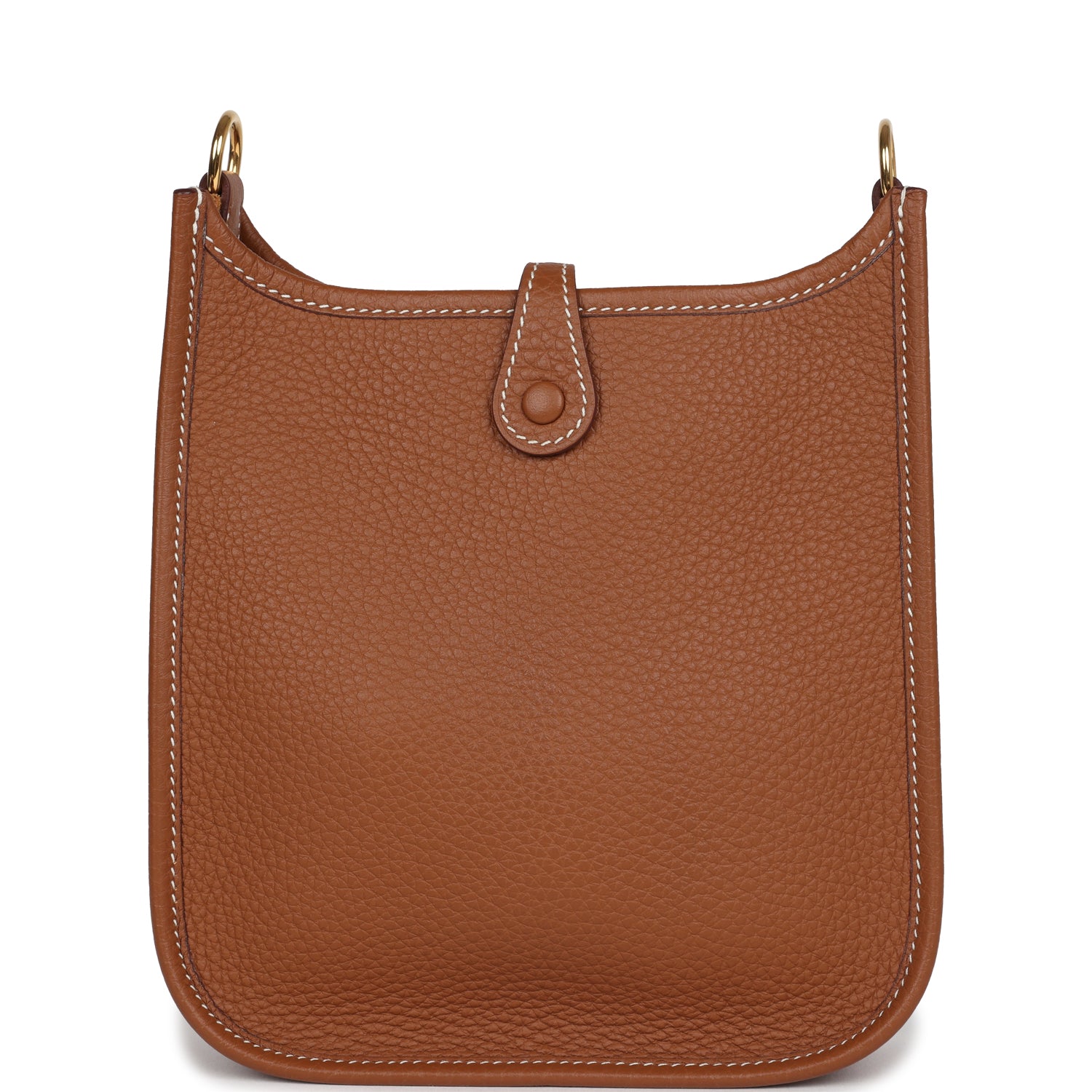 This Evelyne TPM is in Gold clemence leather with gold hardware and features contrast stitching stitching, pull tab top closure and a removable Gold canvas and leather shoulder/crossbody strap.