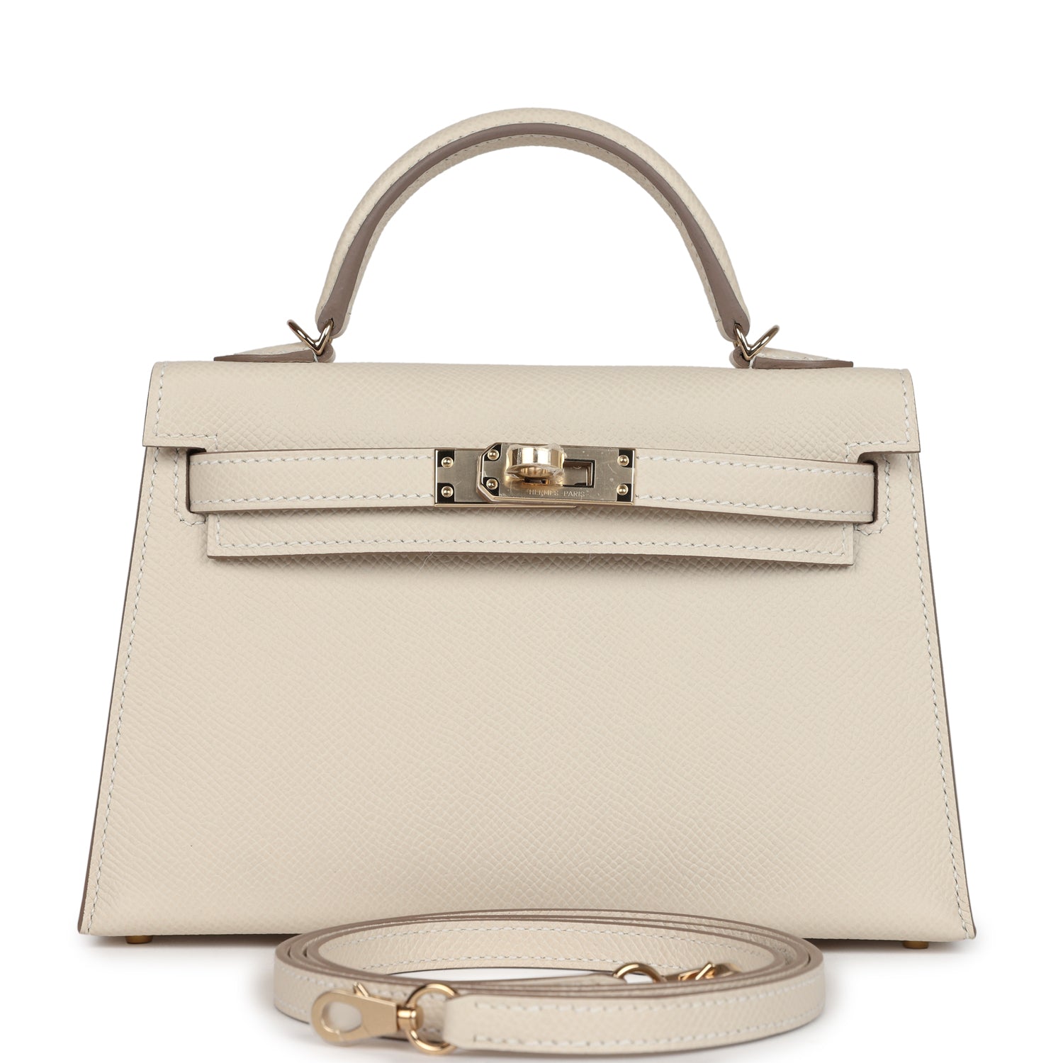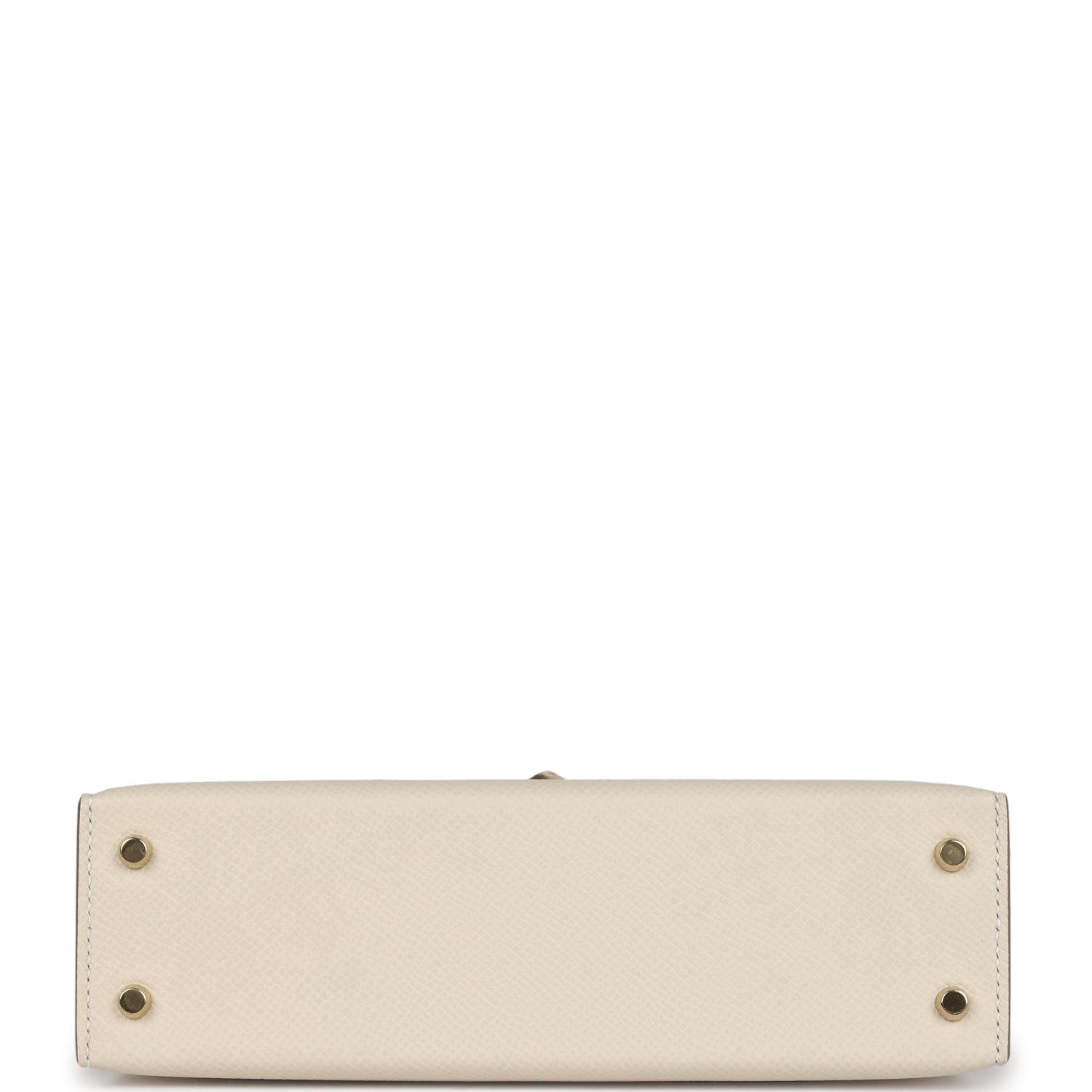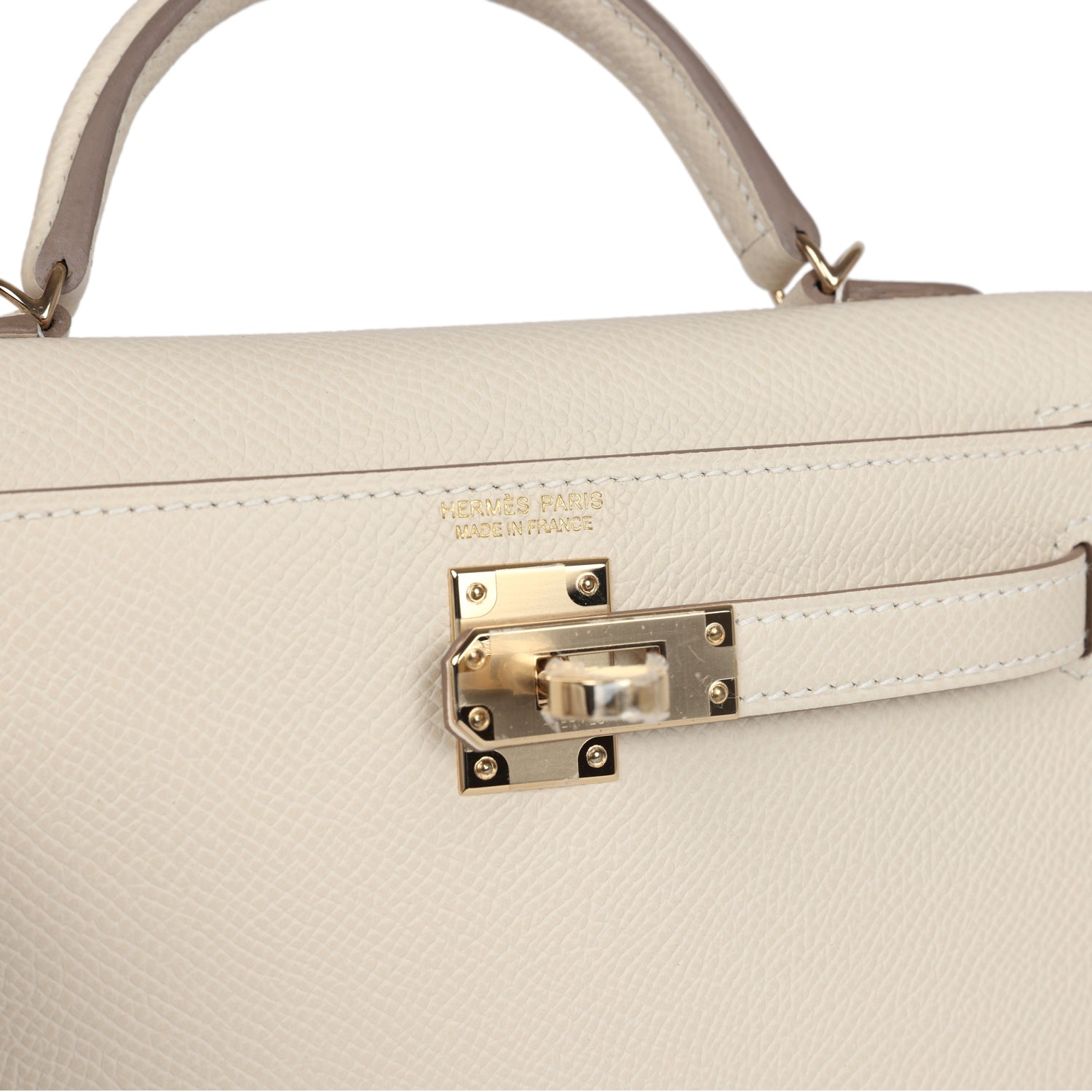 This Kelly, in the Sellier style, Craie Epsom leather with Permabrass hardware and has tonal stitching, two straps with front toggle closure, single rolled handle and a removable shoulder strap.