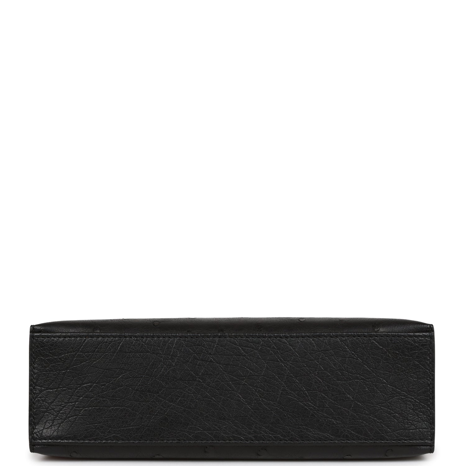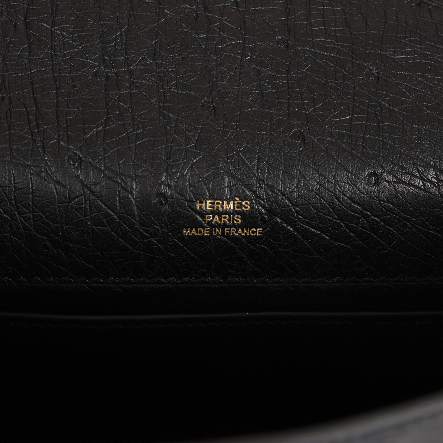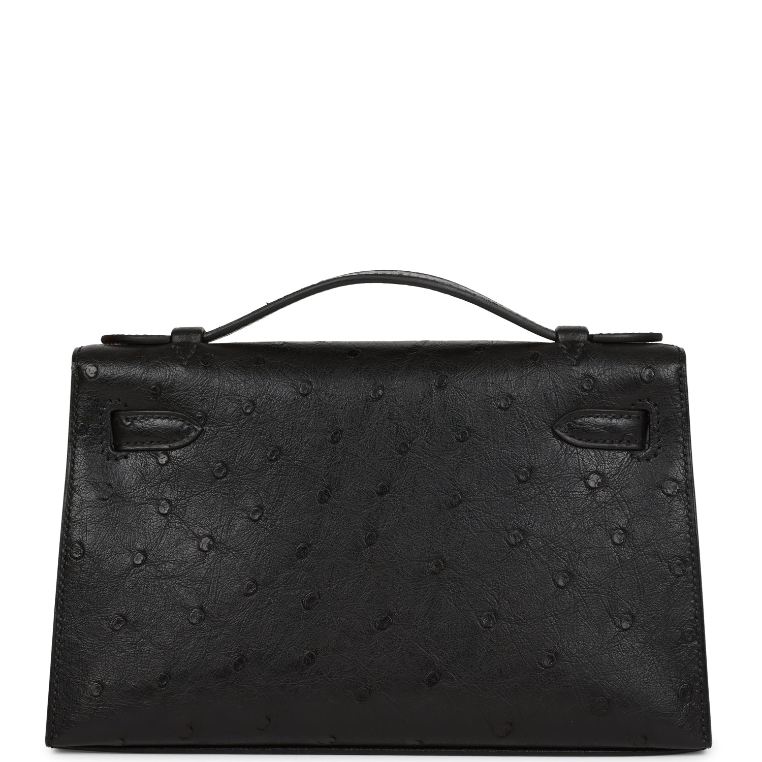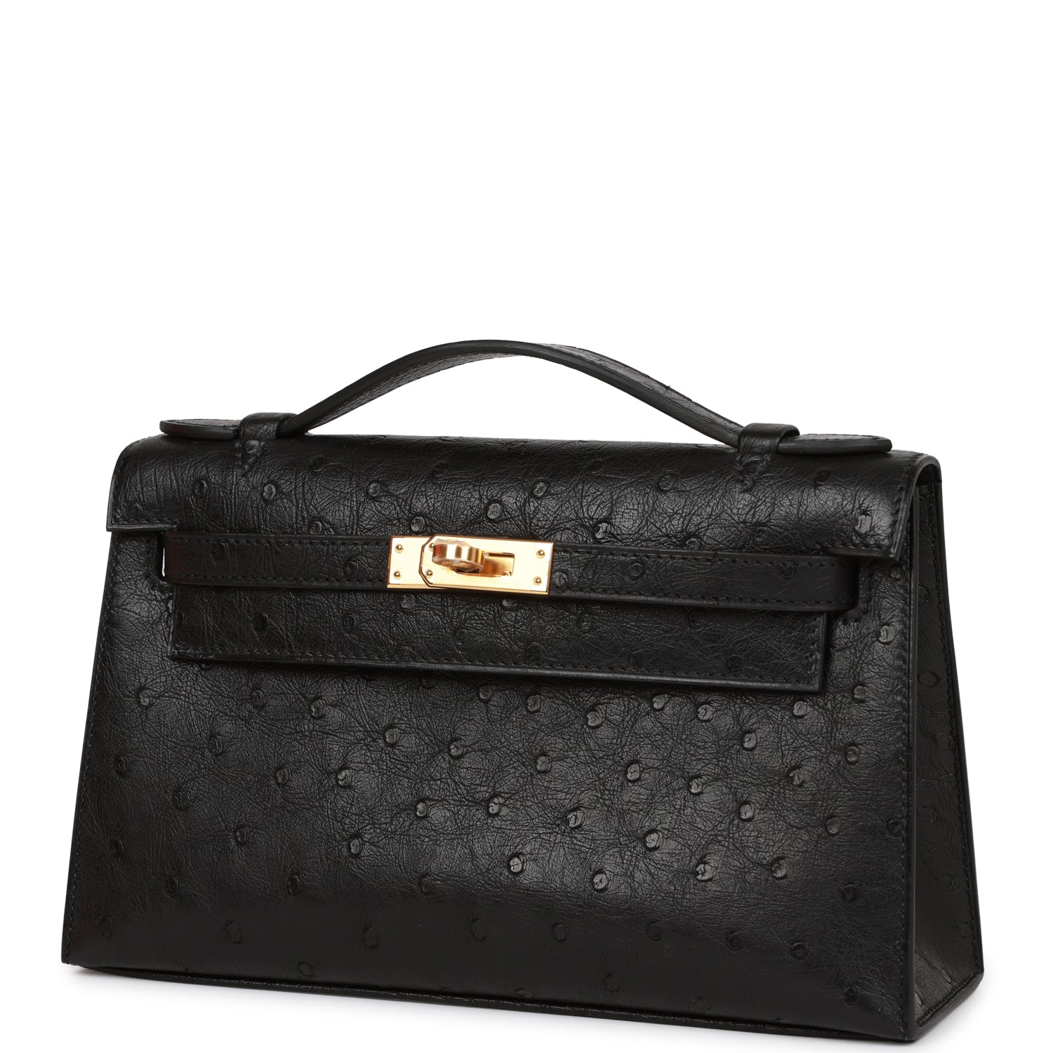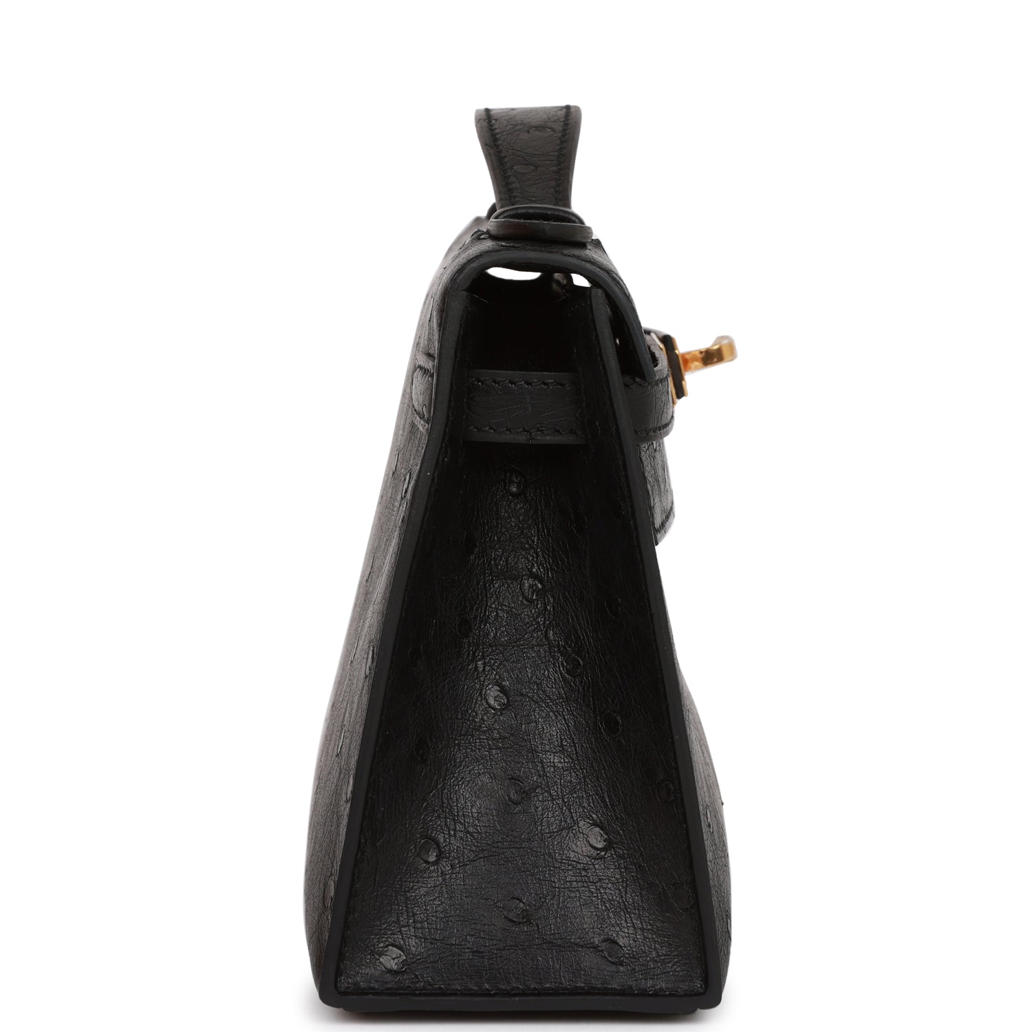 This Mini Kelly Pochette is in Black ostrich with gold hardware and has tonal stitching, front flap, two straps with center toggle closure and a top flat handle.