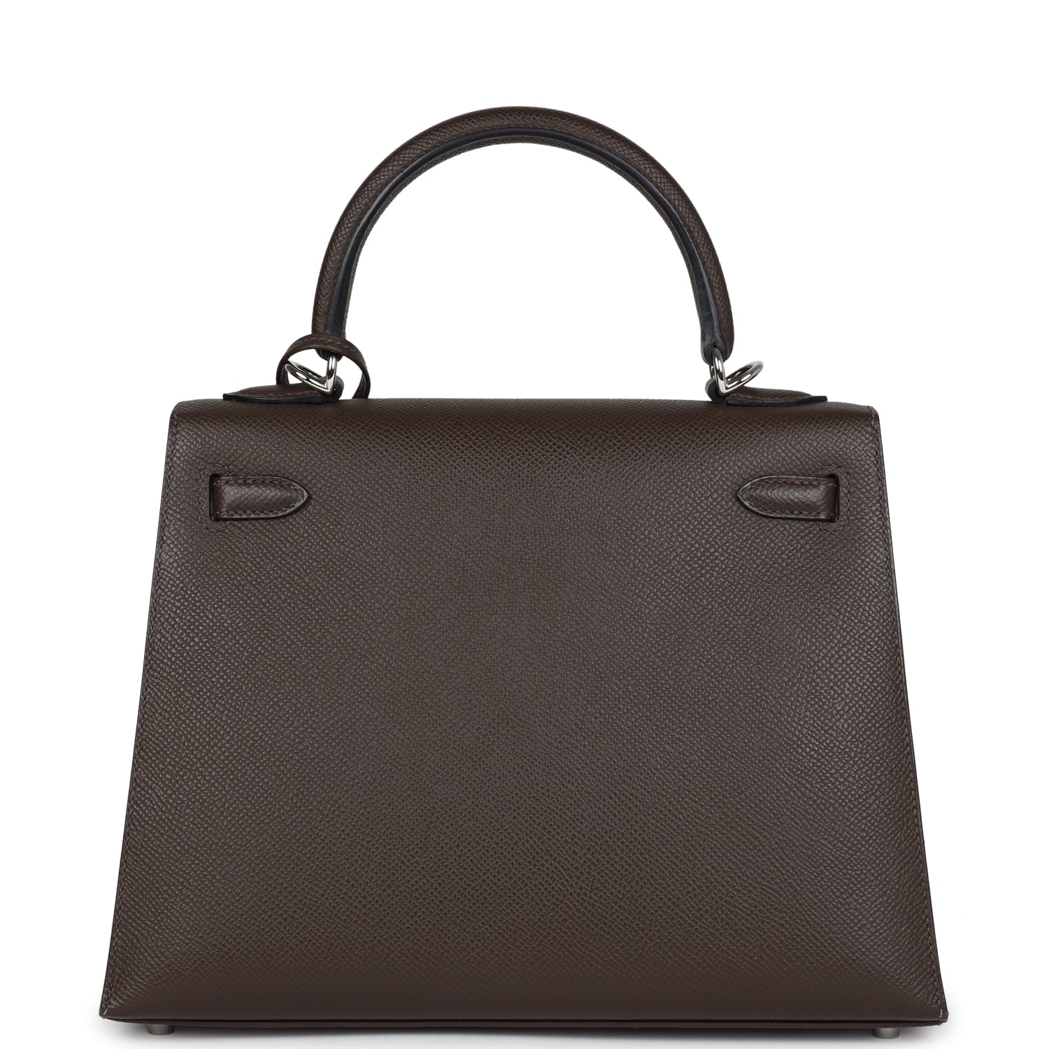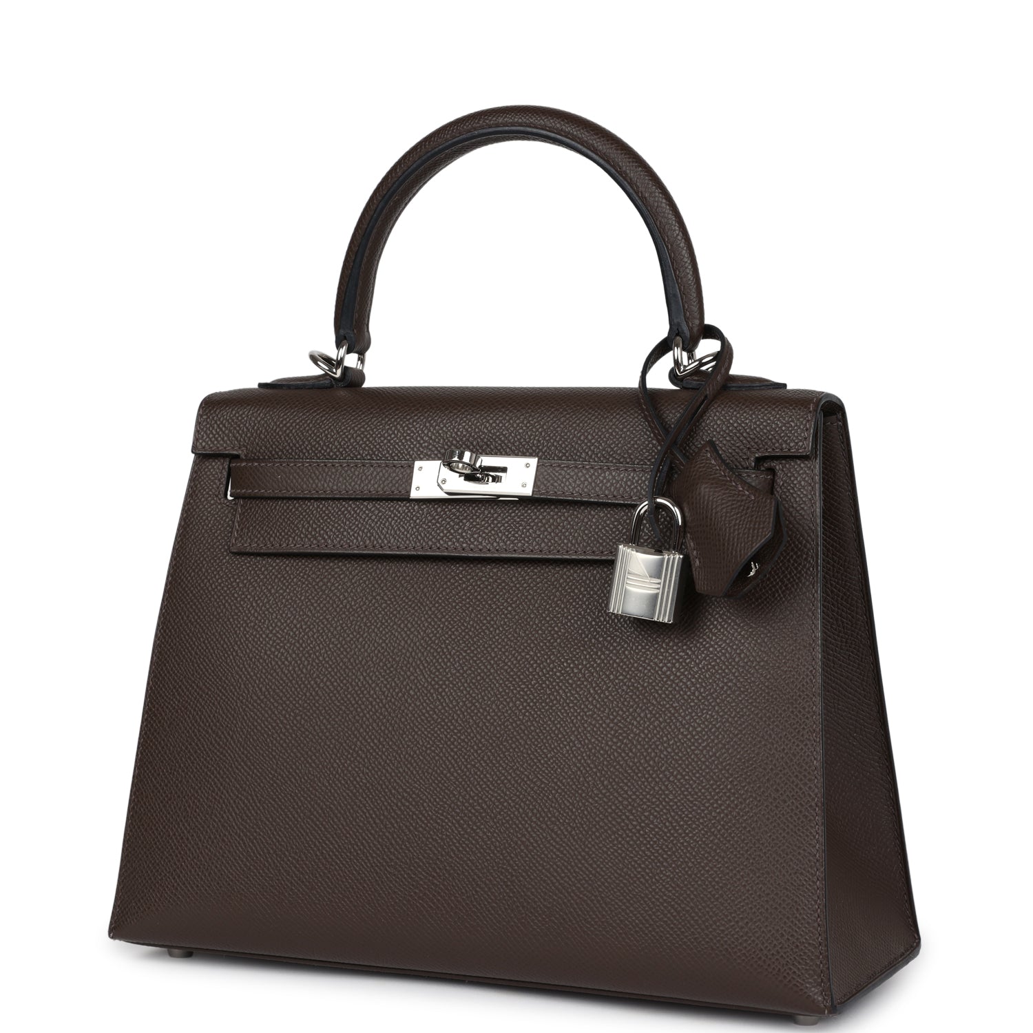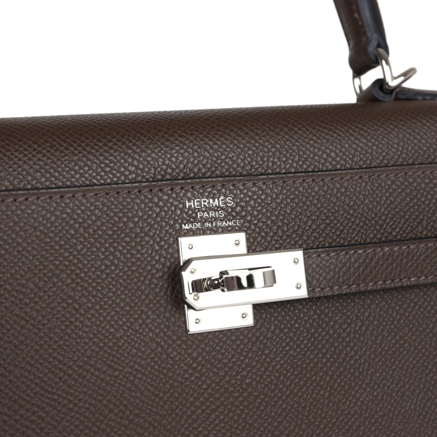 This Kelly, in the Sellier style, is in Ecorce epsom leather with palladium hardware, has tonal stitching, front flap, two straps with center toggle closure, clochette with lock and two keys, single rolled handle and a removable shoulder strap.