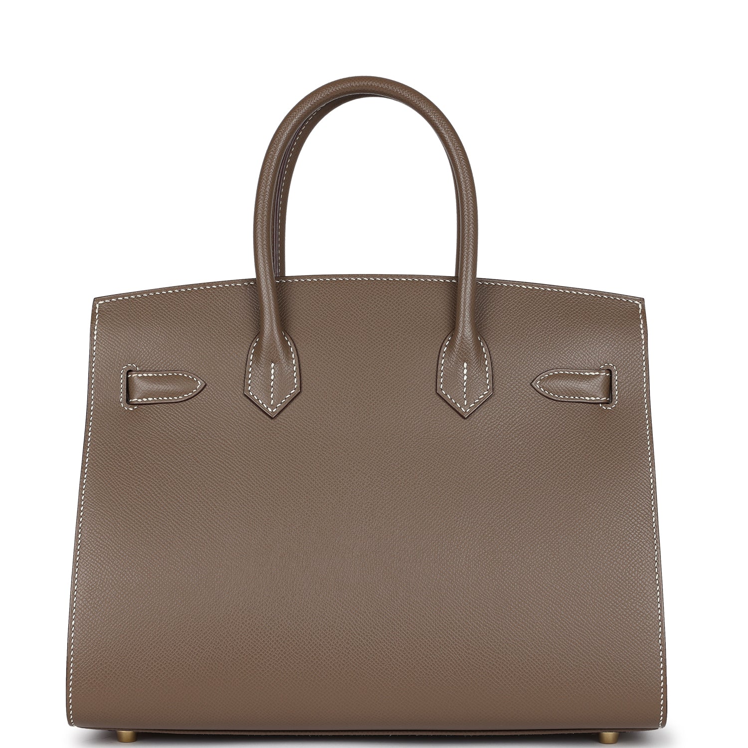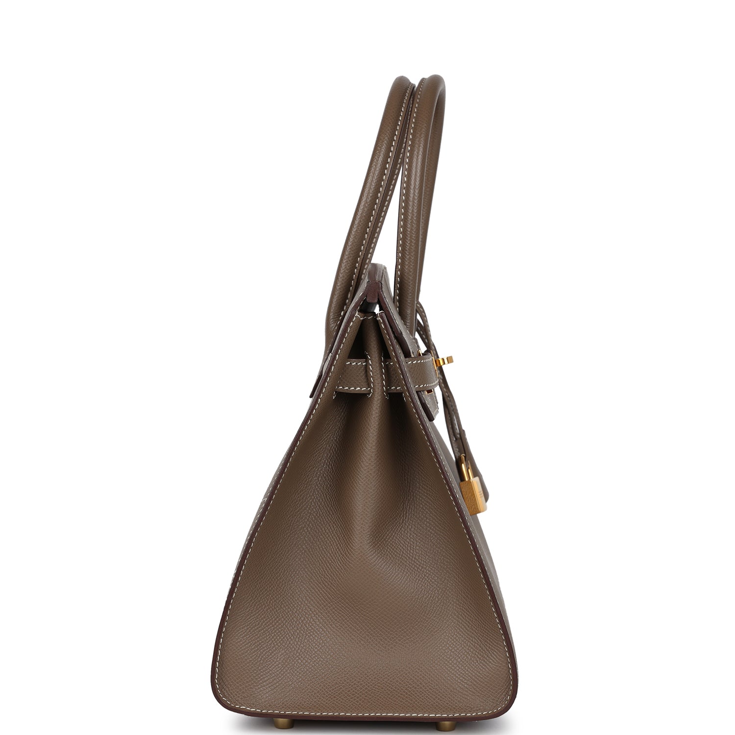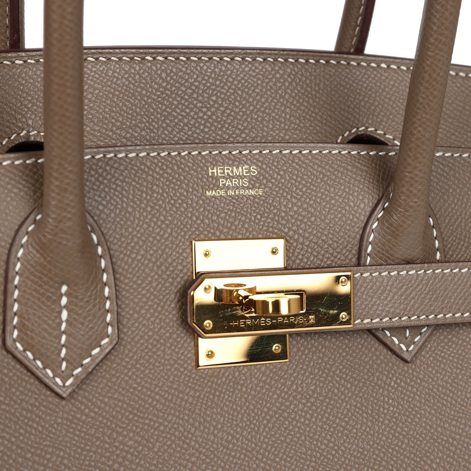 This Birkin is of Etoupe epsom leather with gold hardware and has contrast stitching, front flap, two straps with center toggle closure, clochette with lock and two keys, and double rolled handles.