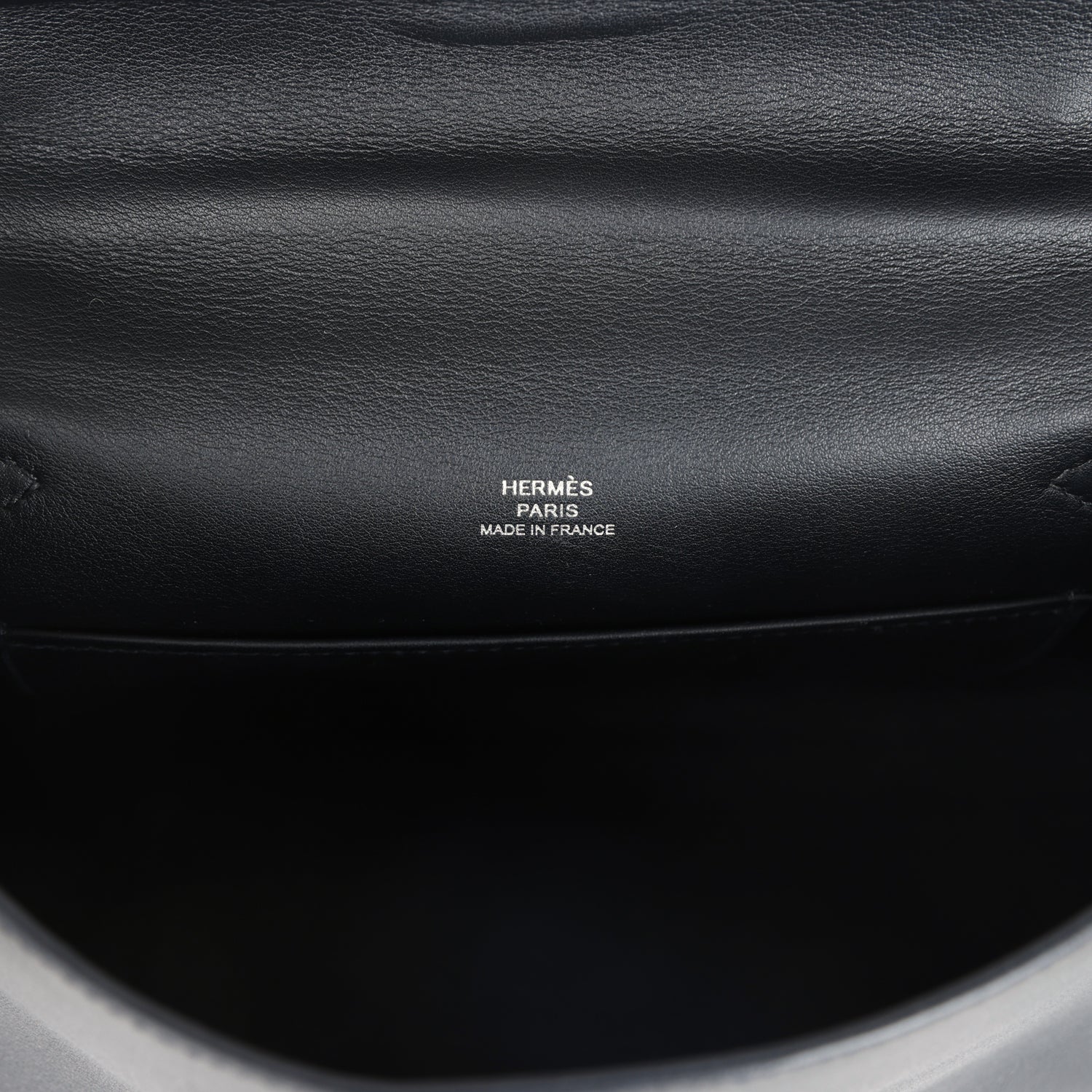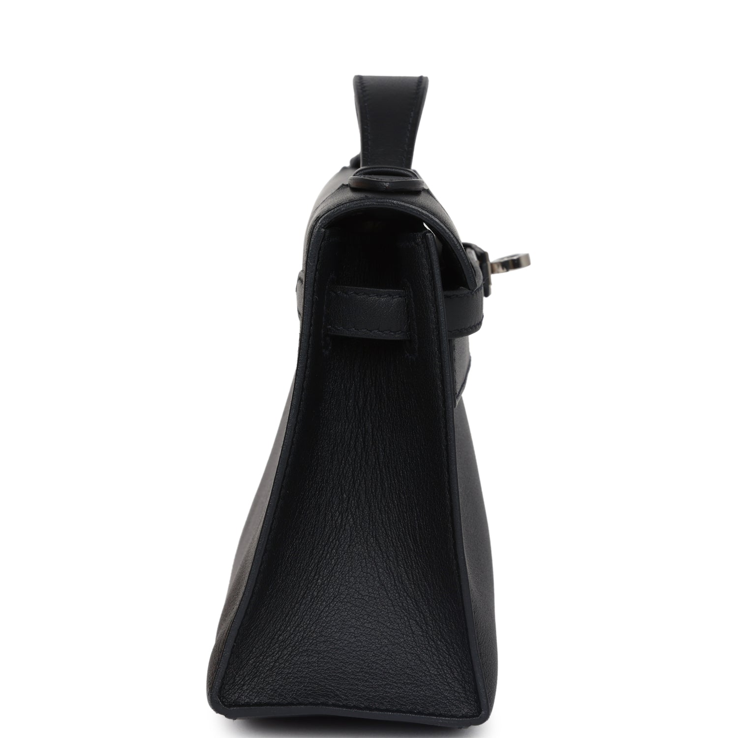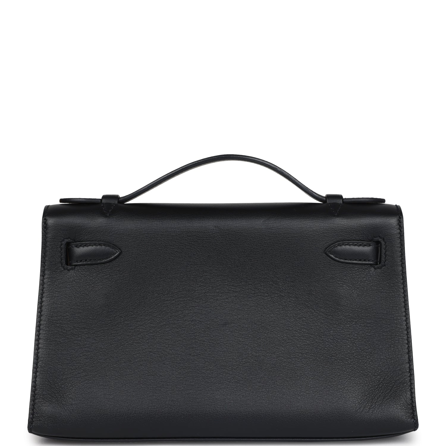 This Mini Kelly Pochette is in Black swift leather with palladium hardware and has tonal stitching, front flap, two straps with center toggle closure and a top flat handle.