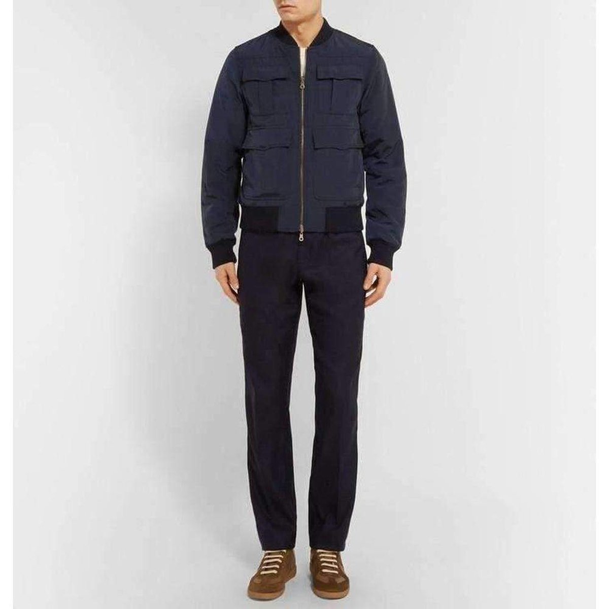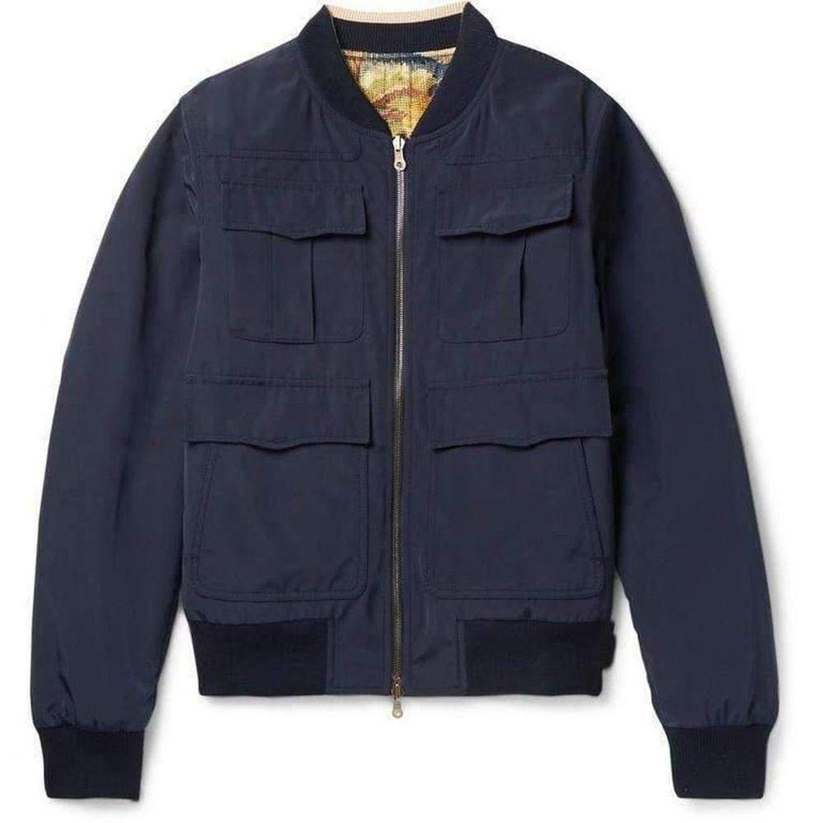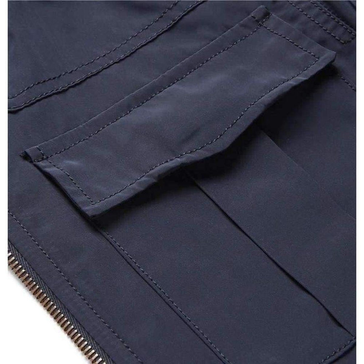 Two front welt pockets, two chest flap pockets, two front flap pockets, ribbed trims