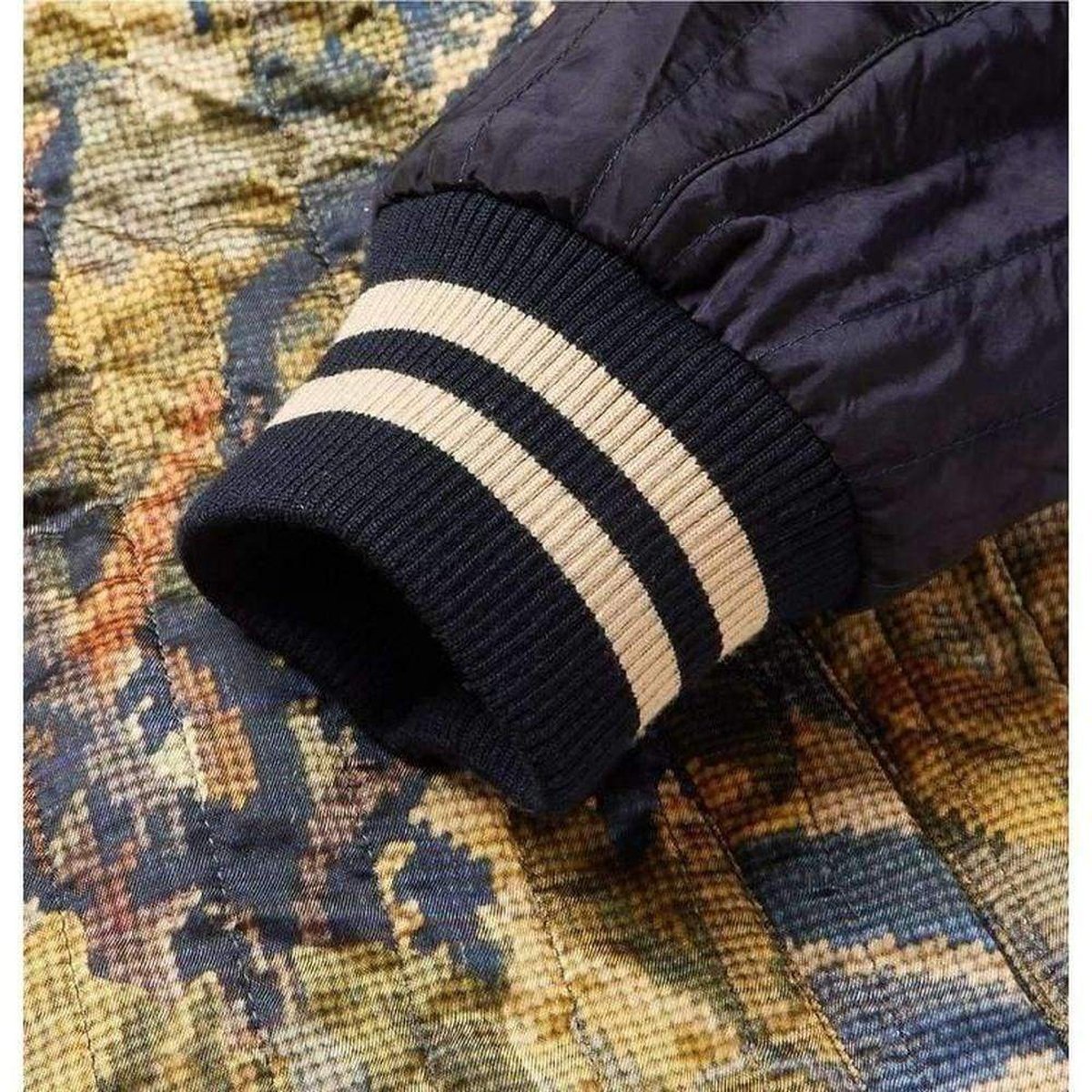 For a more adventurous aesthetic, reverse it to reveal satin printed with a vivid tapestry pattern and varsity-inspired striped accents.