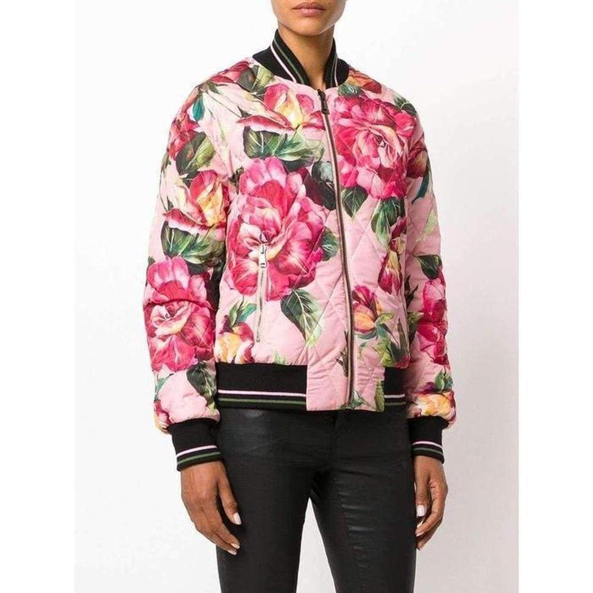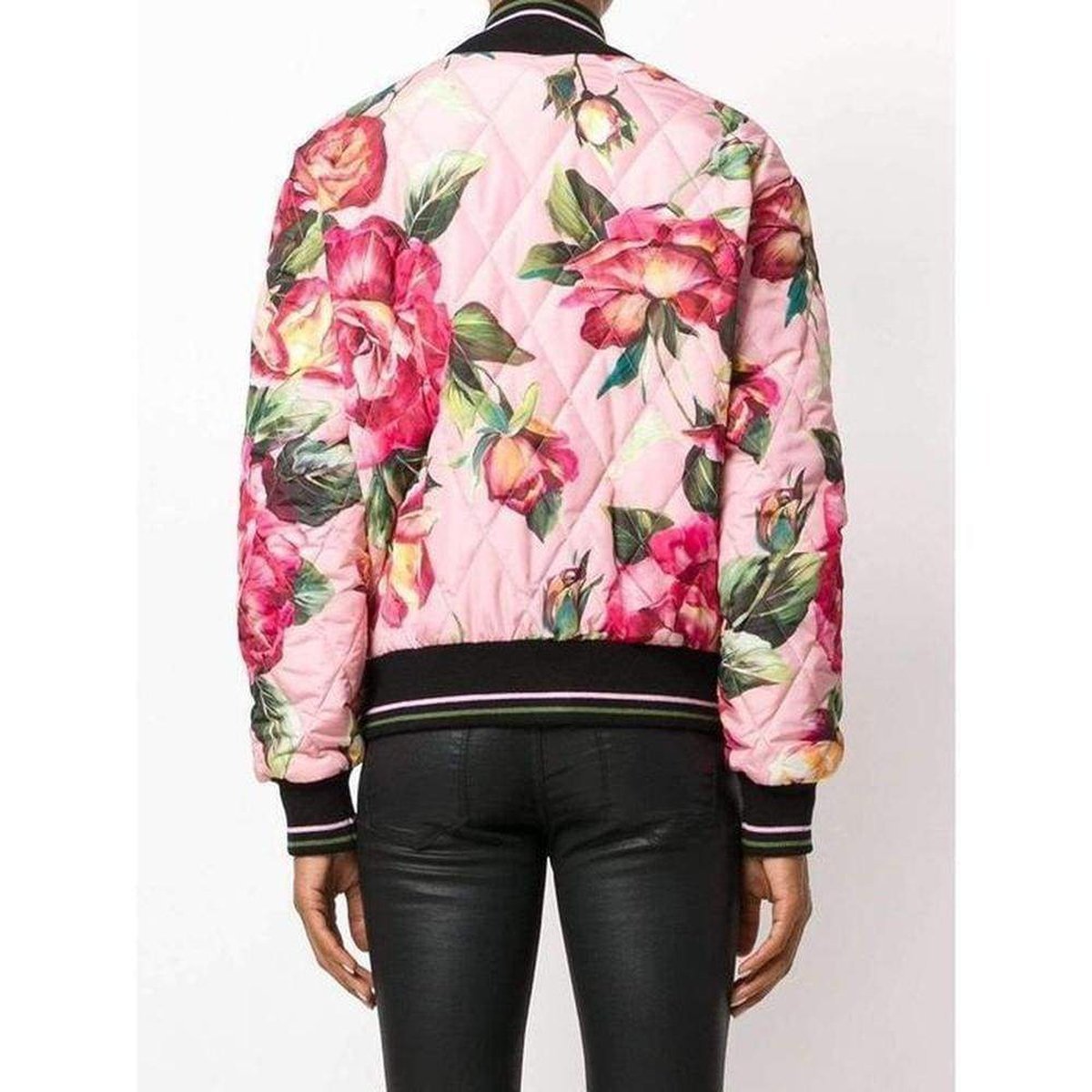 This rose print bomber jacket crafted in Italy is presented in a pretty baby pink and features a tonal pink and green rose print throughout the garment