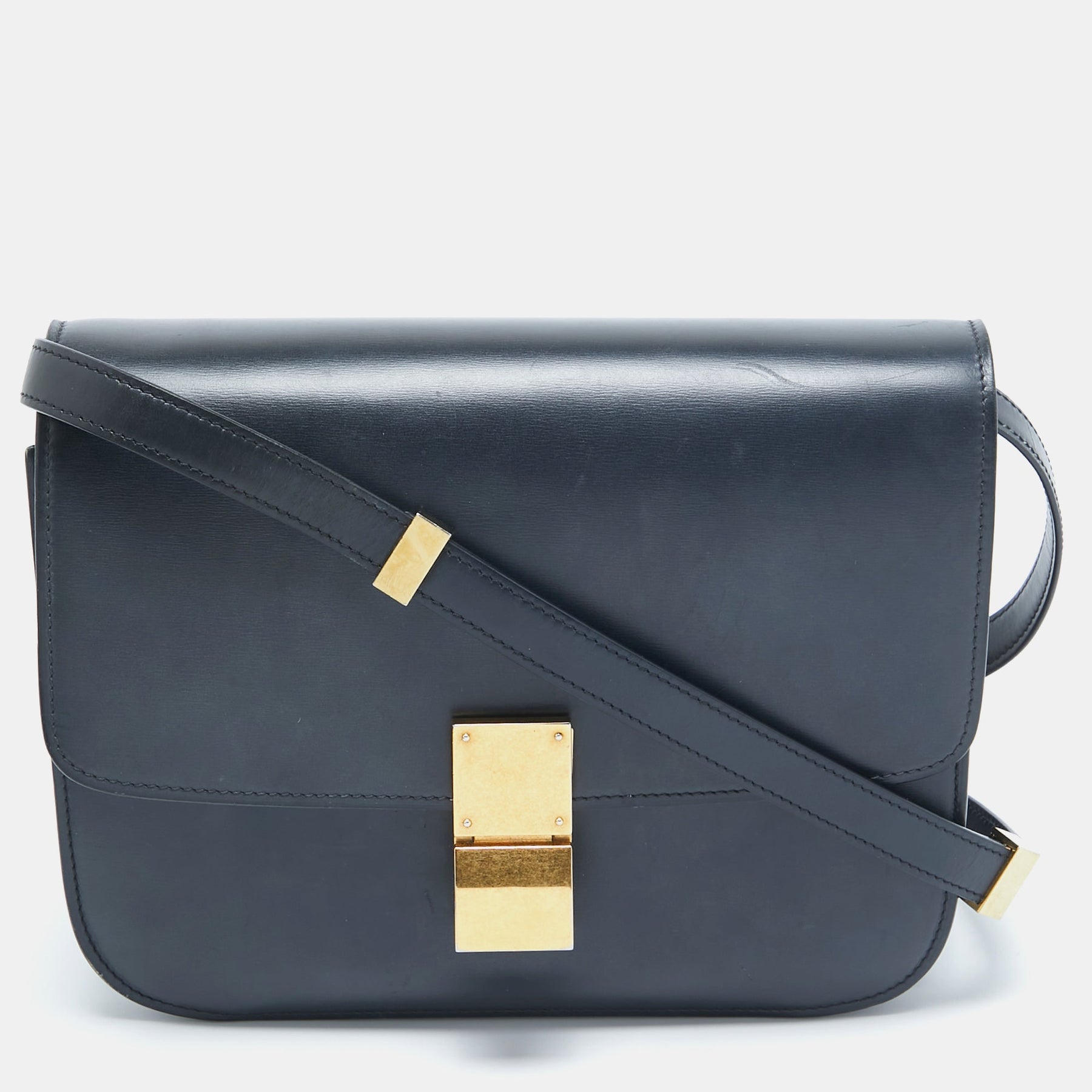 CELINE Navy Blue Leather Medium Classic Box Shoulder Bag