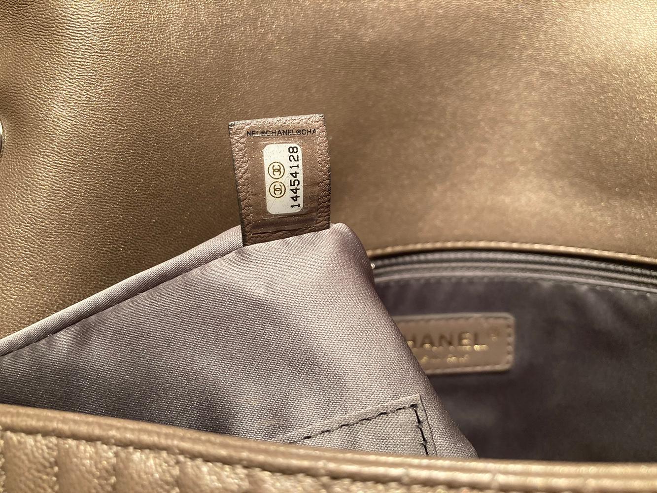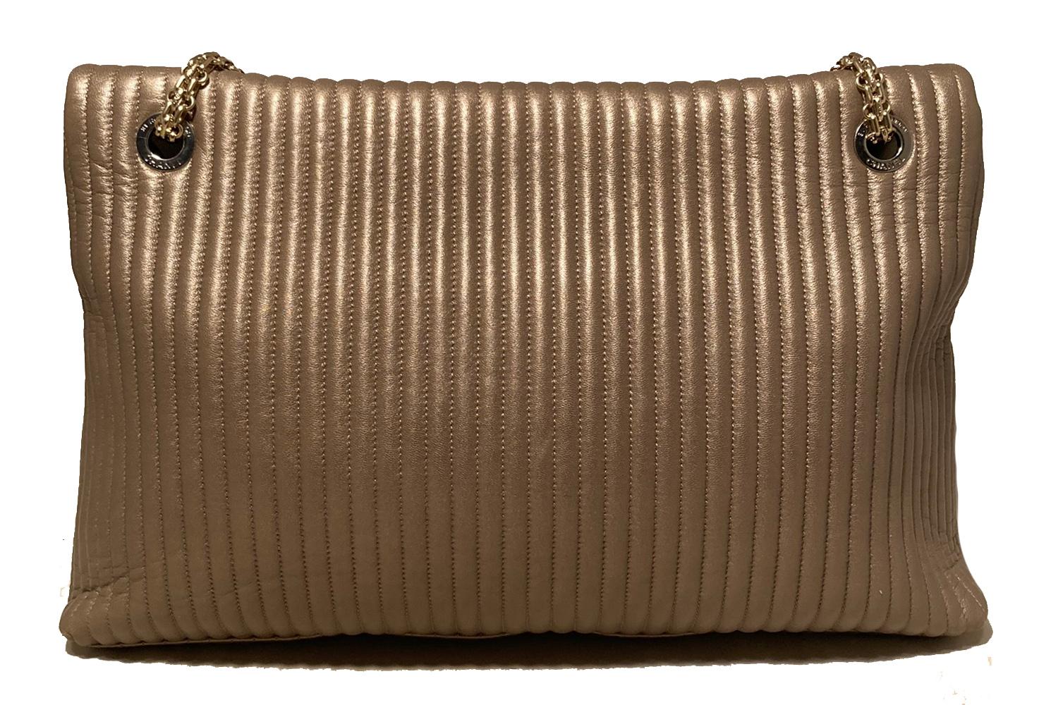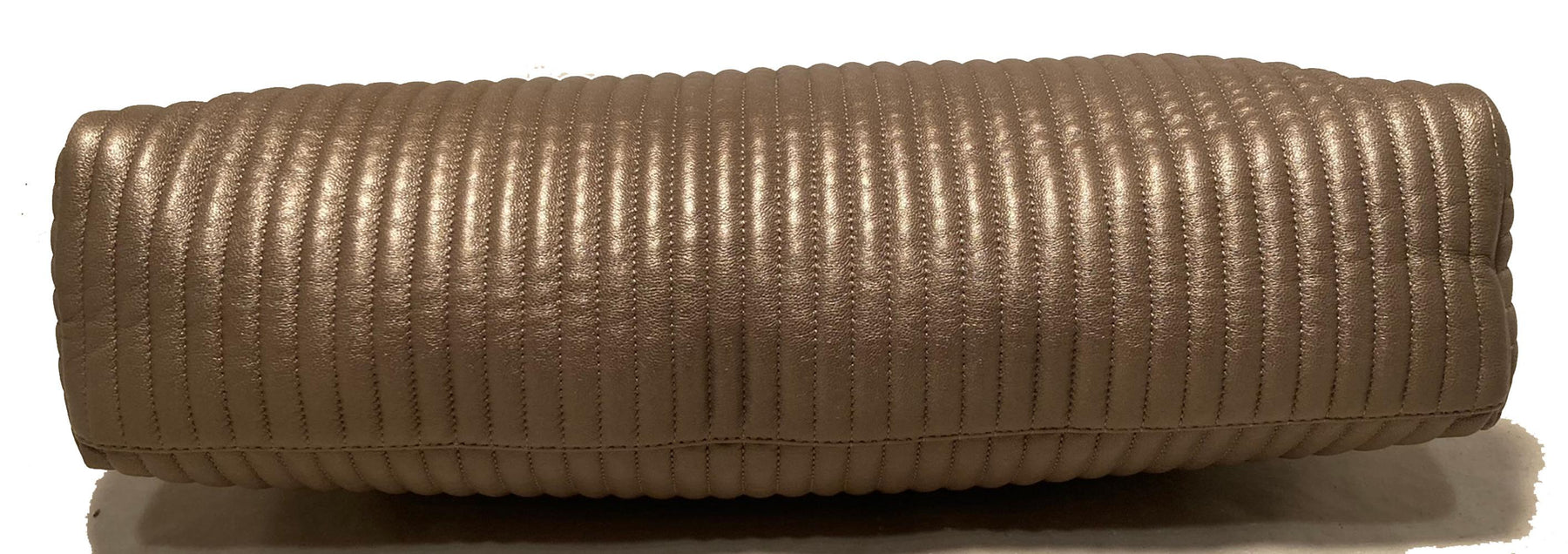 Beautiful metallic champagne gold leather exterior in unique vertical stripe quilted pattern with matte gold reissue chain shoulder strap.