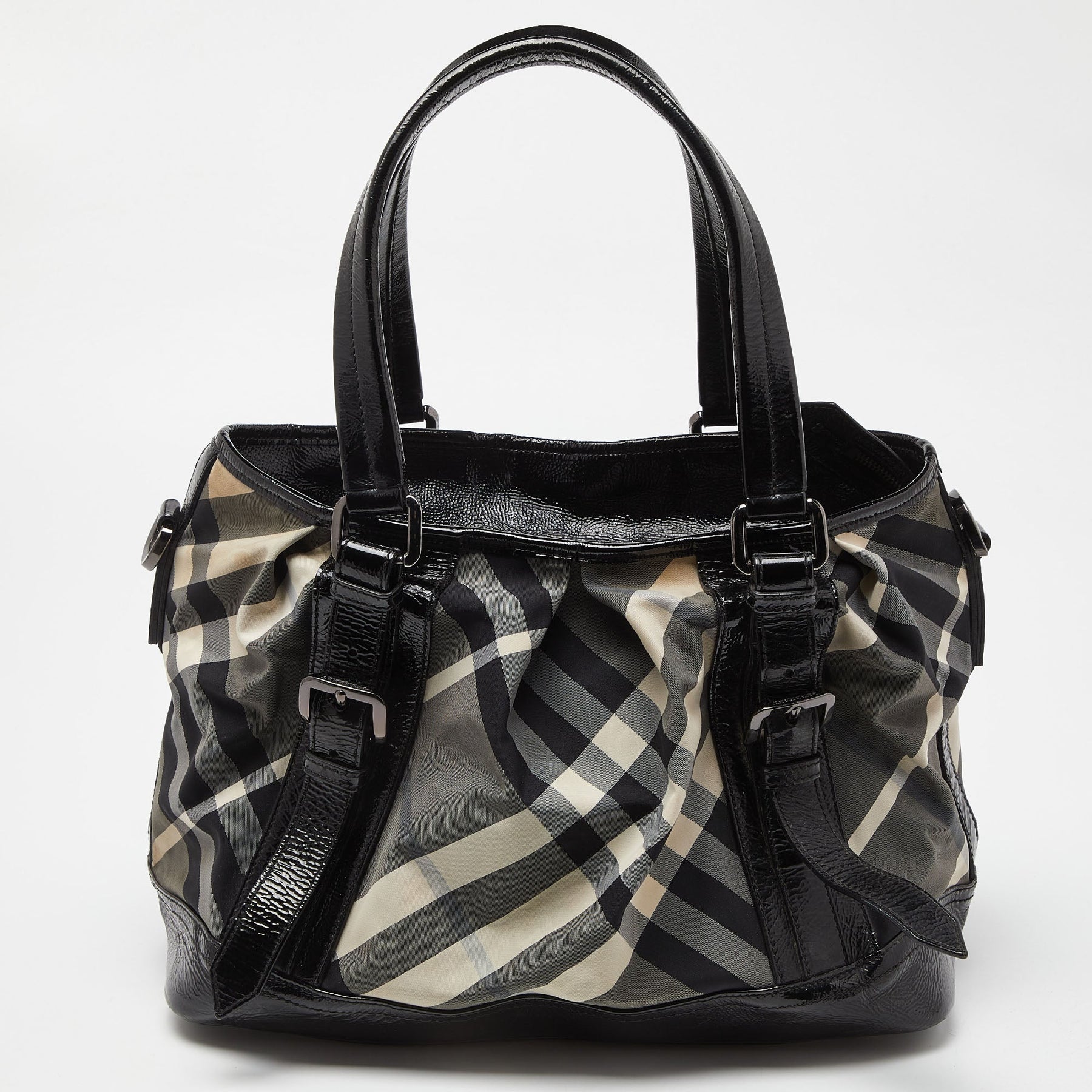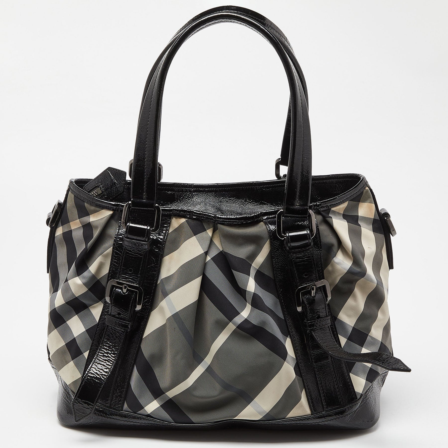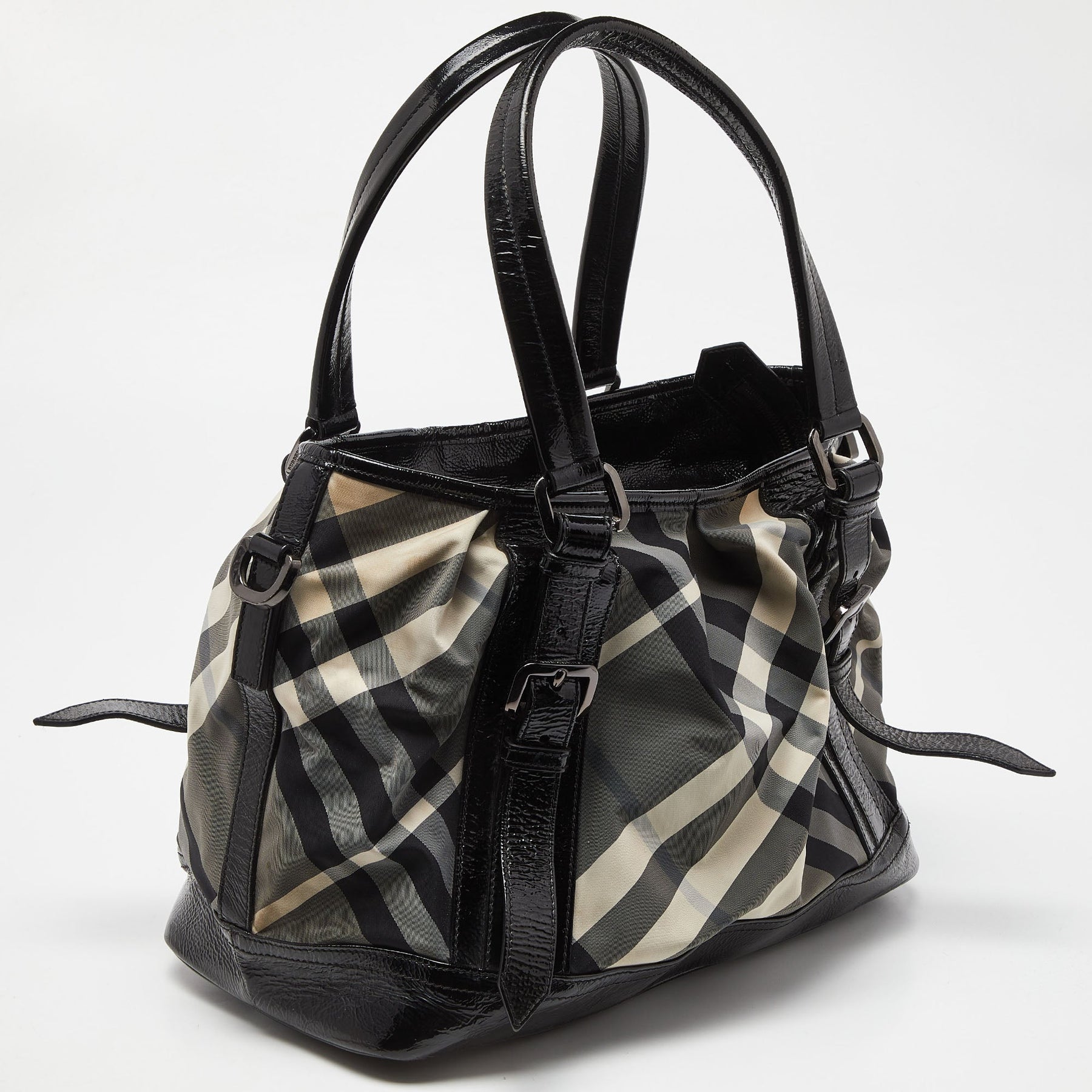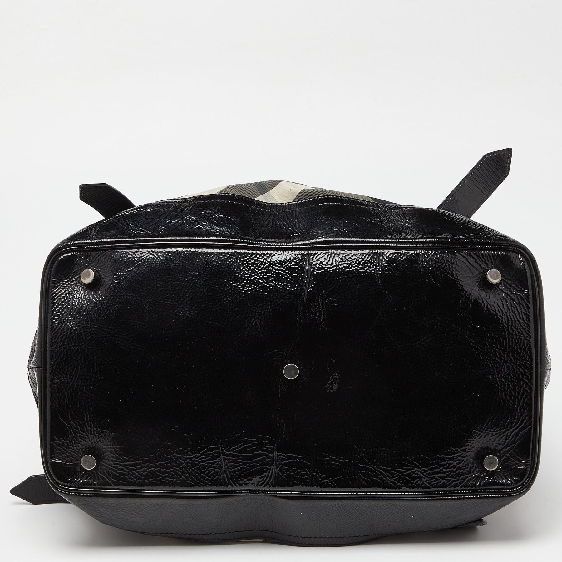 Top Quality Burberry Black/Grey Beat Check Canvas and Patent Leather Lowry Tote