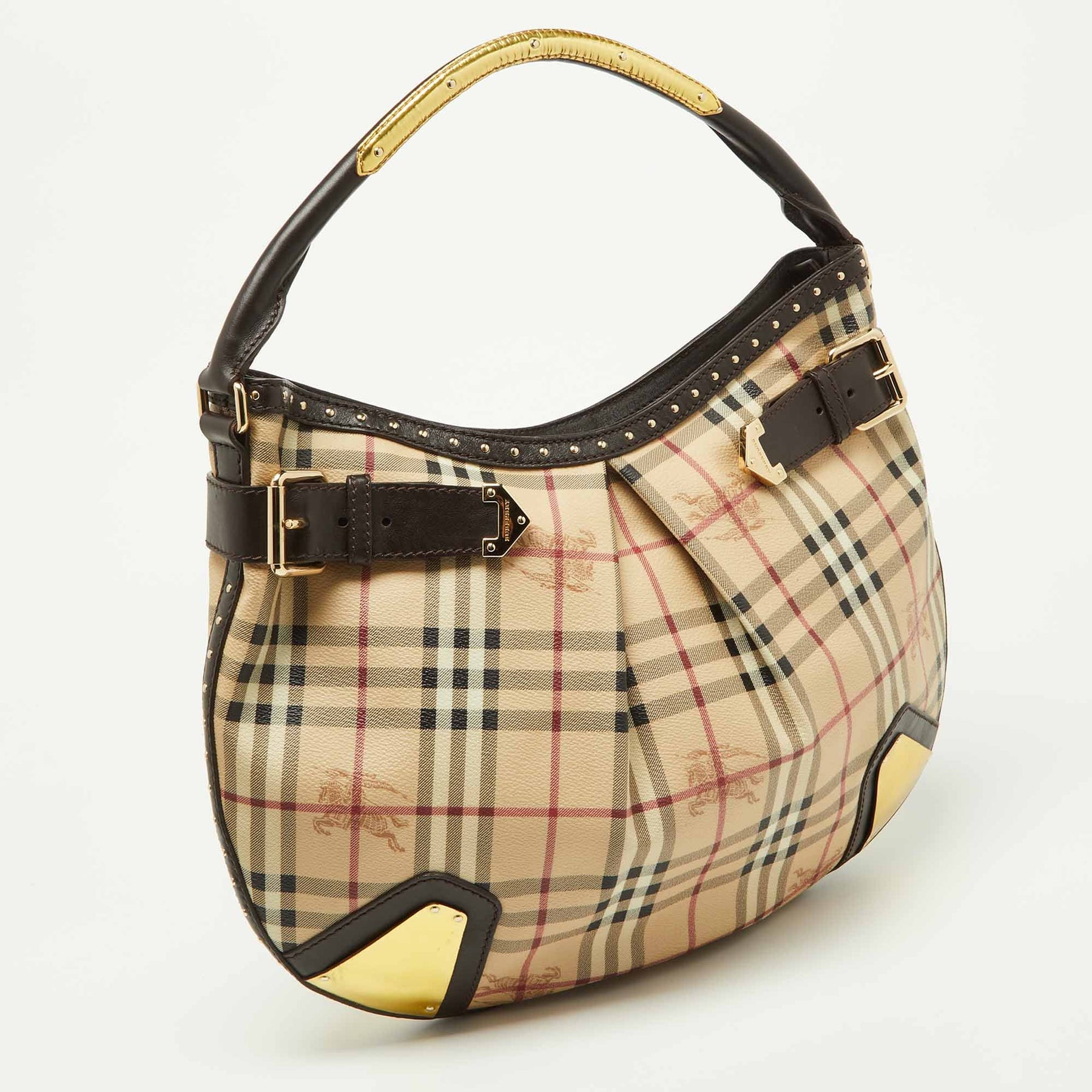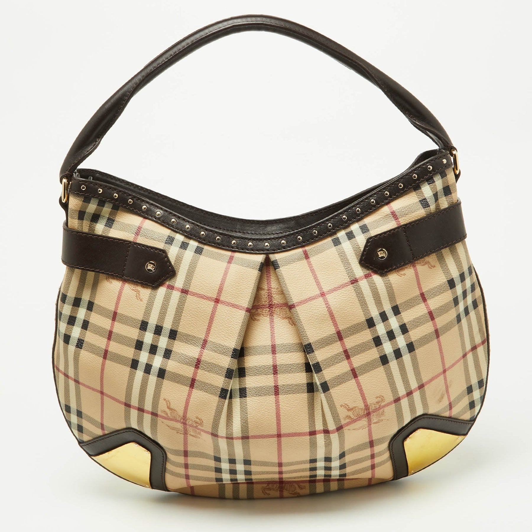 BURBERRY Dark Brown/Beige House Check PVC and Leather Studded Hartley Hobo