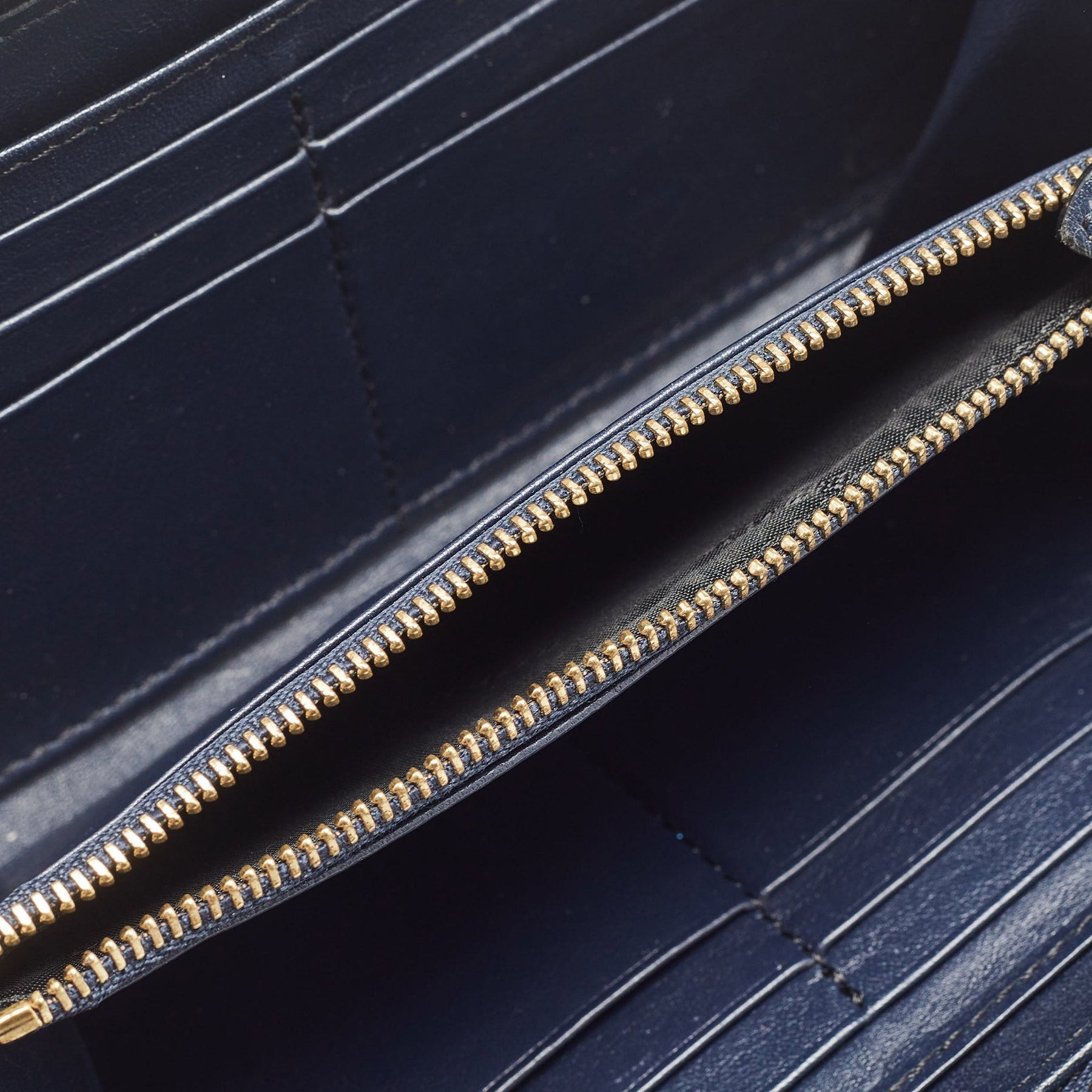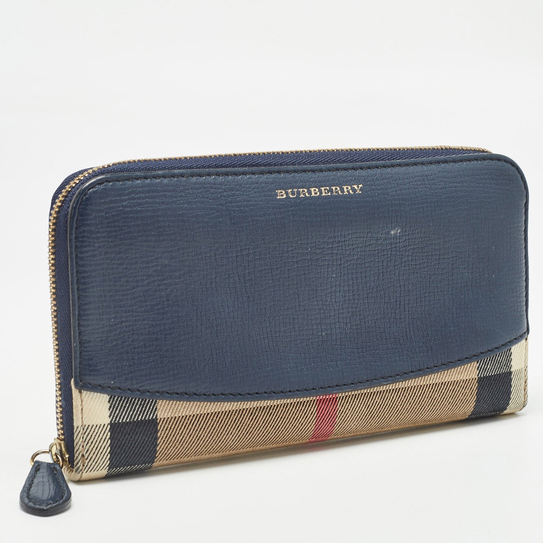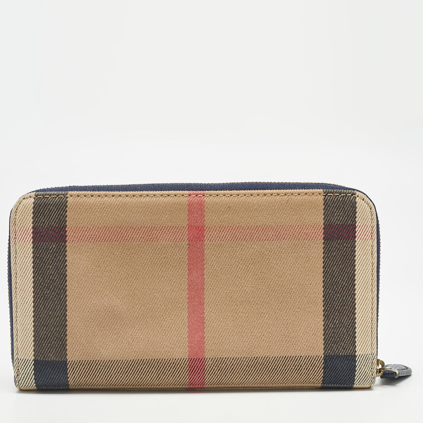 BURBERRY Navy Blue/Beige House Check Canvas and Leather Zip Continental Wallet