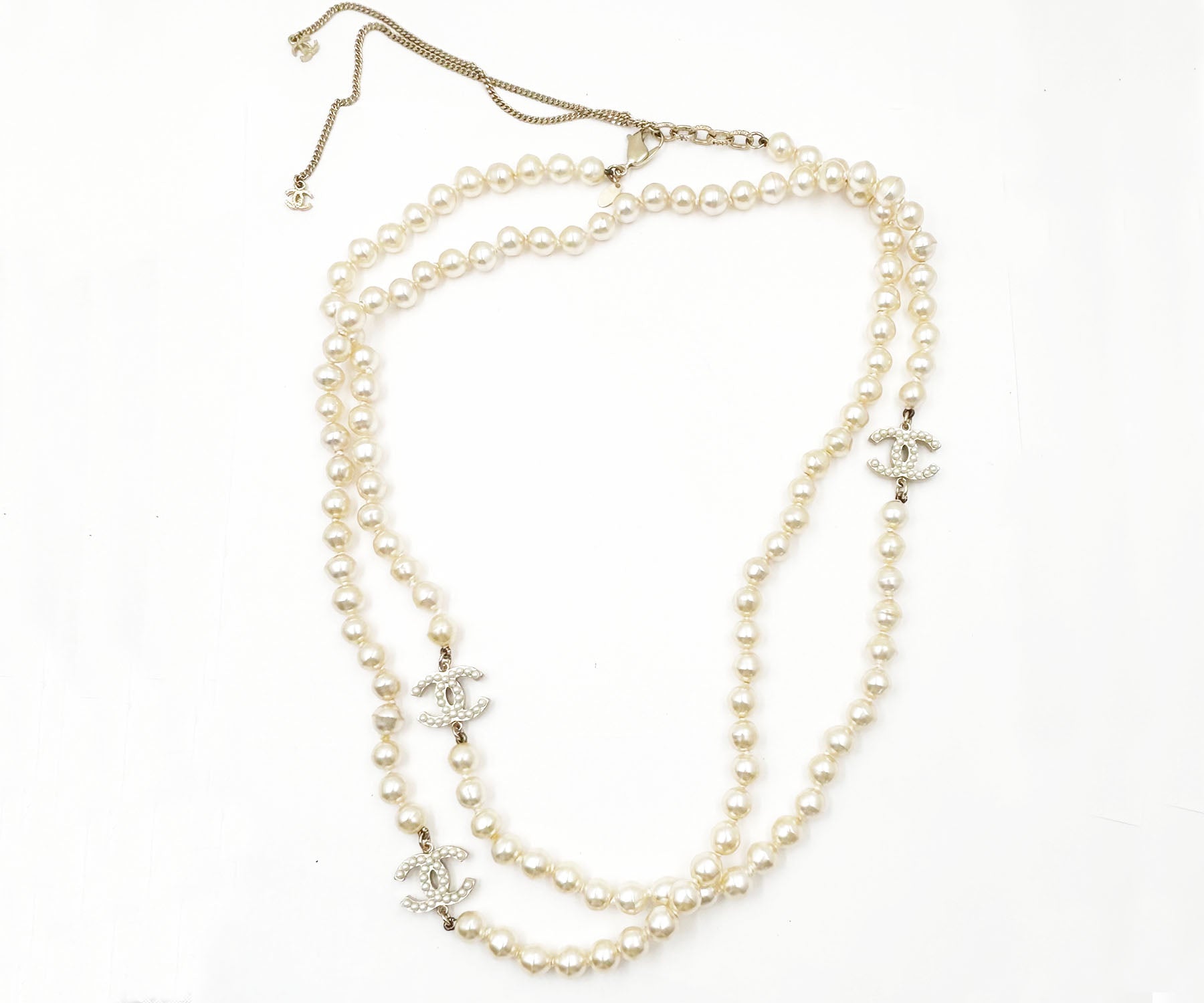 Chanel 3 Gold CC Pearl Faux Fresh Water Pearl Long Necklace.