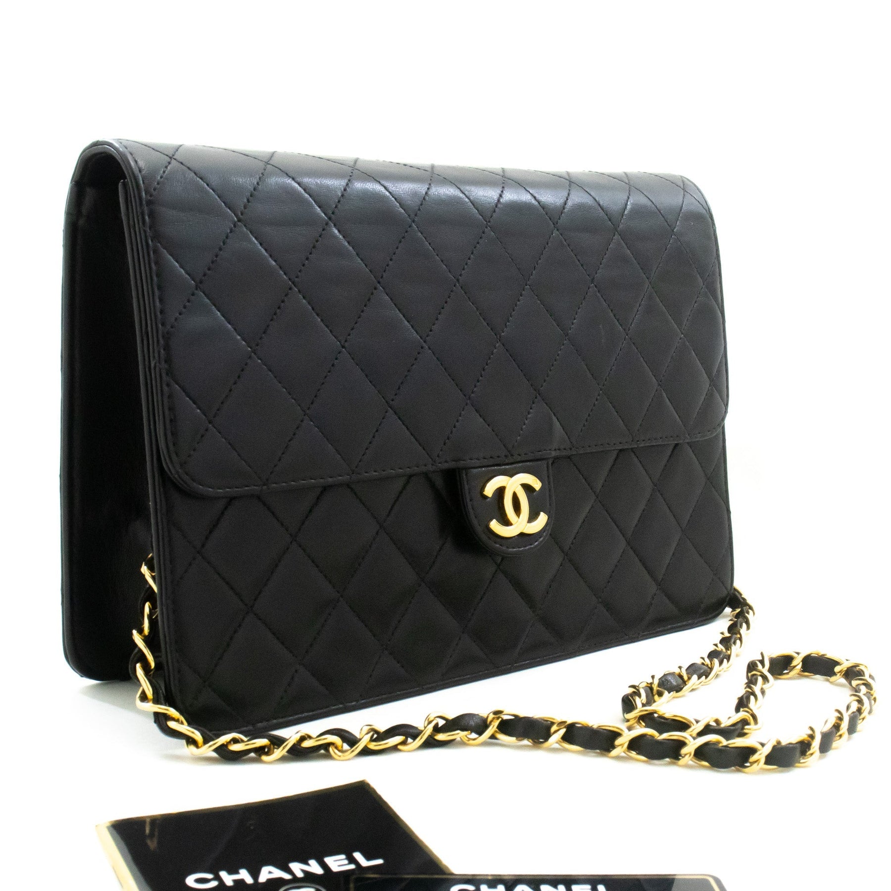 An CHANEL Chain Shoulder Bag Clutch Black Quilted New made of black Lambskin Purse.