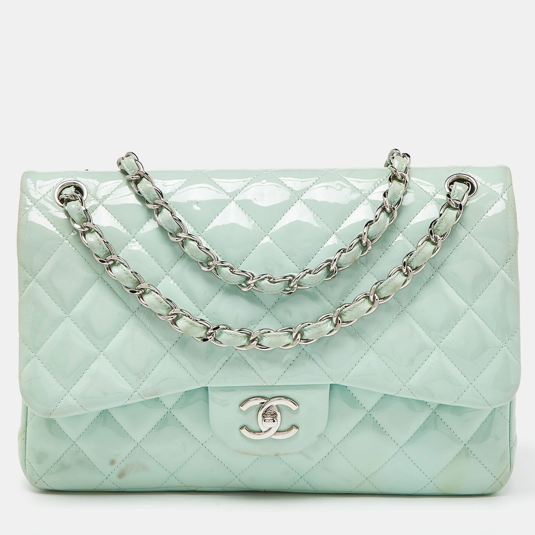CHANEL Green Quilted Patent Leather Jumbo Classic Double New Bag