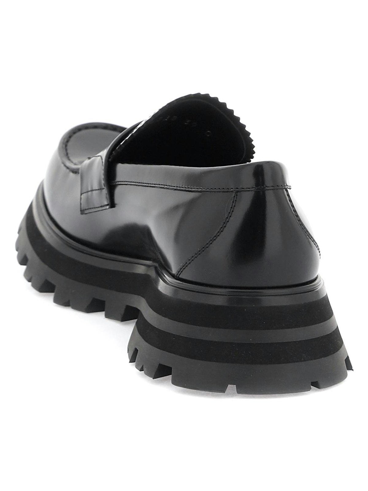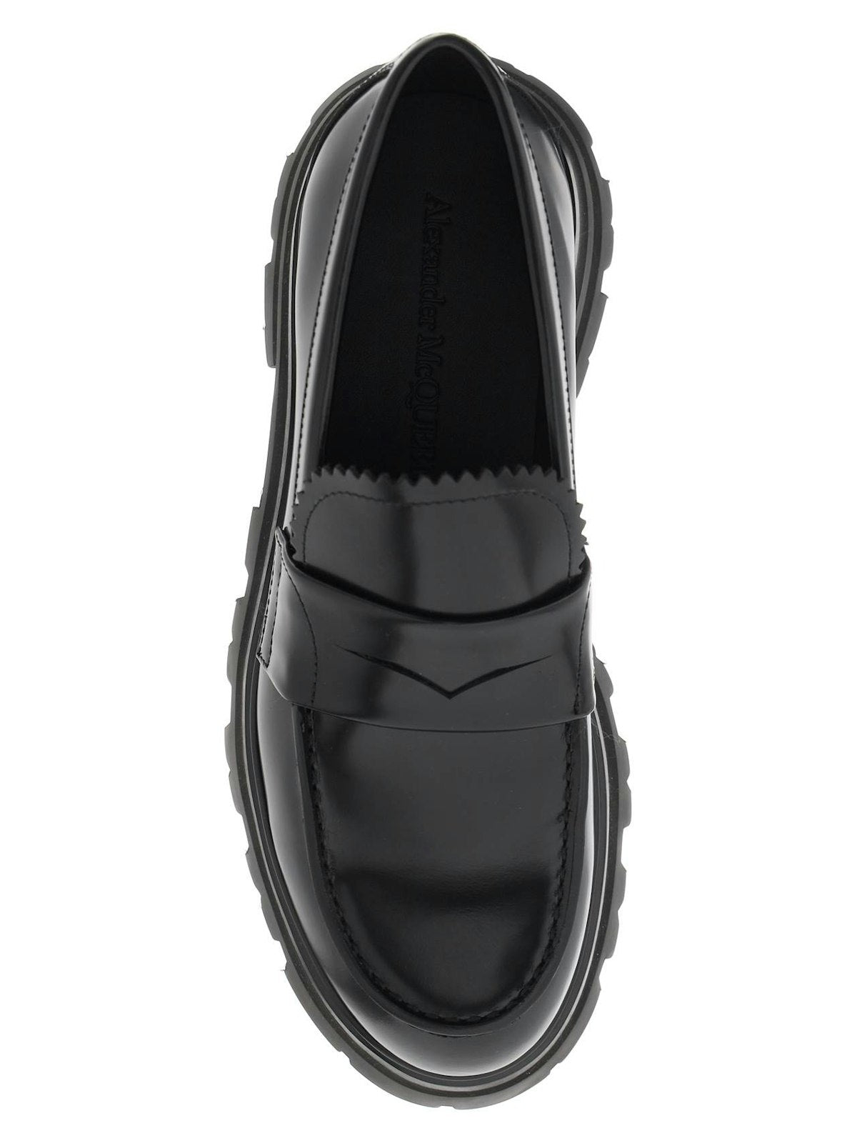 THESE ALEXANDER MCQUEEN WANDER LOAFERS ARE MADE OF BRUSHED LEATHER WITH AN OVERSIZED RUBBER SOLE AND FLARED TOOTHED EDGES. THEY FEATURE A ROUND TOE, A TOOTHED TONGUE, AND A LEATHER INTERIOR.