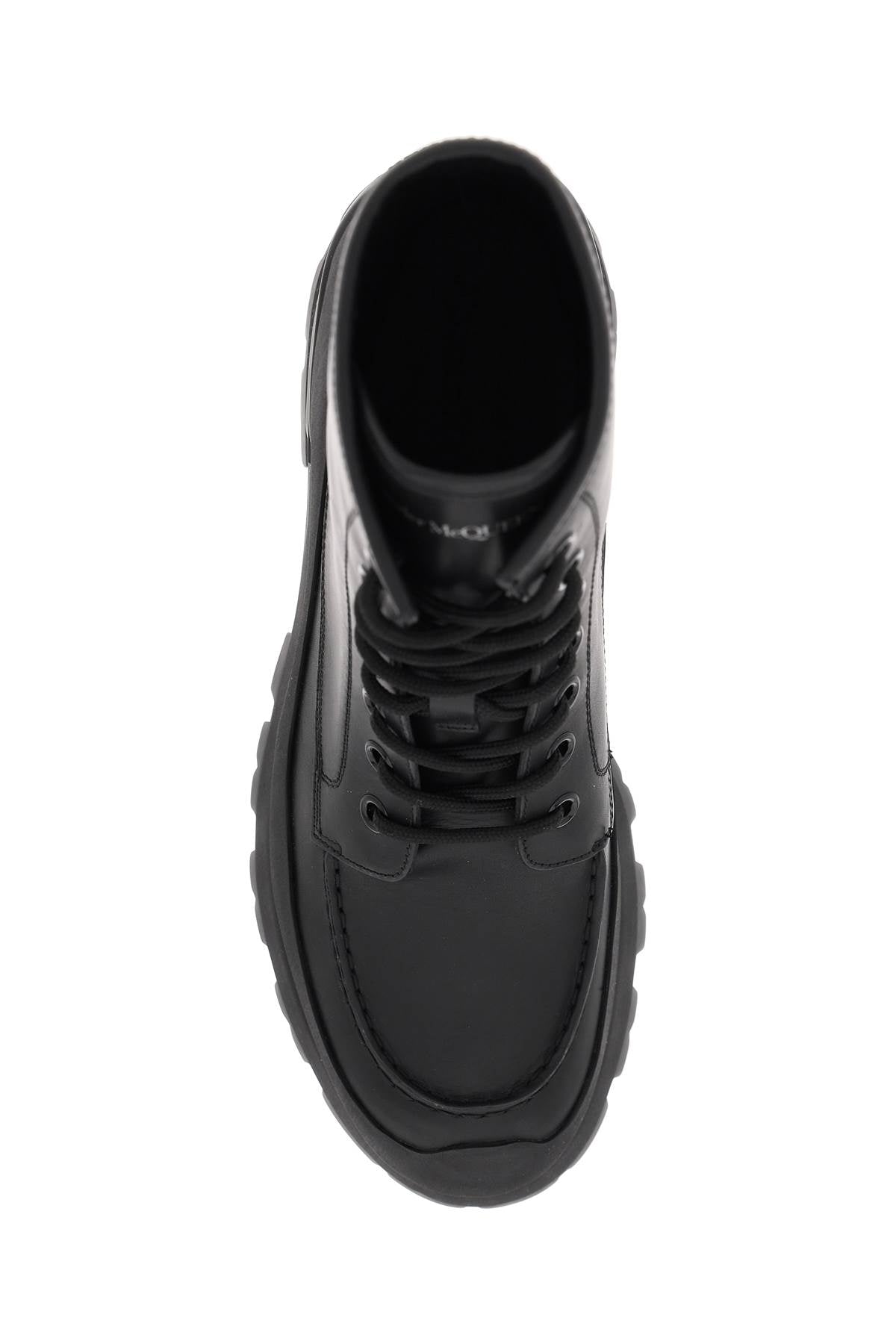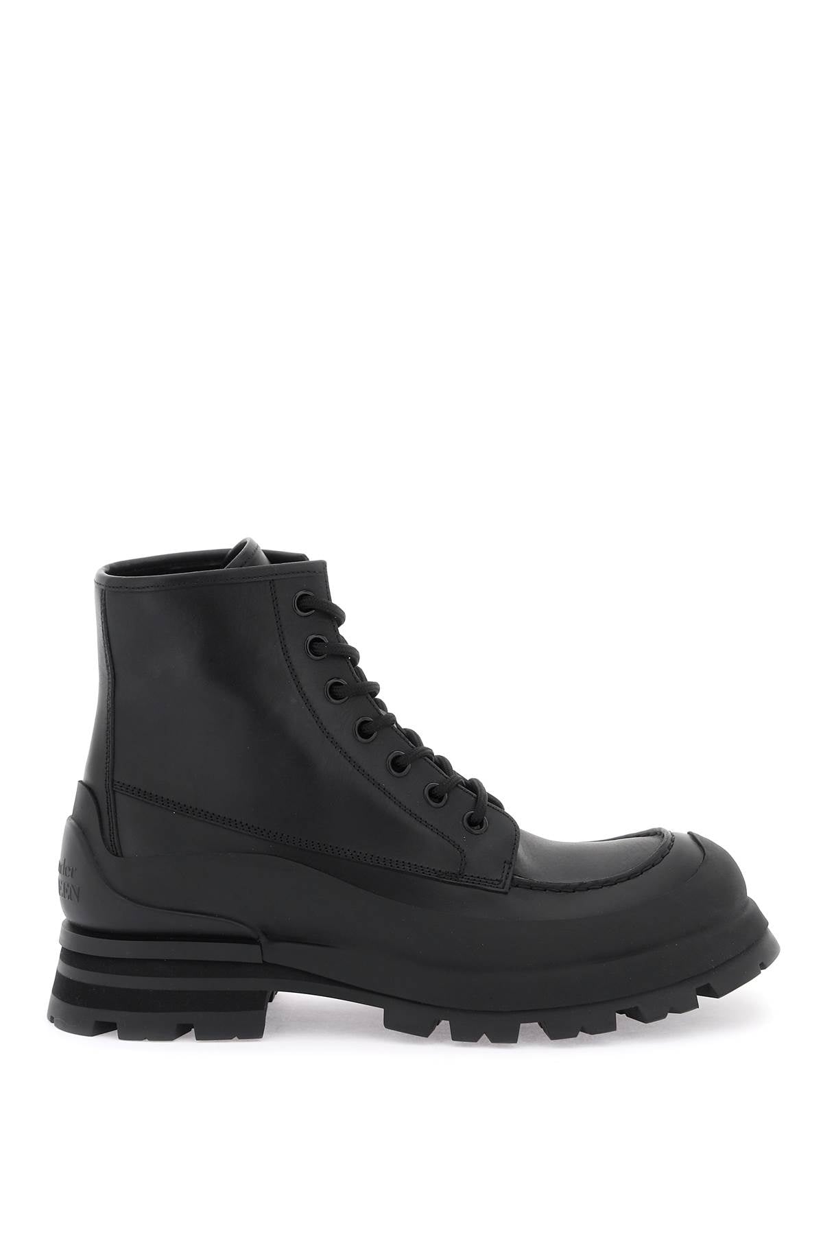 Elevate your style with these luxurious leather ankle boots. Crafted with smooth leather and a rubber coating, these boots feature an oversized rubber lug sole for a bold and edgy look. The ALEXANDER MCQUEEN lettering logo is printed on the tongue and embossed on the heel, adding a touch of designer flair. Complete with a lace-up front closure, enameled metal eyelets, and a leather interior, these boots are the epitome of high-end fashion. Plus, they come with extra laces for added versatility.