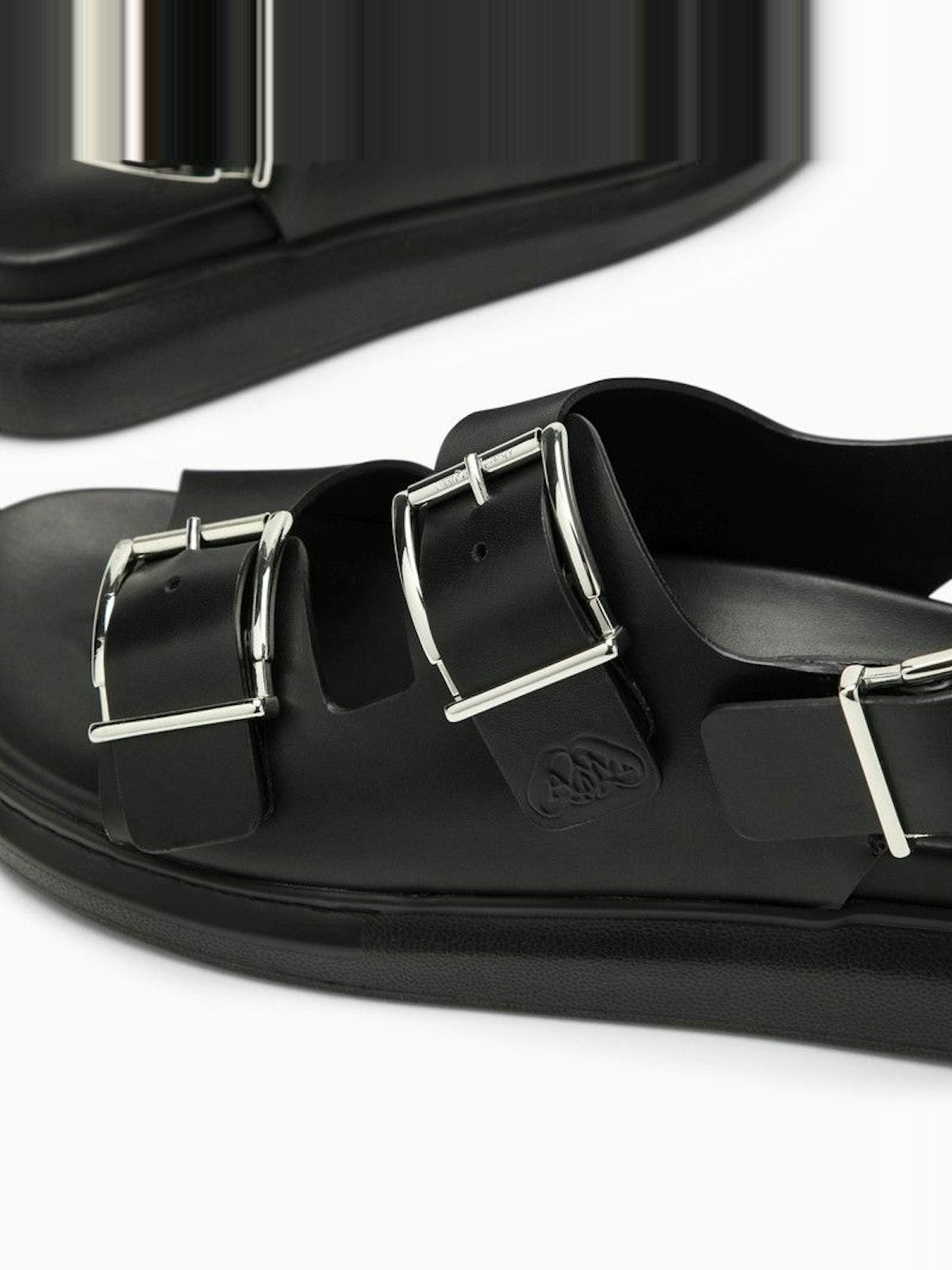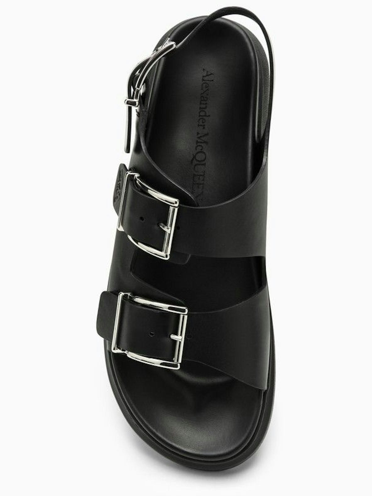 BLACK LEATHER SLIDE SANDAL BY , ADJUSTABLE VIA BACK STRAP WITH BUCKLE, FRONT STRAPS WITH EMBOSSED LOGO AND RUBBER SOLE.