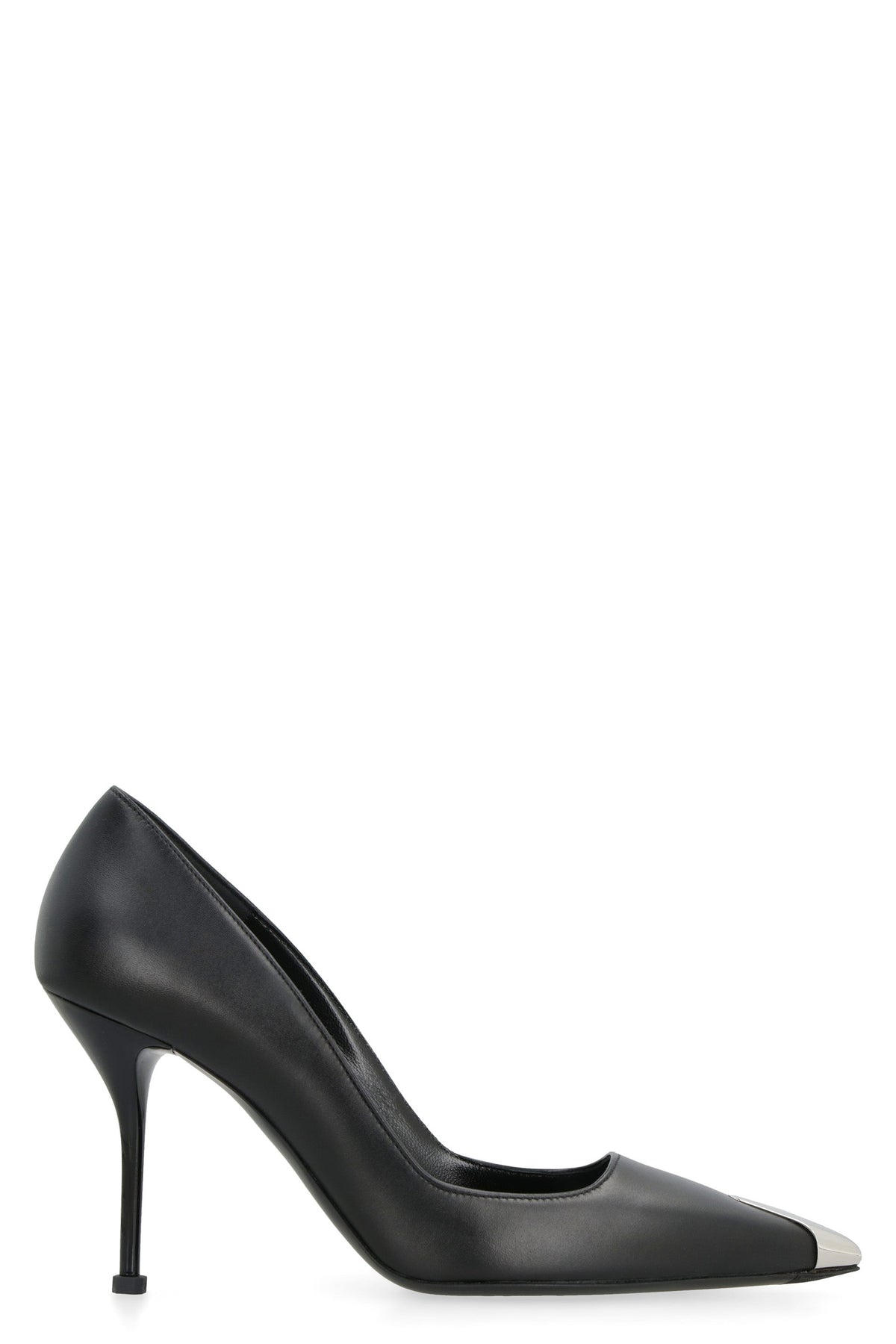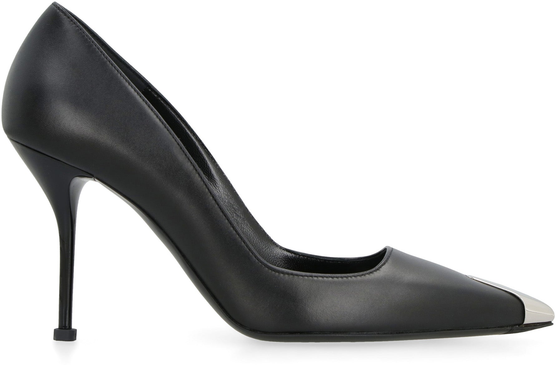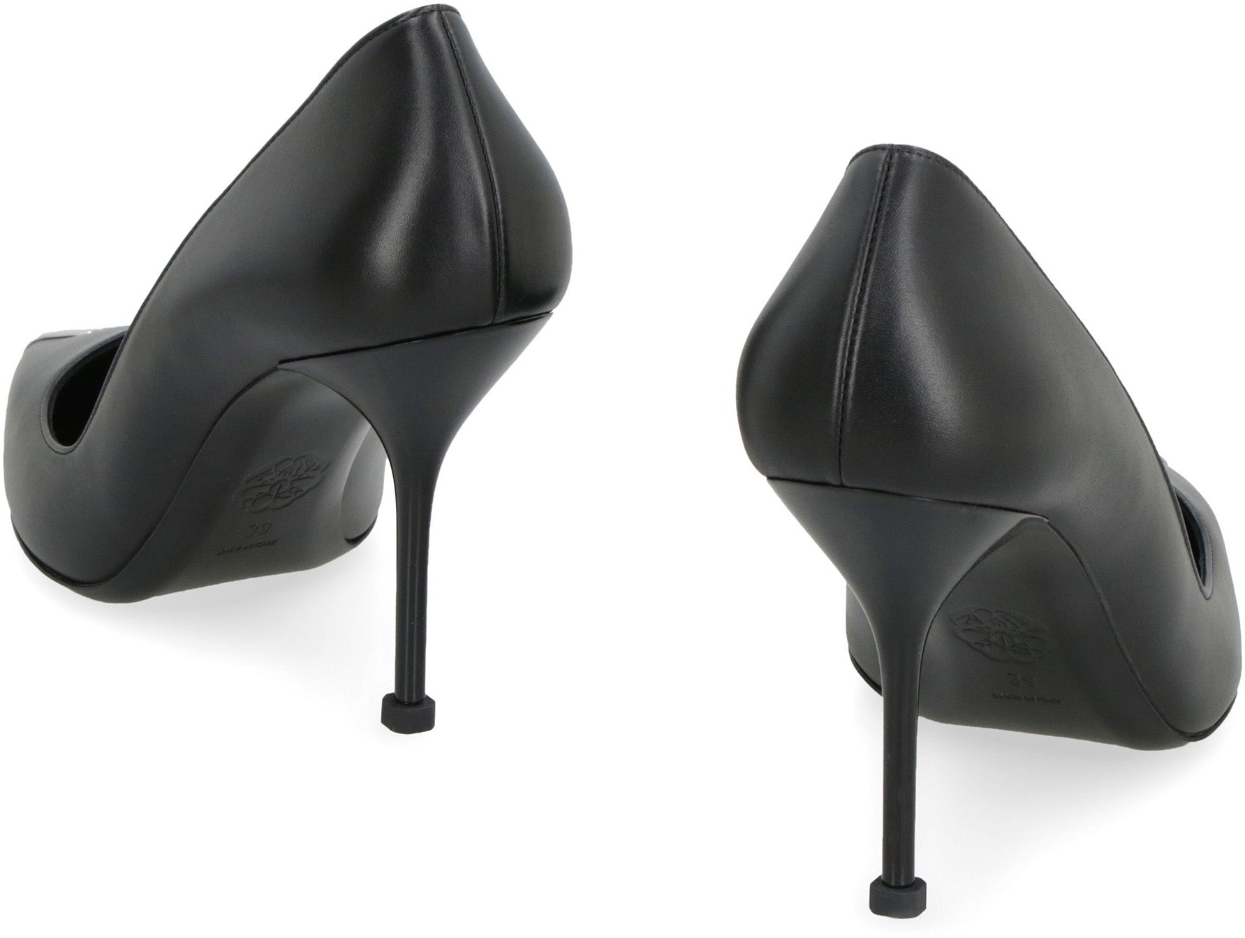 Step out in style and make a bold statement with these Punk Leather Pumps. Crafted from smooth calfskin, these pumps exude luxury and sophistication. The silver-tone metal detail and pointy toe add a touch of edginess, while the stiletto heel elevates your look to new heights. Whether you're pairing them with your favorite little black dress or adding a chic touch to a casual outfit, these pumps are sure to turn heads and make you feel confident and stylish.