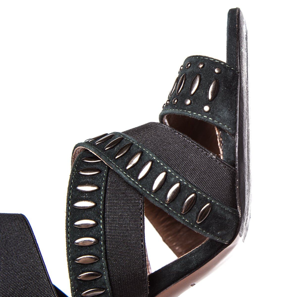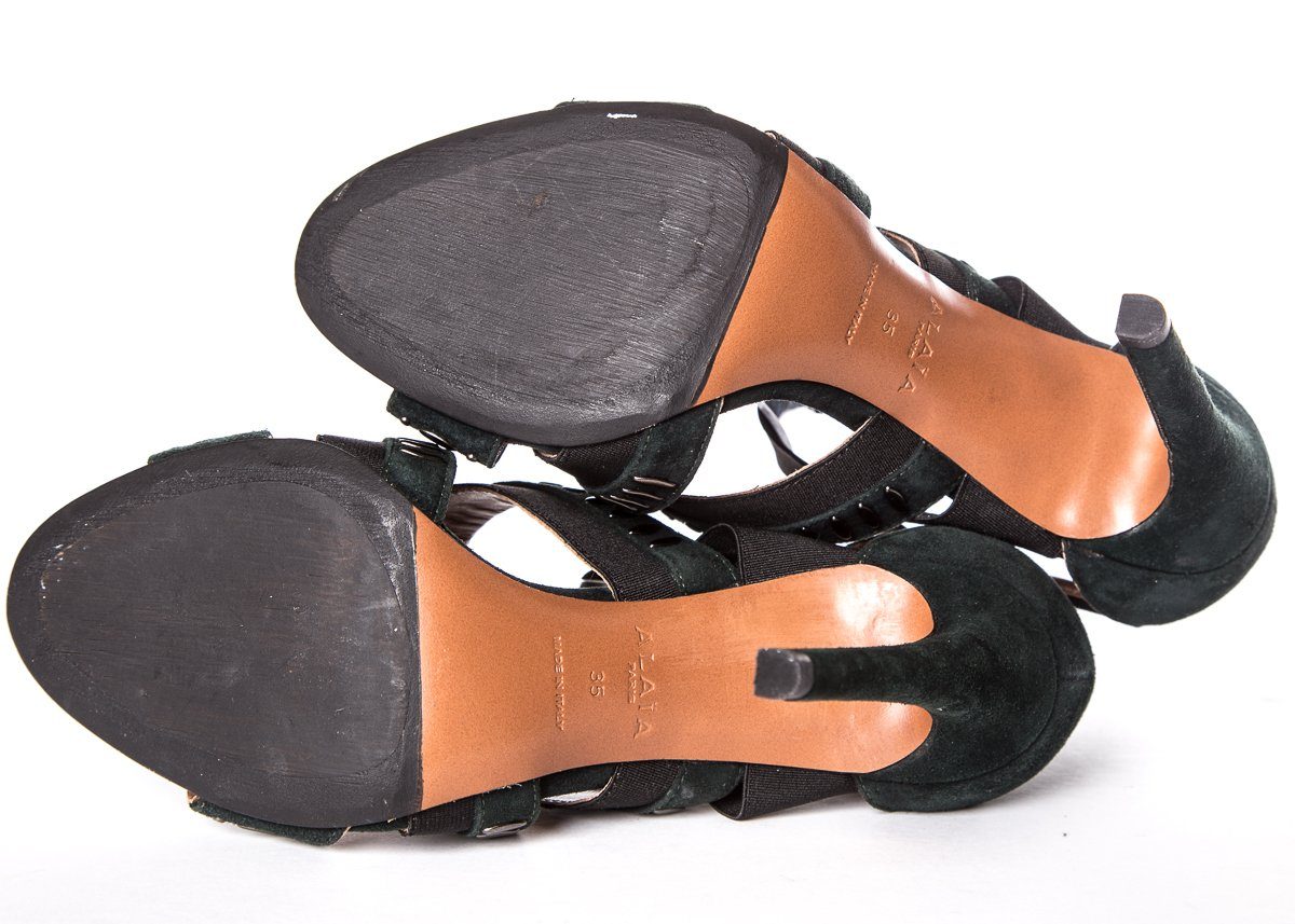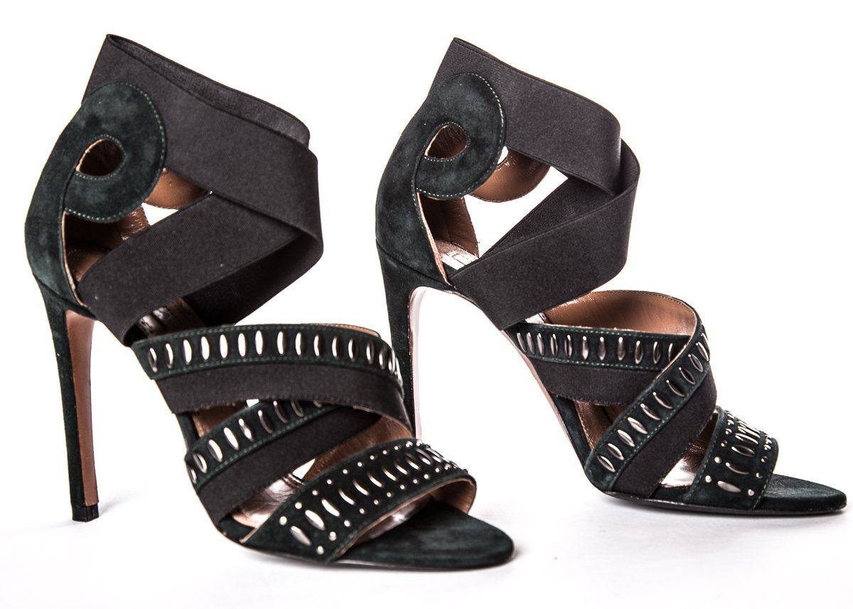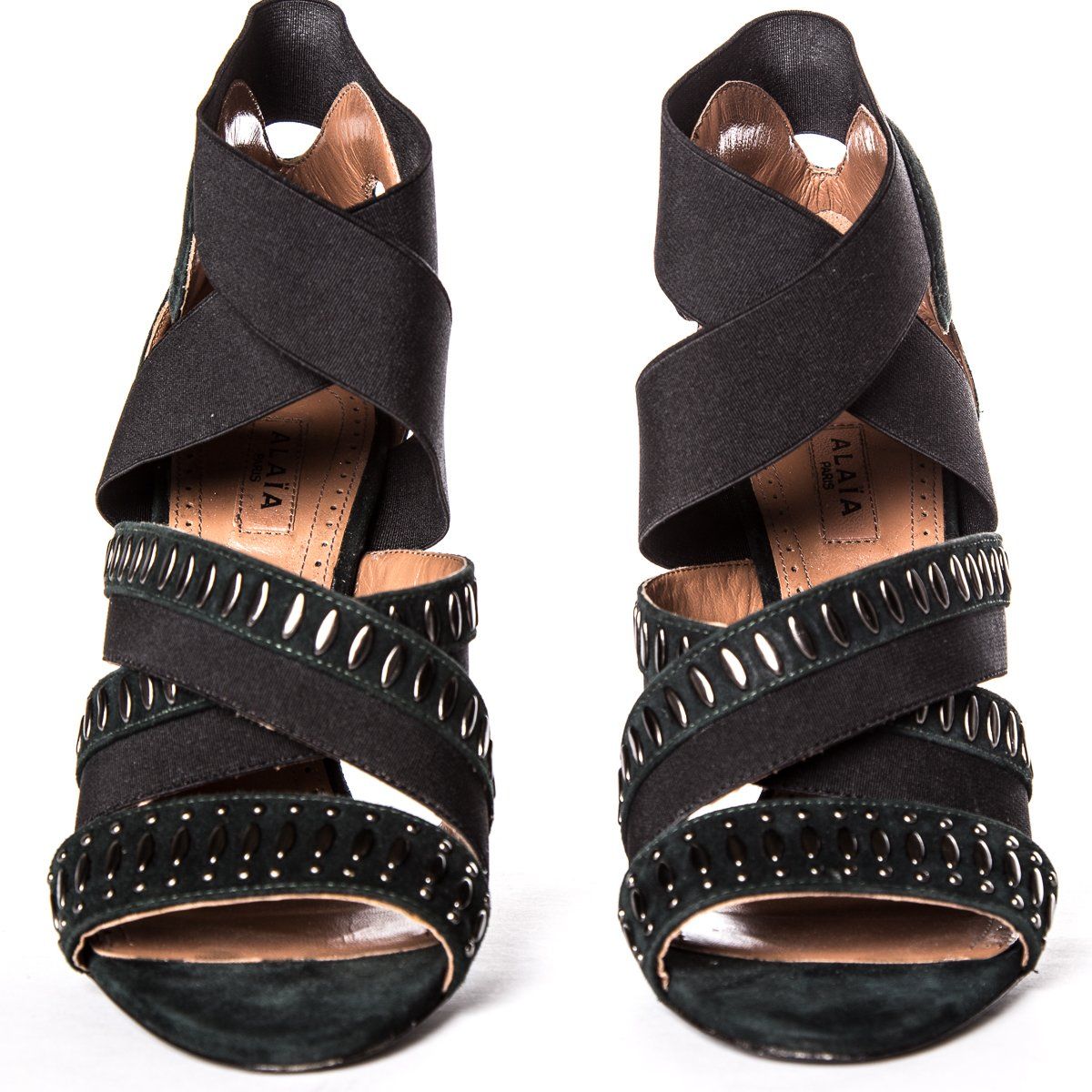Alaïa sandals with elasticized crossover straps at uppers featuring silver-tone stud embellishments, tonal stitching, cutouts at counters and covered heels.