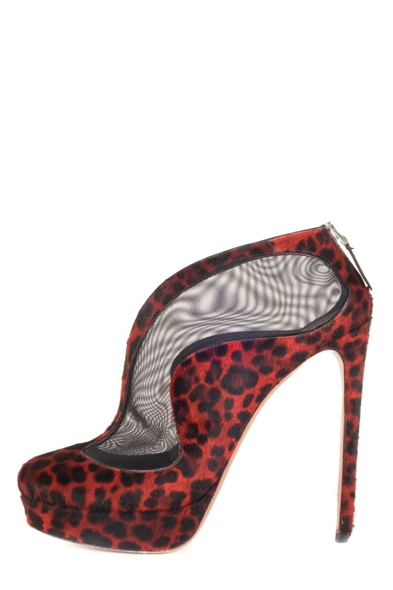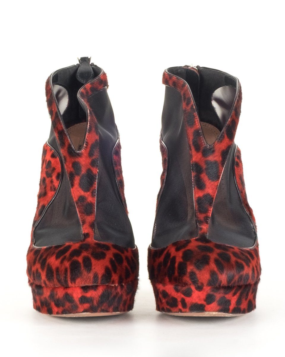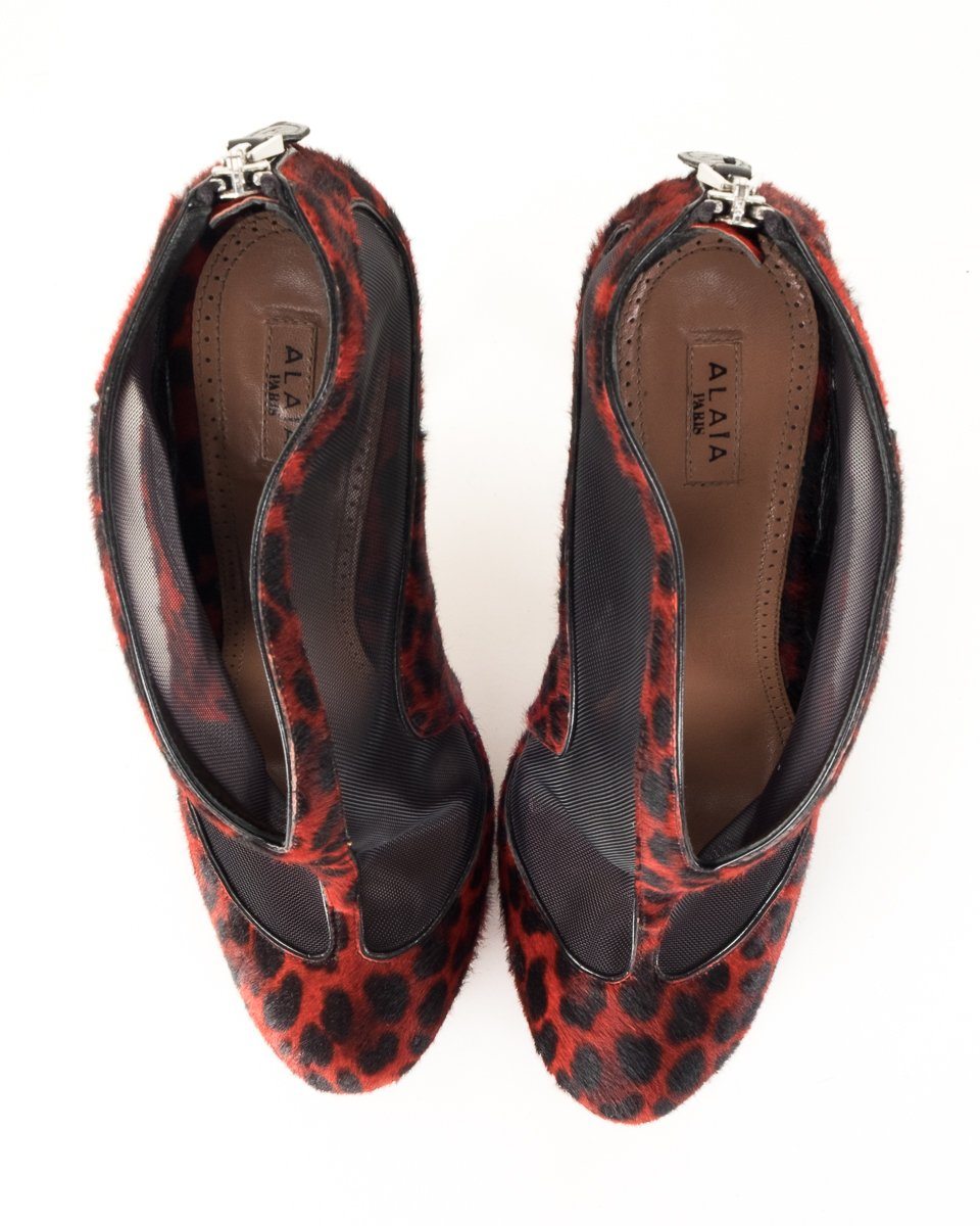 Alaia red and black leopard print pony hair round toe ankle boos with mesh panels, tonal stitching, black leather trim throughout, silver-tone exposed zip closure at counter, and covered platform and heel. This item has previously been . Scuffing on the soles.