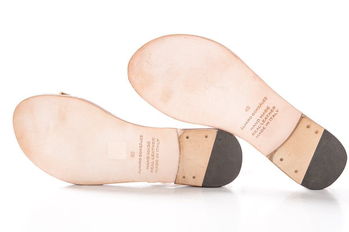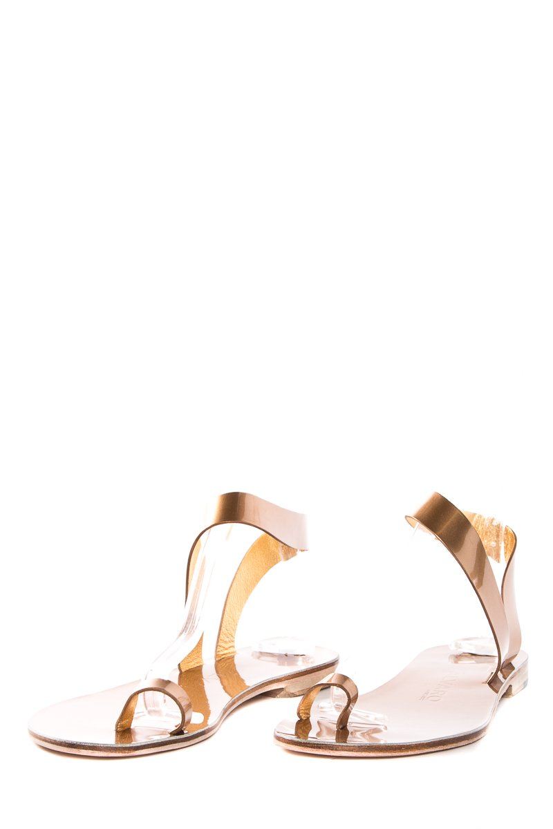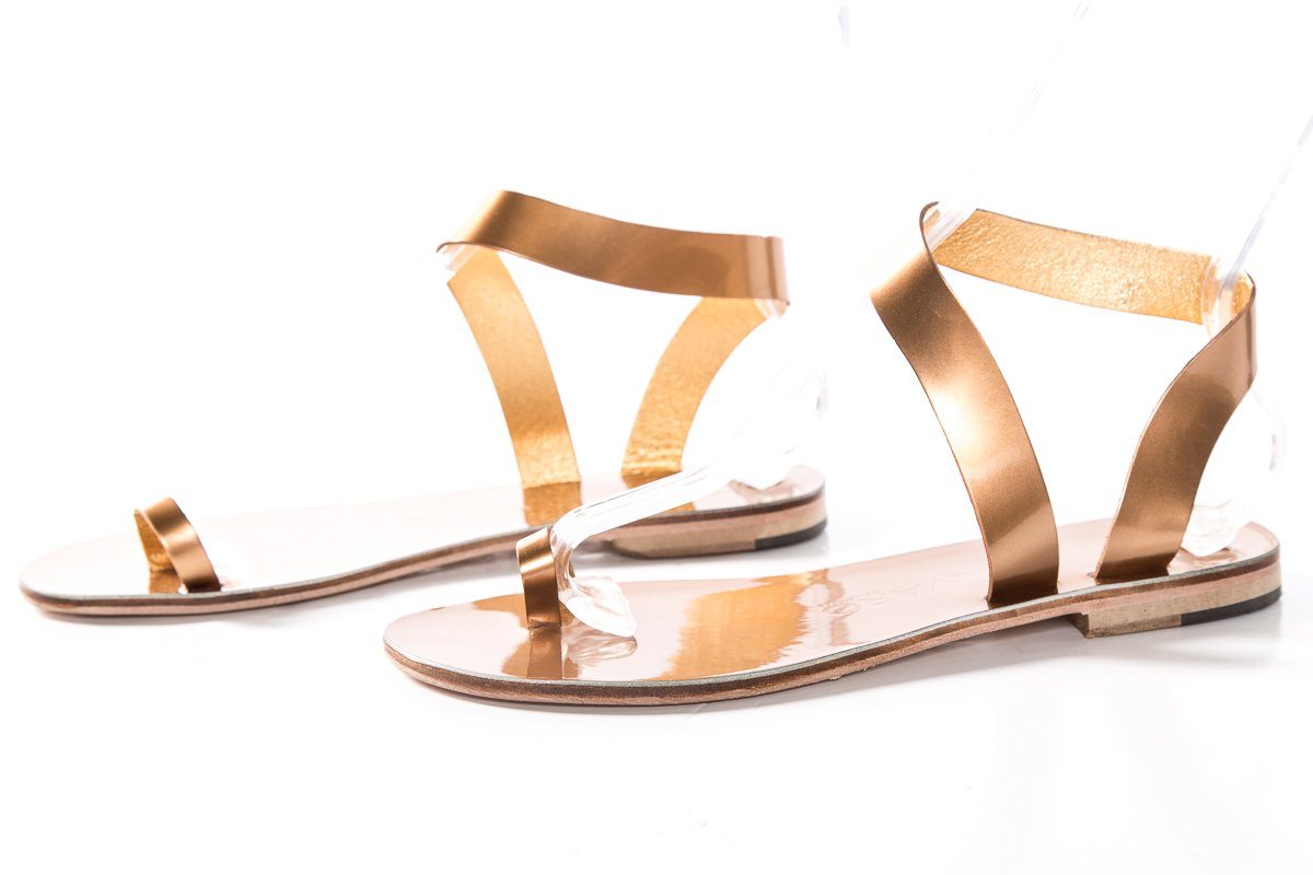 Álvaro González bronze metallic leather Angela flat sandal with stacked heels. This item is in very good condition with box and dust bag included, but does contain some light scratching to soles.