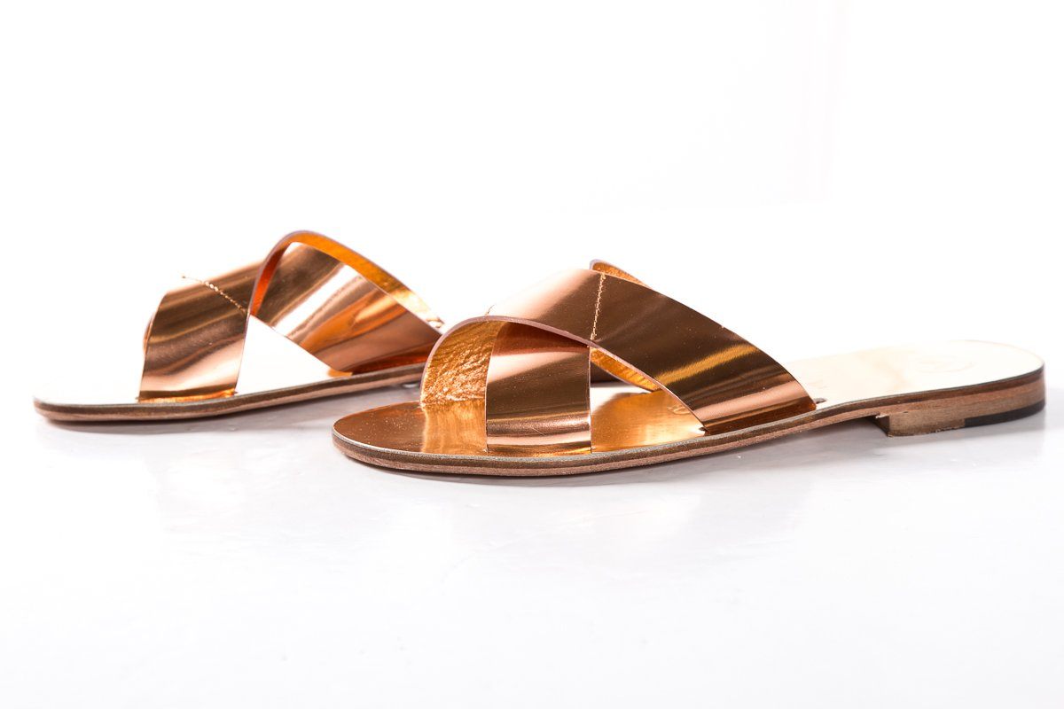 Alvaro Gonzalez rose gold metallic leather Antonia slide sandal with tonal stitching and stacked heels.