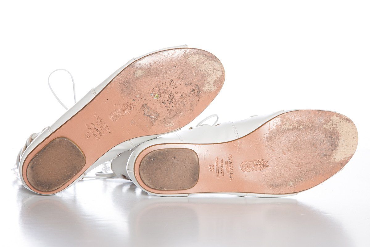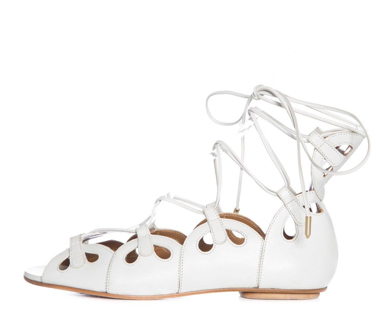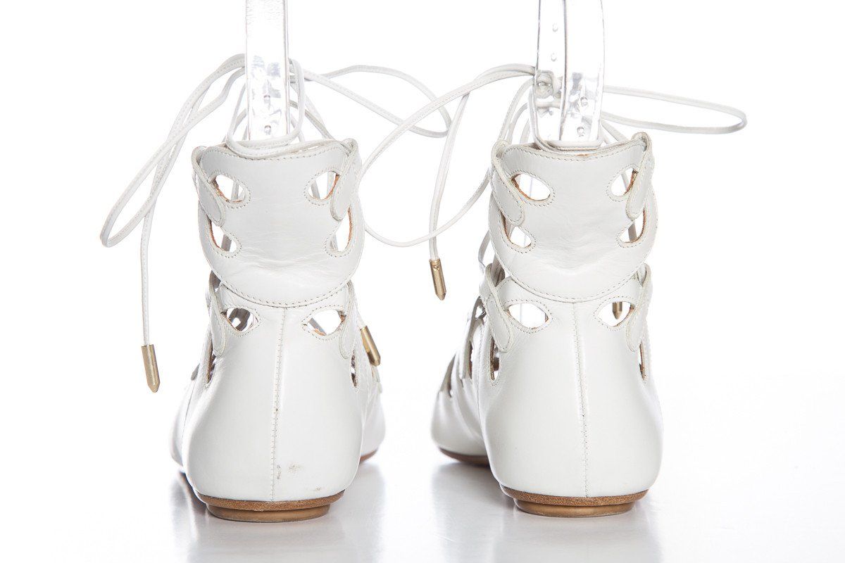 White Leather Aquazzura Peep-Toe Flats With Covered Heels And Lace-Up Closure At Ankles