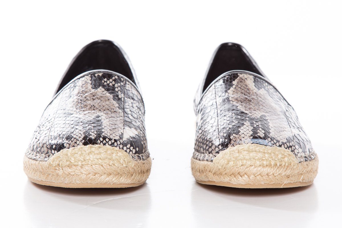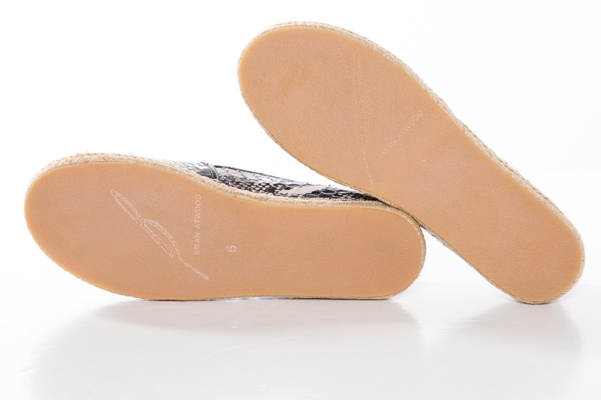 B Brian Atwood printed snake flat espadrille with leather trim, tonal stitching and rubber sole.